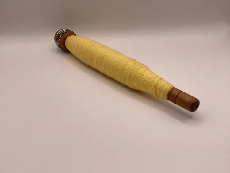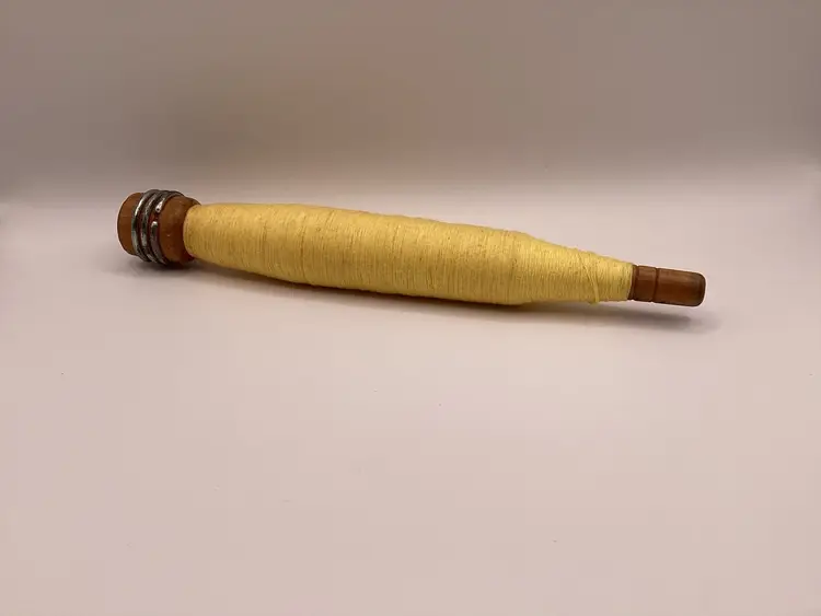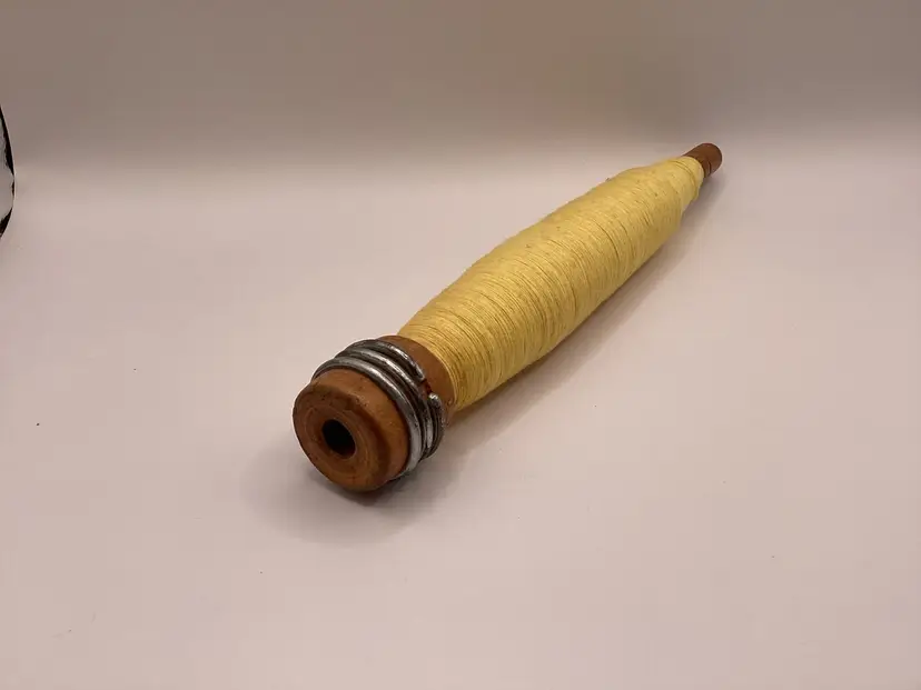 Features: Metal rings still present Material: Wood / Metal Color: Yellow thread Measurements: Height - 8 & 3/4” Width - 1 & 1/4”