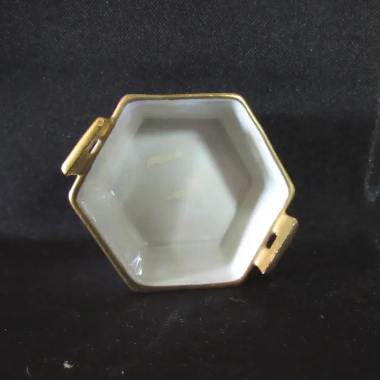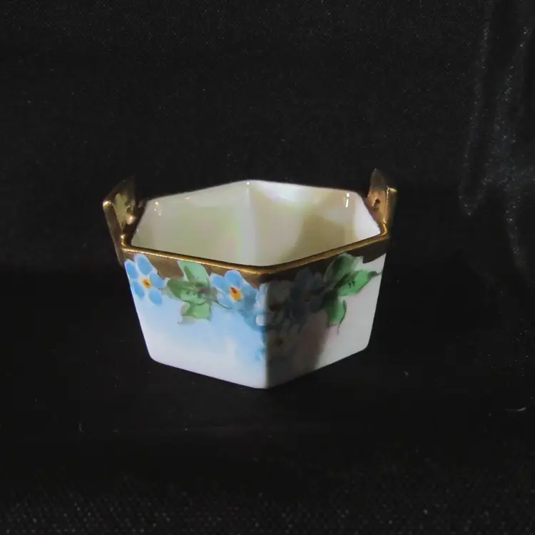 Porcelain hexagon shaped salt cellar. Beautiful flowers hand painted around the outer edge with gold around edge and on handles. No marks. Approx. 1 1/4" tall at the top of handles x 2 1/8" across Excellent condition with no chips, cracks or breaks.