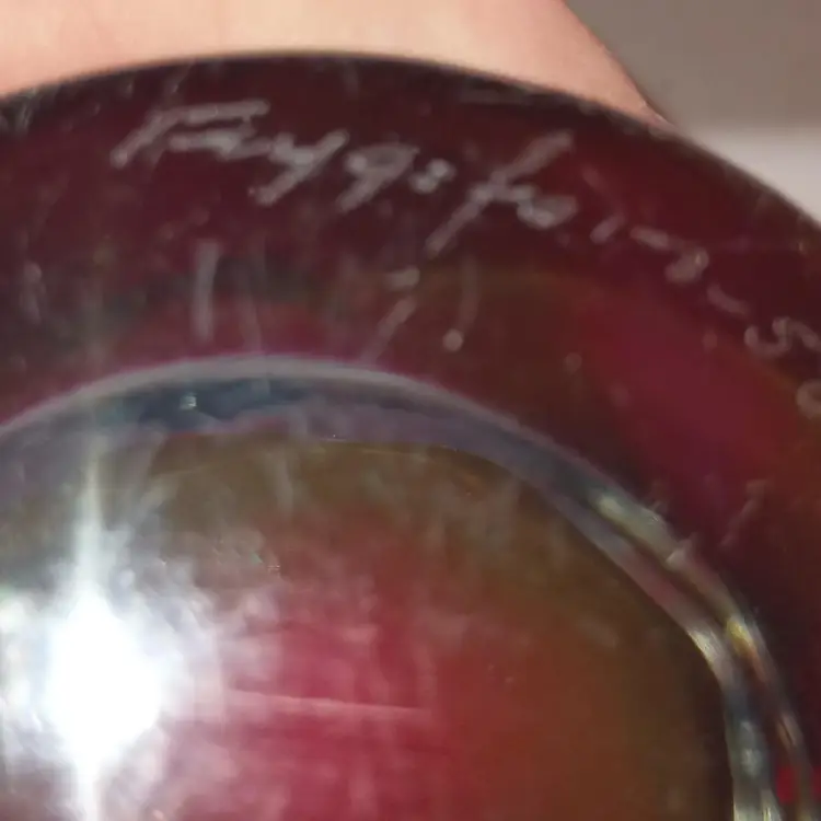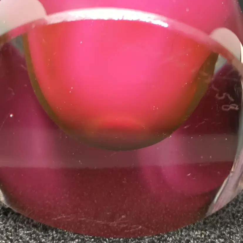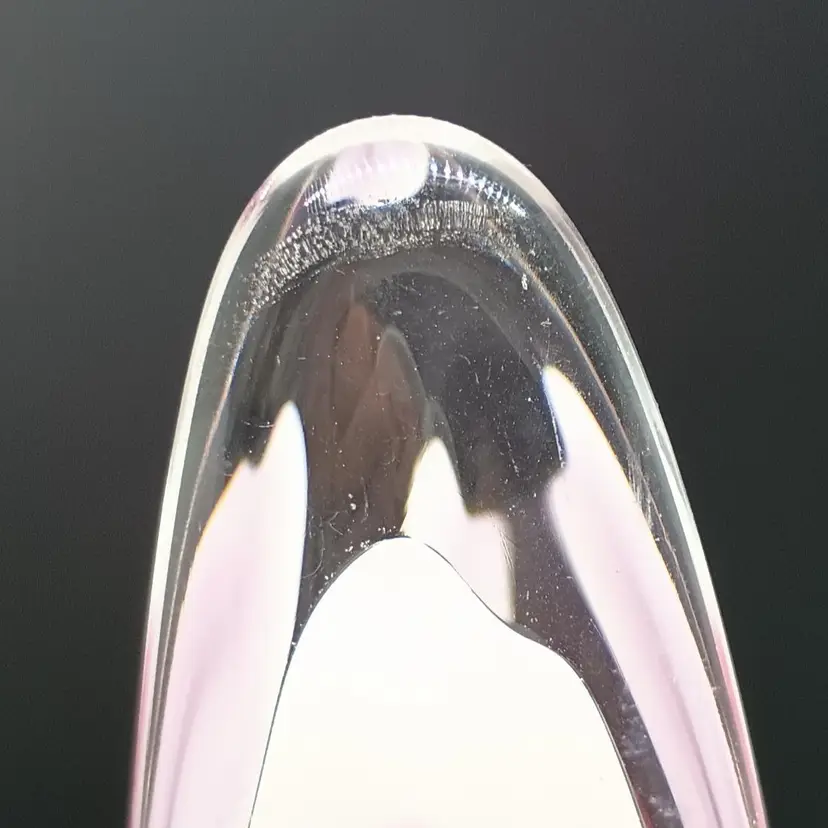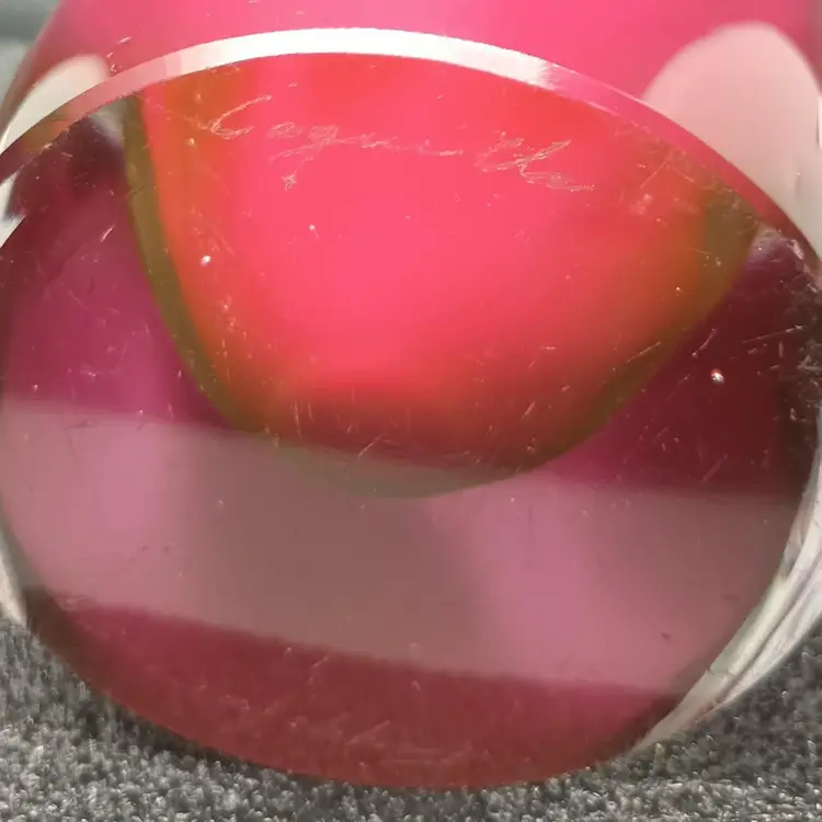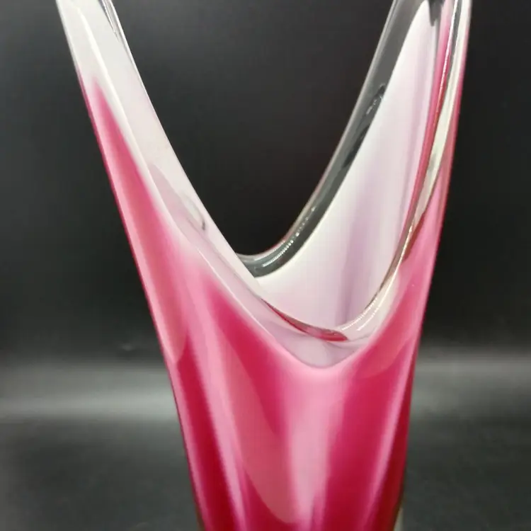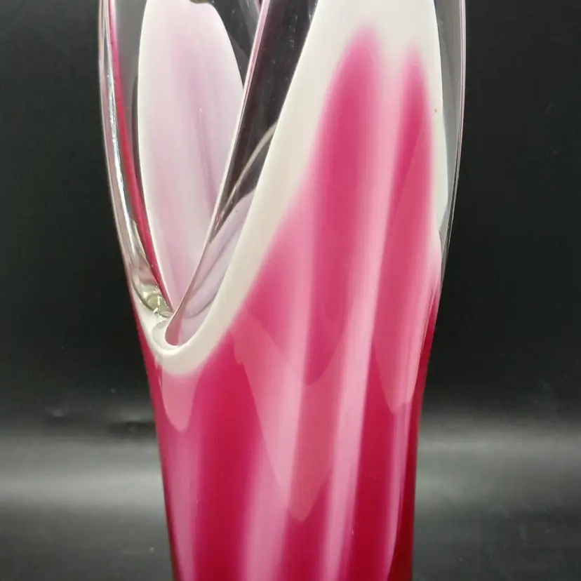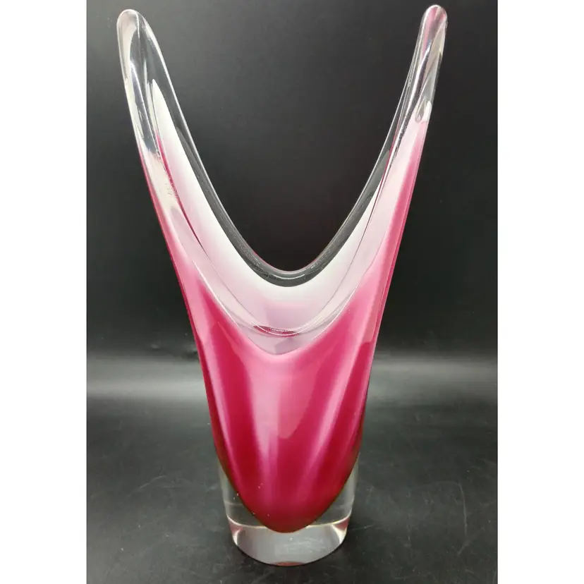 Beautiful vase which is signed on the bottom and appears to have the date of 58 after the Flygsfors signature. Paul Kendle joined this company in 1949 and created the popular and recognizable art class manufactured by this company. Coquille means shell in Swedish. The inside center is white with the underside of pink and dark raspberry stripes encased in clear glass it measures about 10 and a half inches by 5 and 1/2 by 2 and 7/8. The vase is in wonderful condition although there appears to be a little roughness on the outside edge of the top of the vase arm which may be from rubbing against something. Please review photos.