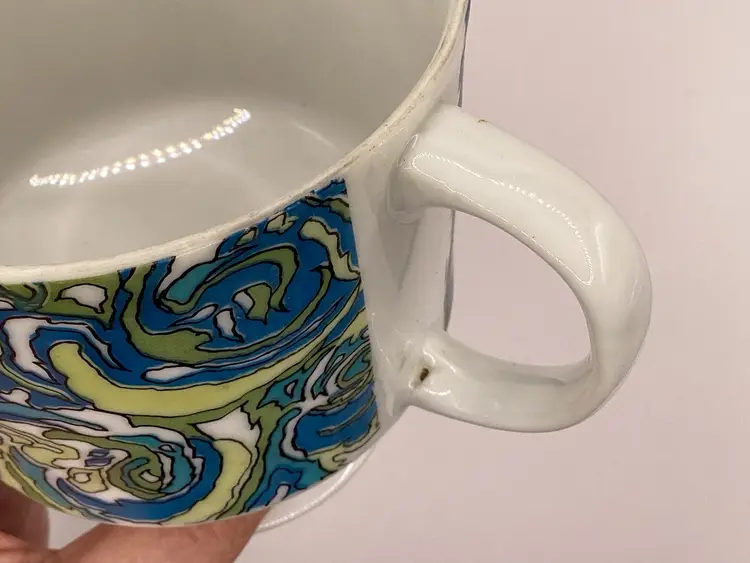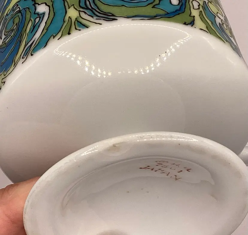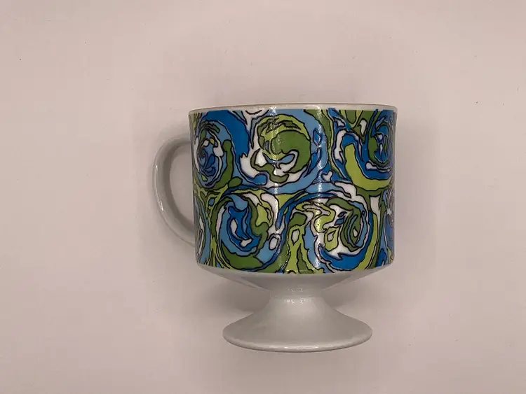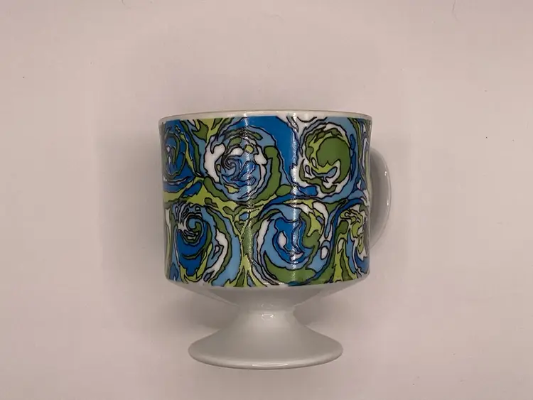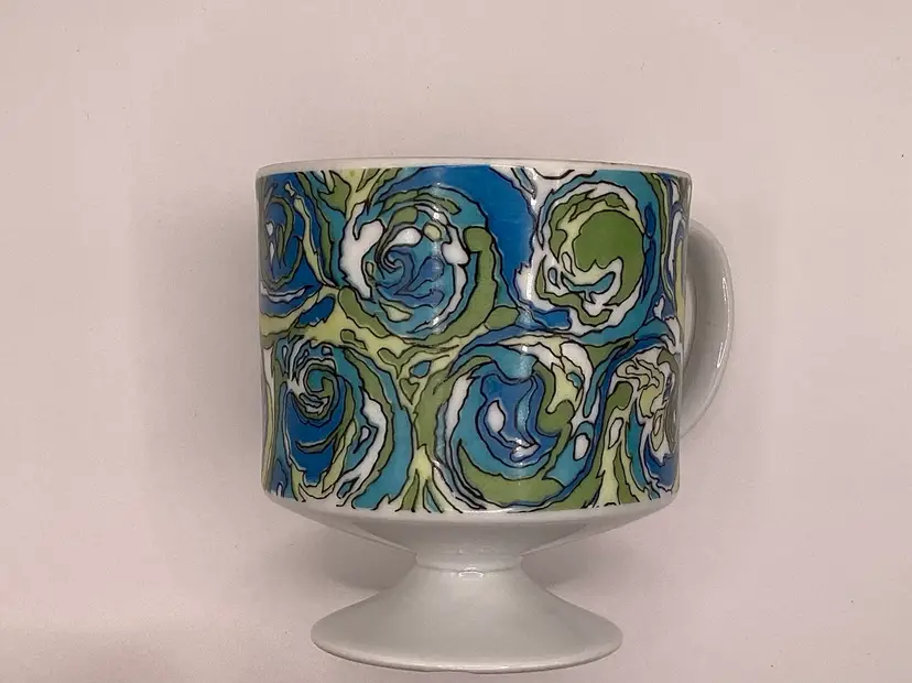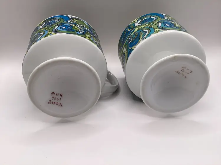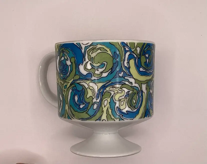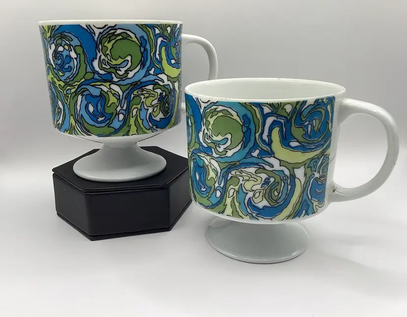 Brand: Holt Howard Japan Identifier: Marked on bottom of each mug Features: Pedestals / Abstract swirls Material: Ceramic Pattern/Design: MCM Color: White / Blues / Greens Measurements: Height - Including pedestal; 3 & 3/4”…..Cup 2 & 1/2” Width - 4 & 1/4”