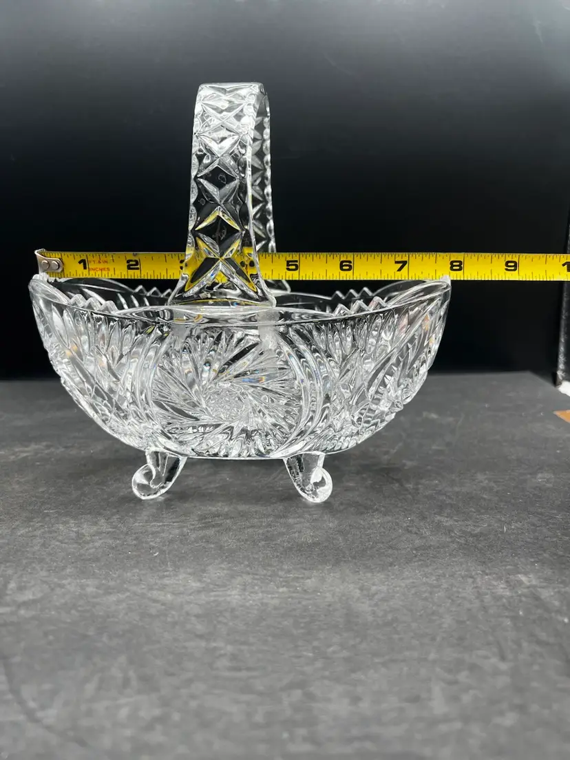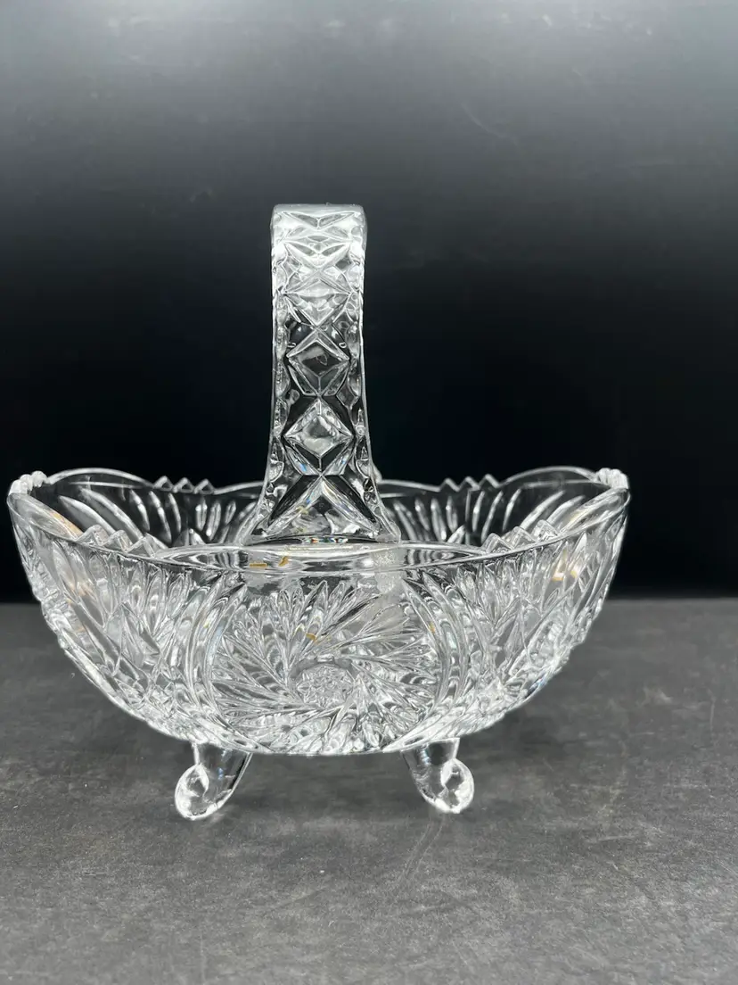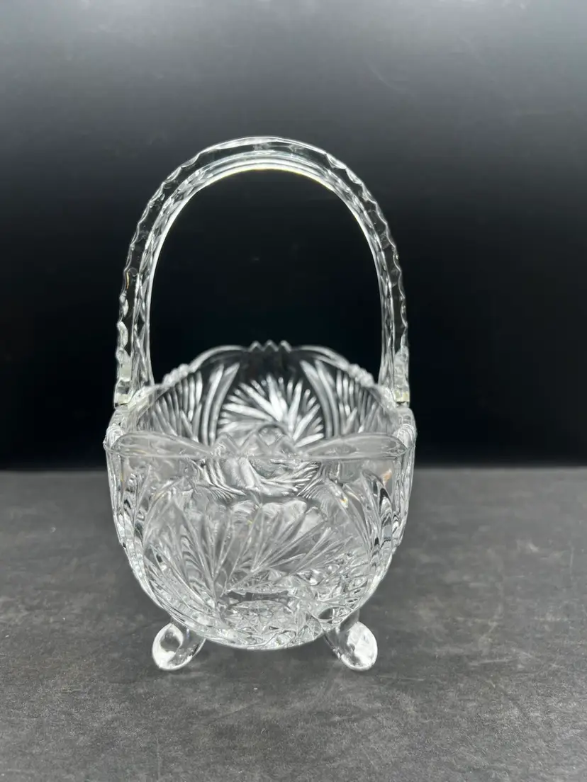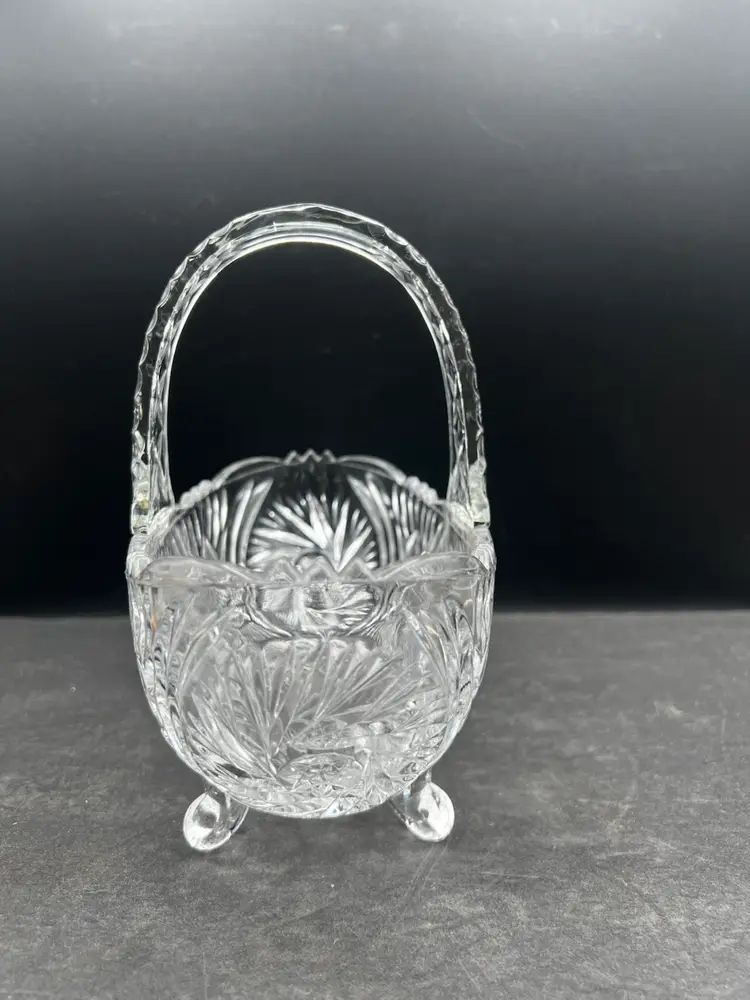 Beautiful Vintage Clear Cut Crystal Footed Basket In excellent condition no chips or cracks Stands about 7 1/2” tall x 8” x 4 1/4”