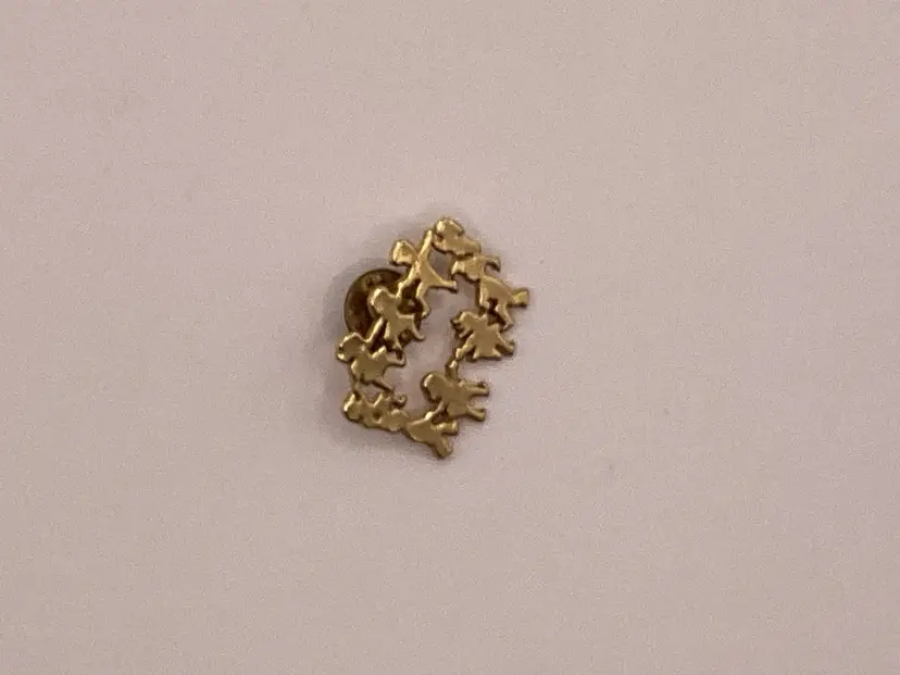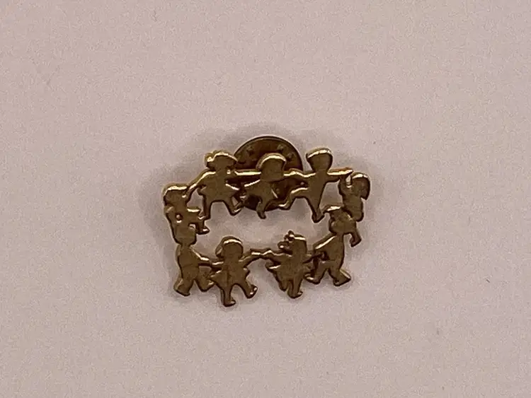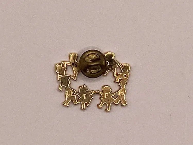 Identifier: Stamped CTPM Features: People/Kids in a circle Material: Metal Pattern/Design: Circle of Friends Color: Gold tone Measurements: Height - 1” Width - 1 & 1/4”