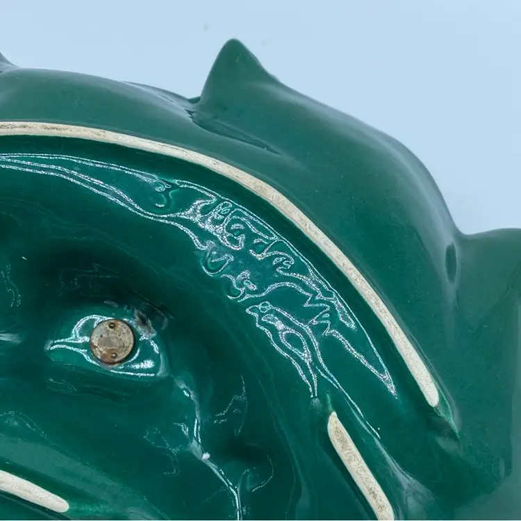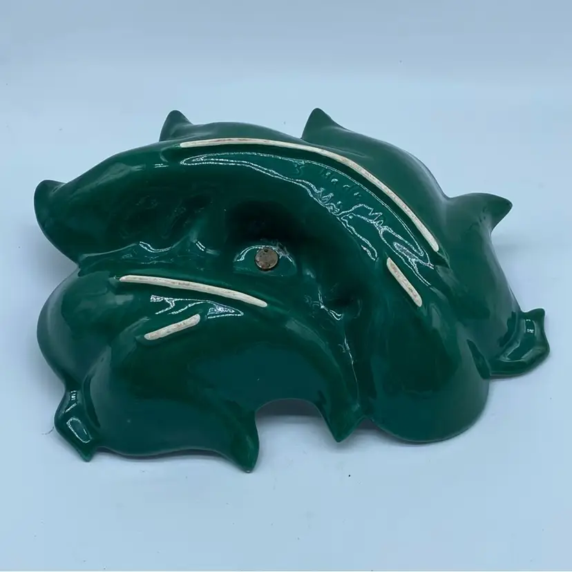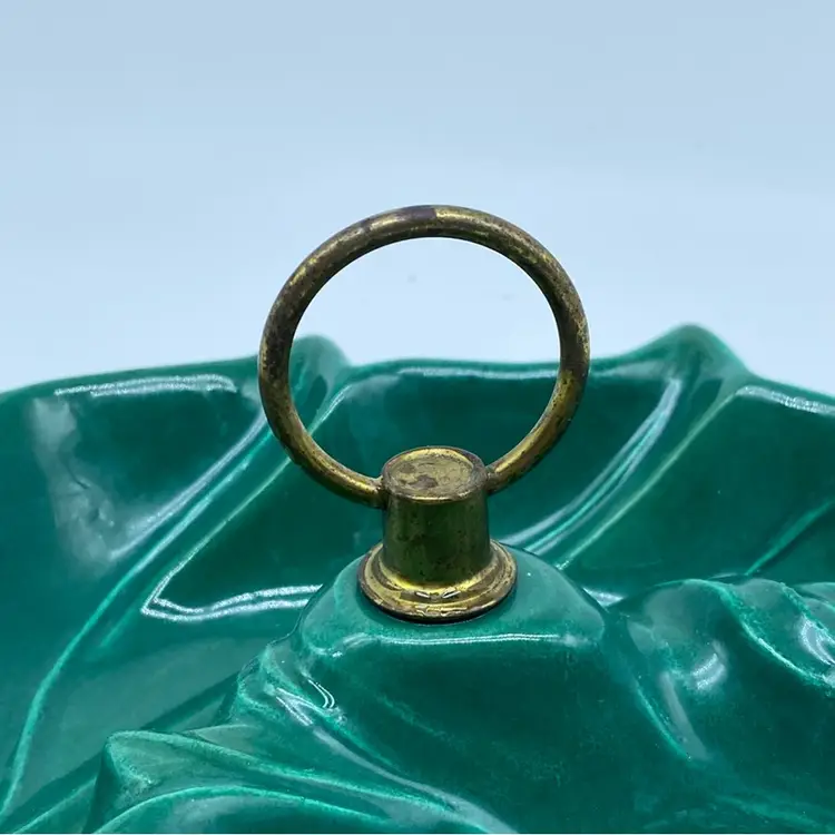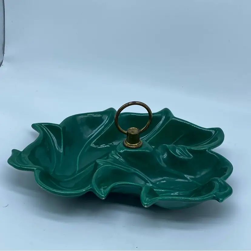 No chips or cracks Patina on handle. Origin USA Approx size 10 x 7.5 inches Mid-century modern serving dish. Key features include: It is made of green USA pottery. The design is a double leaf shape. It has a gold handle in the center. The piece is identified as No. 3 possibly a model or production number. It could be used for serving snacks, nuts, or candies.