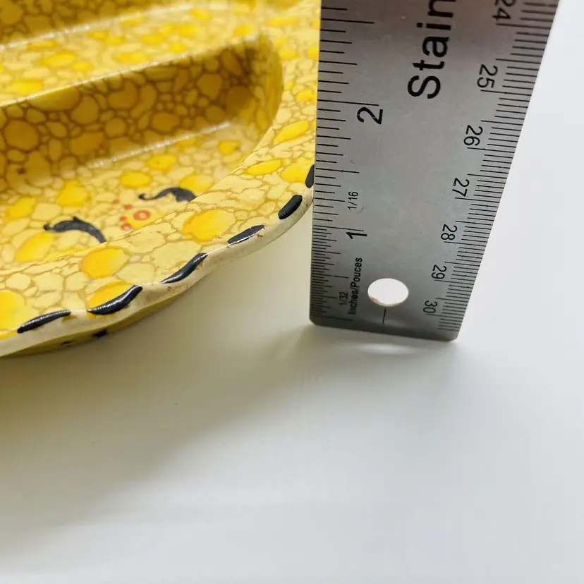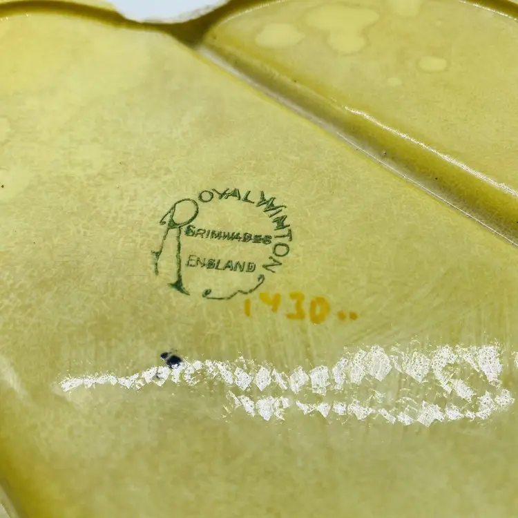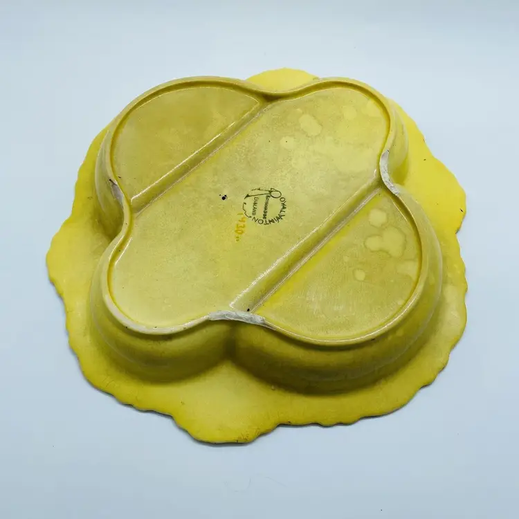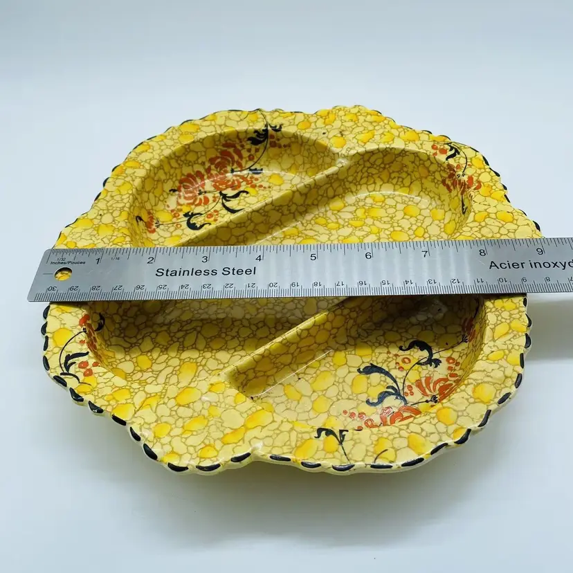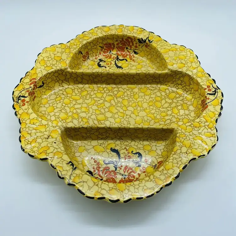 This Royal Winton Grimwades serving dish from 1930 is a true vintage gem. The floral pattern decorating a pebble design make it a unique addition to any collection. The dish is made of bone china and features three compartments, perfect for serving appetizers or desserts. Alternatively use it to collect dresser or foyer items. The dish is in its original condition and has not been reproduced, making it a rare find. Its multicolor design is eye-catching and adds a touch of elegance to any table setting. This serving dish is a must-have for any collector or lover of vintage decor.