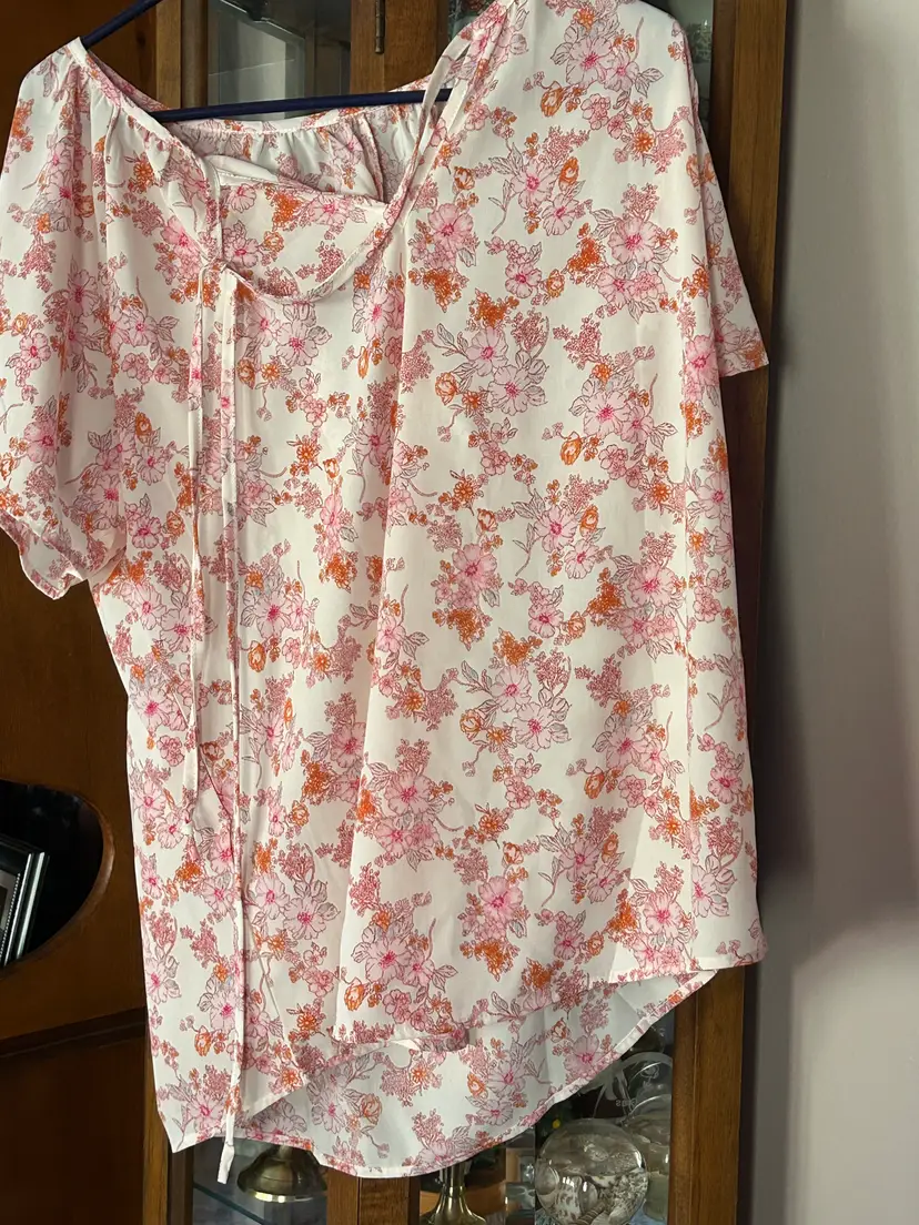 Lightweight blouse with a charming pink and orange floral pattern. Features a tie-front detail for a casual, breezy look.
