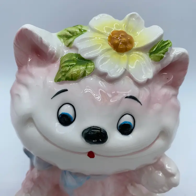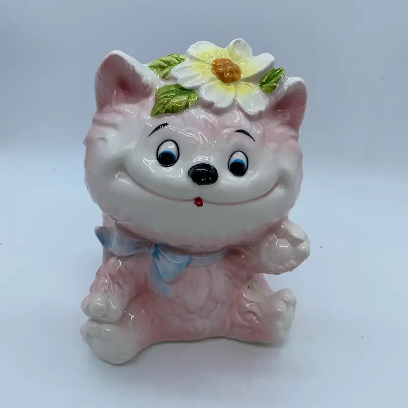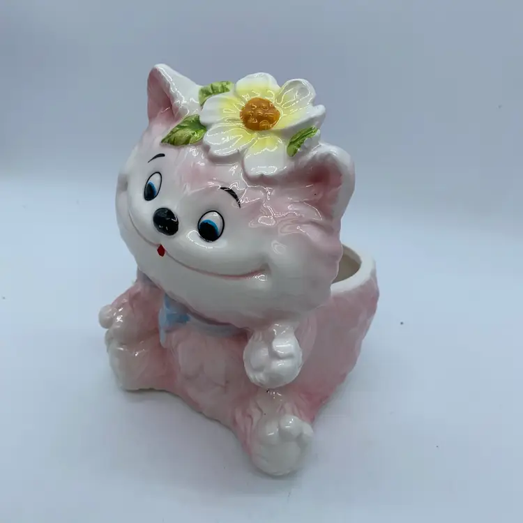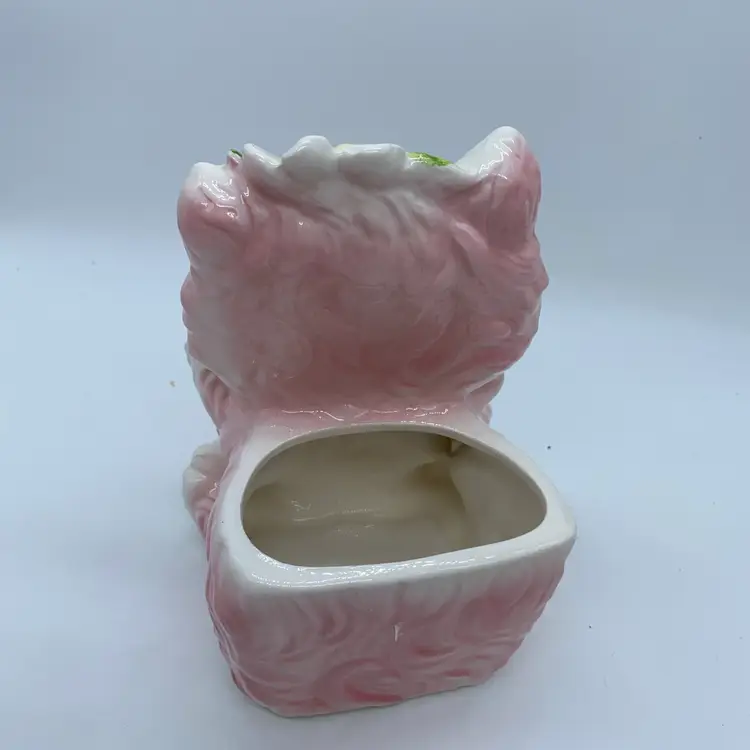 Figurines like this pink cat, often featuring anthropomorphic animals with exaggerated features and bright glazes, were popular in the post-war era. They were commonly used as decorative accents in homes, and some served functional purposes such as planters or candy dishes. The "6156" designation is a specific model number that helps in identifying and cataloging these collectible items.