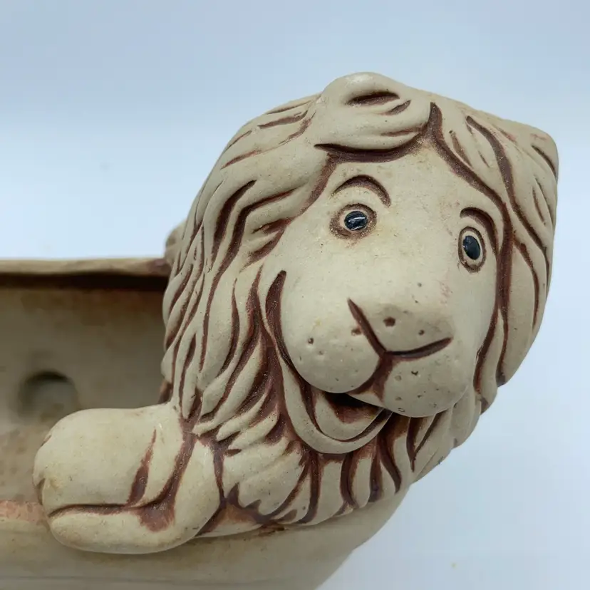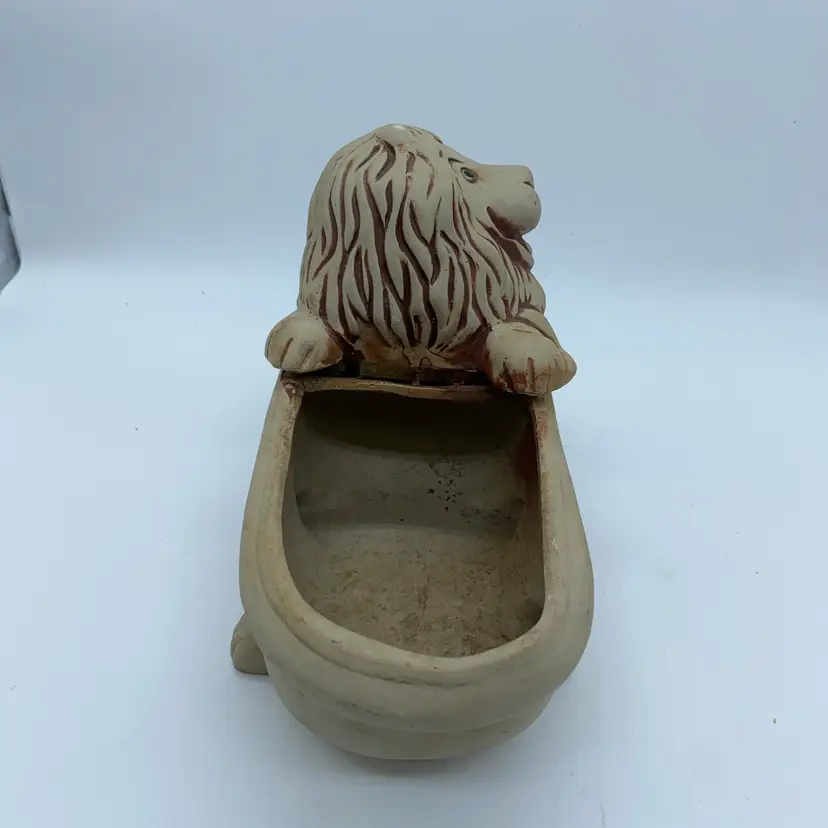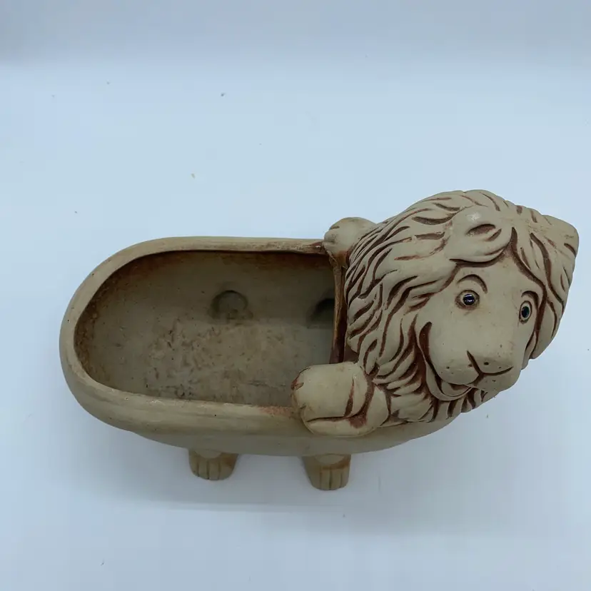 This particular planter, featuring a lion in a bathtub, taps into a playful, anthropomorphic theme often found in decorative ceramics. Such items were frequently produced in countries known for their ceramic manufacturing, like Taiwan, to cater to international markets seeking affordable and charming home decor. They are often collected for their nostalgic appeal and unique character.