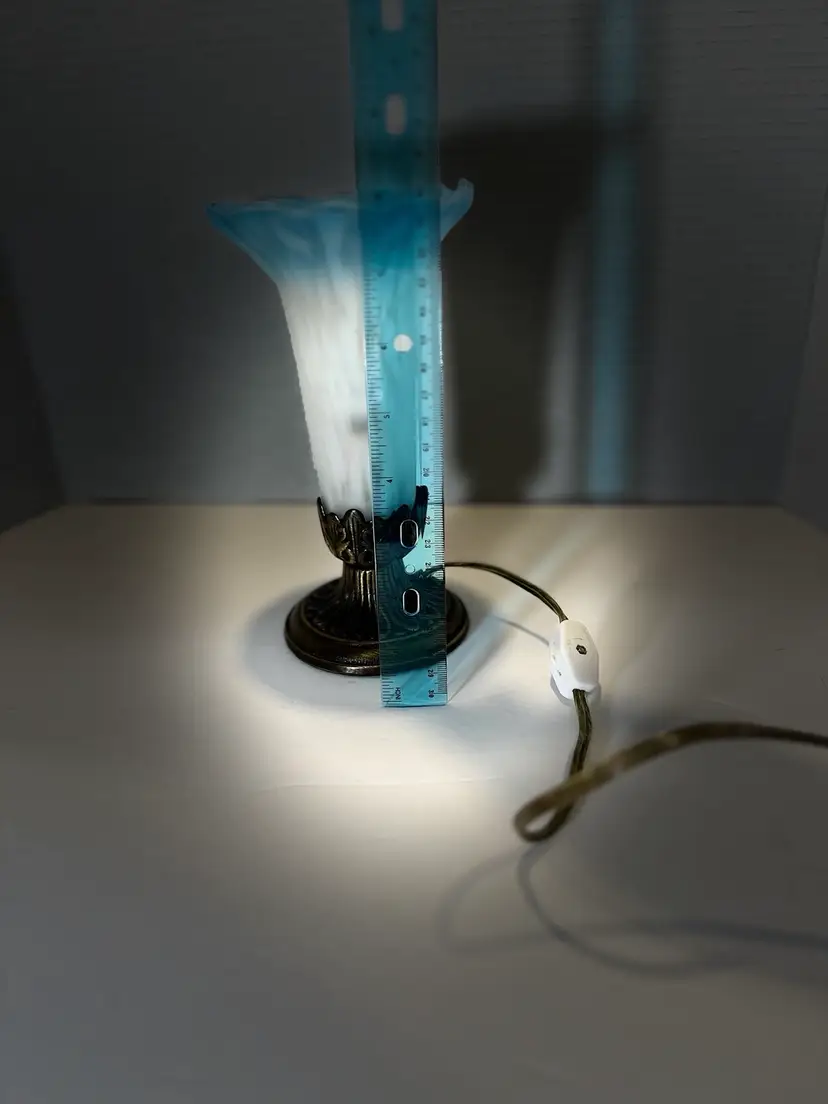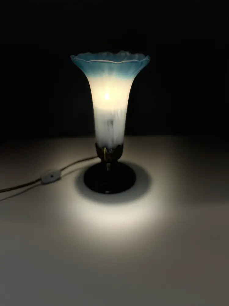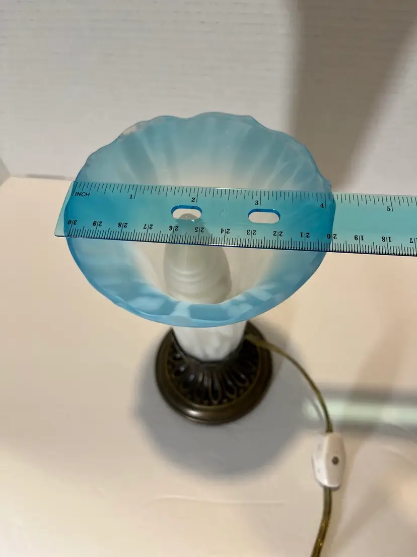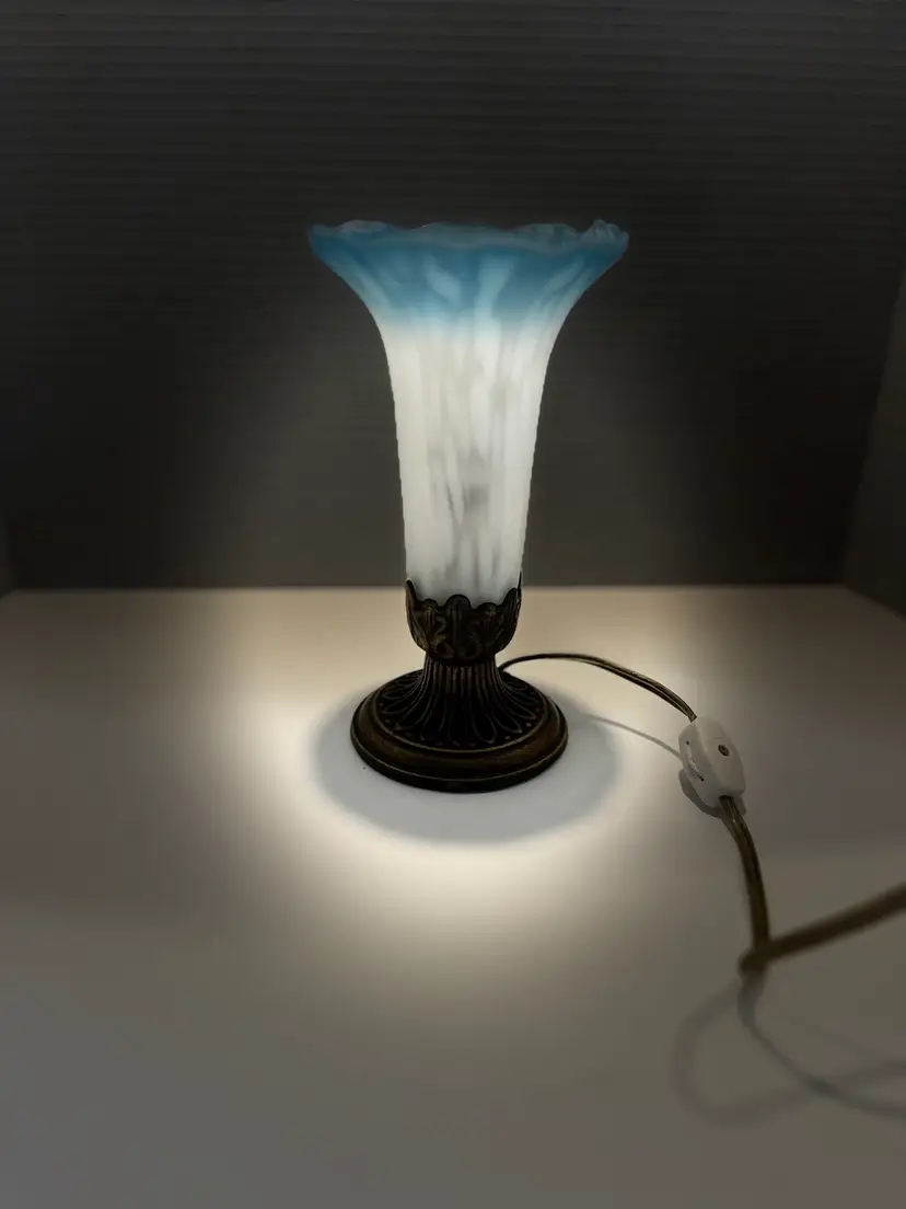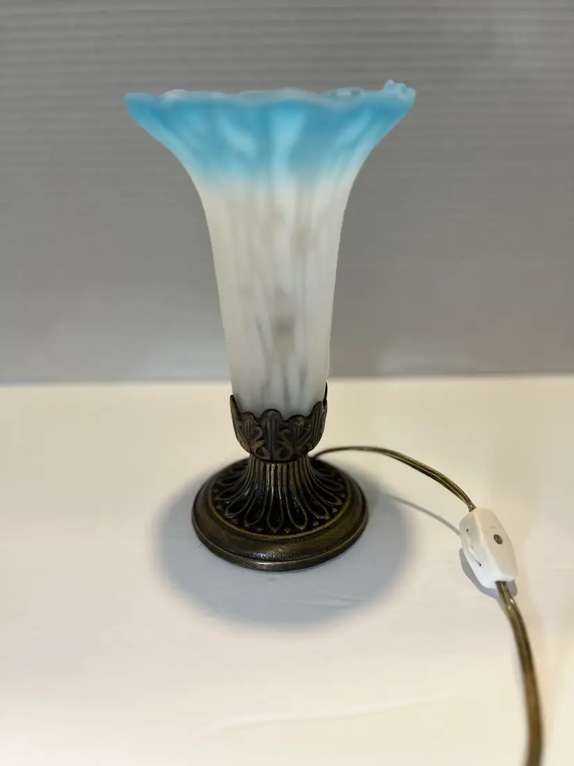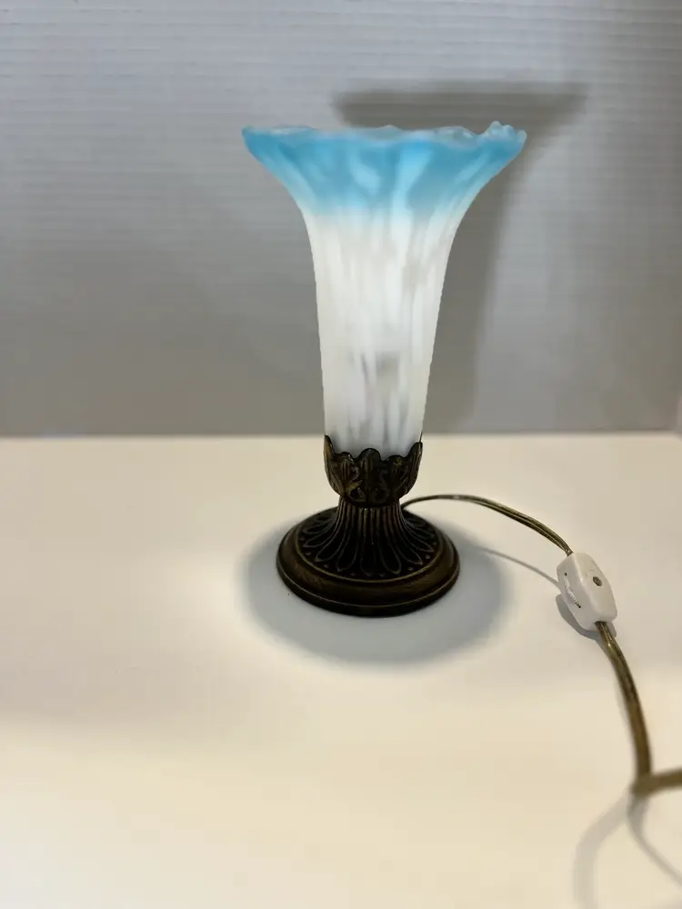 Beautiful vintage blue frosted tulip shade lamp by Andrea by Sadek. This lovely lamp is in beautiful condition with no chips or cracks and works as designed as shown. It will be a beautiful addition to your home decor. Please review all pictures carefully for size, color and condition.