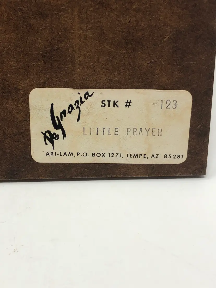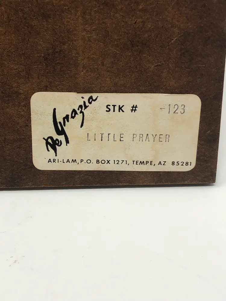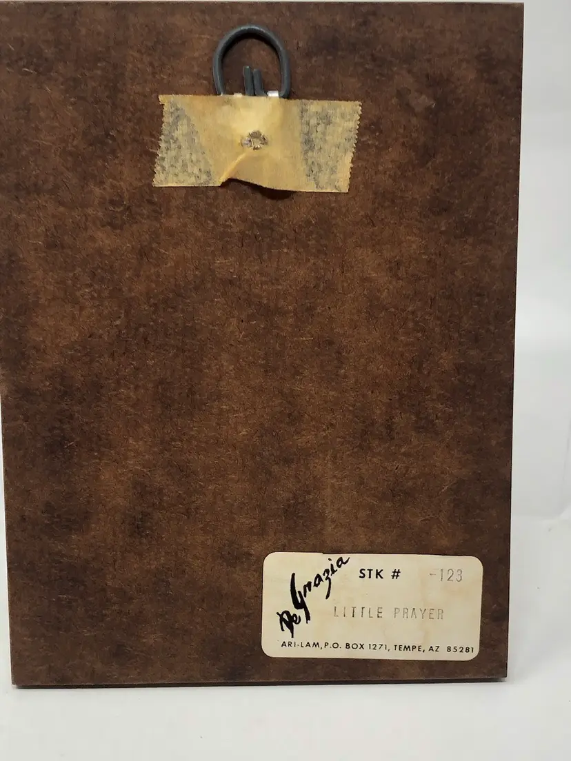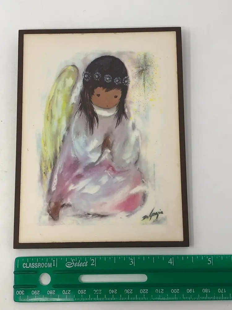 Small print by Arizona artist Ted De Grazia features a child angel praying. Original label on the back as well as hanging hardware