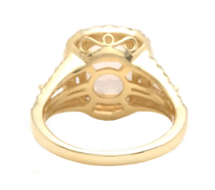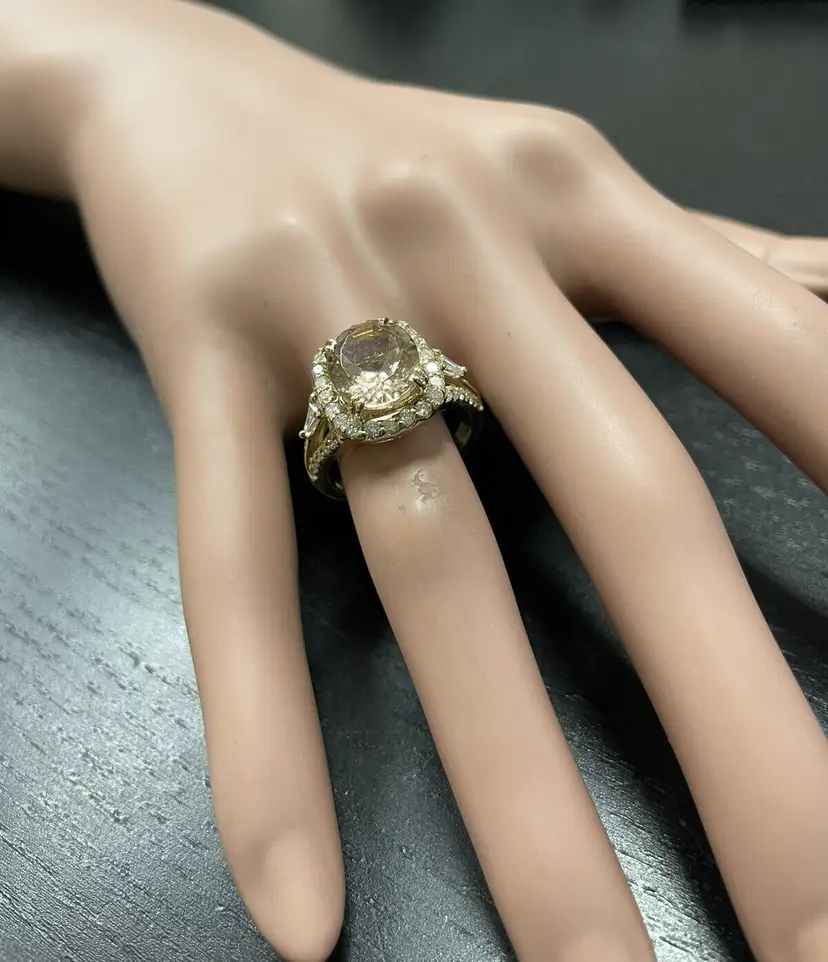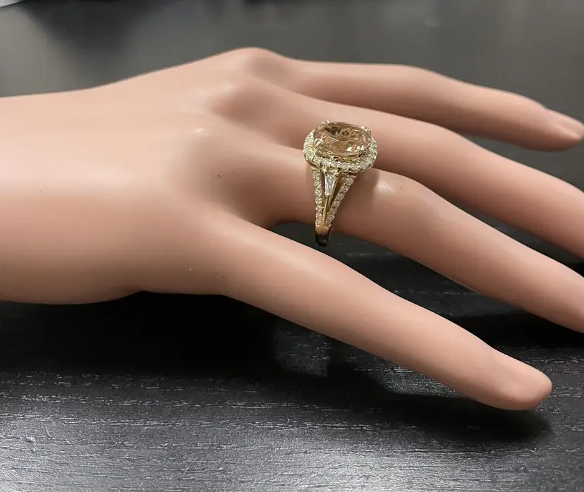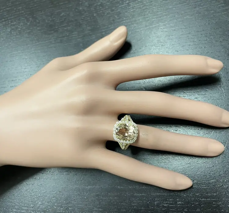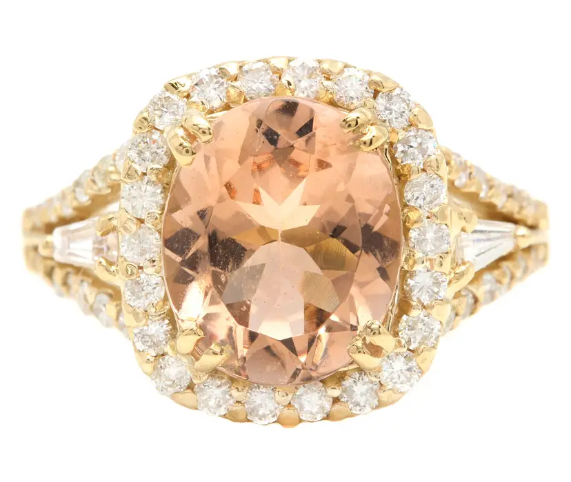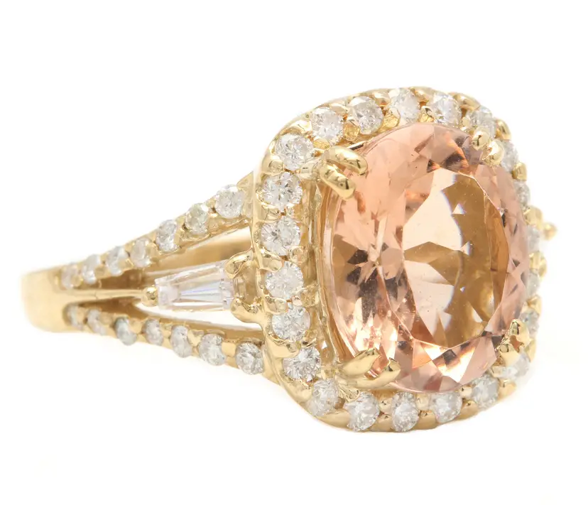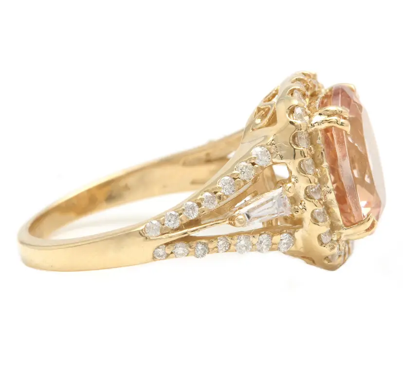 Main Stone Creation: Natural Sizable: Yes Main Stone Color: Peach Metal: Yellow Gold Secondary Stone: Morganite Main Stone: Morganite Brand: Unbranded Ring Size: 7 Main Stone Treatment: Heating Type: Ring Metal Purity: 14k Main Stone Shape: Oval Theme: Nature Style: With Diamonds & Gemstones Total Carat Weight (TCW): 5.20