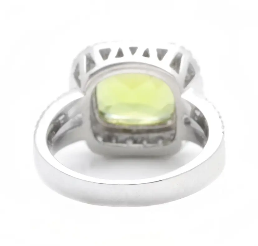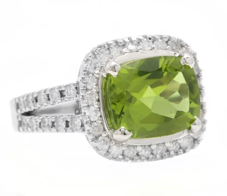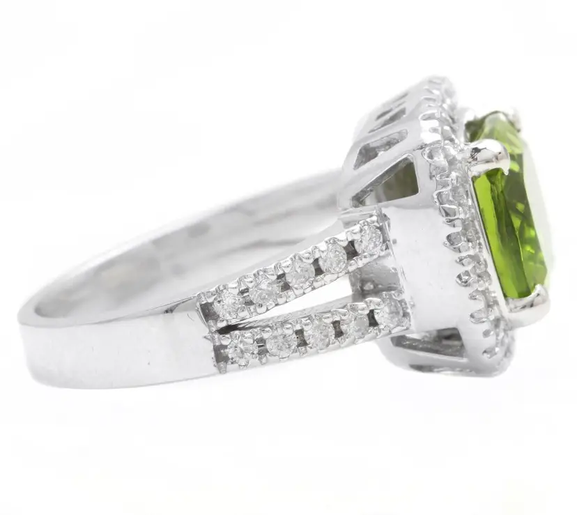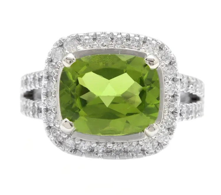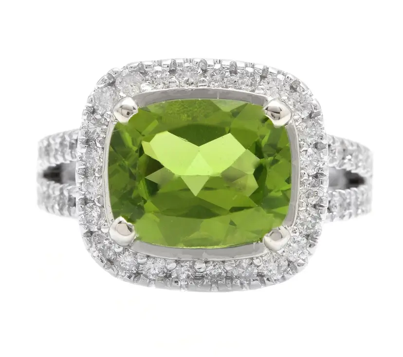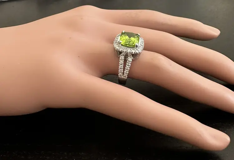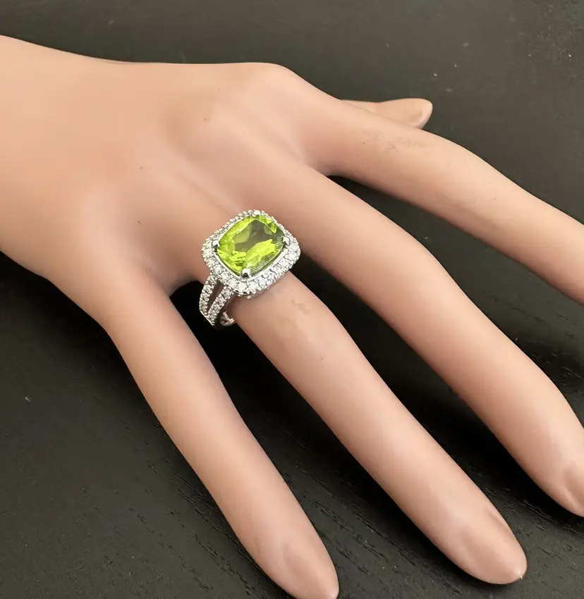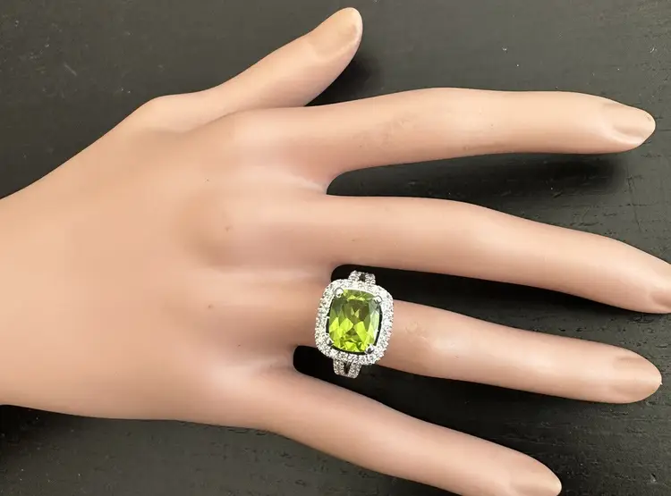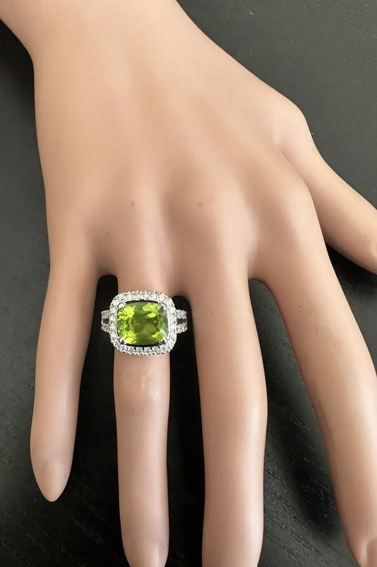 Main Stone Creation: Natural Sizable: Yes Main Stone Color: Green Metal: White Gold Secondary Stone: Diamond Main Stone: Peridot Brand: Unbranded Ring Size: 7 Main Stone Treatment: Not Enhanced Type: Ring Metal Purity: 14k solid gold Main Stone Shape: Cushion Theme: Nature Total Carat Weight (TCW): 5.30 Country/Region of Manufacture: United States