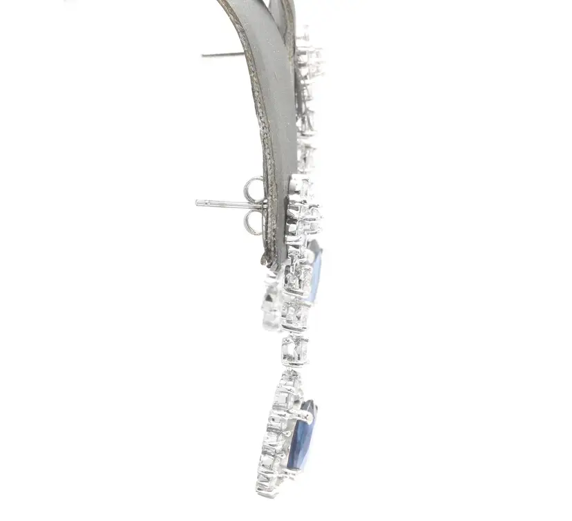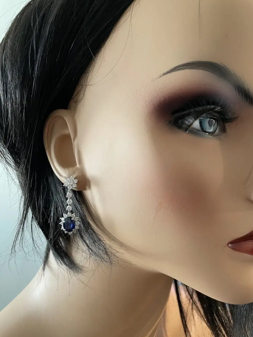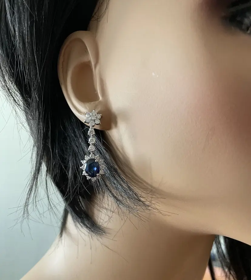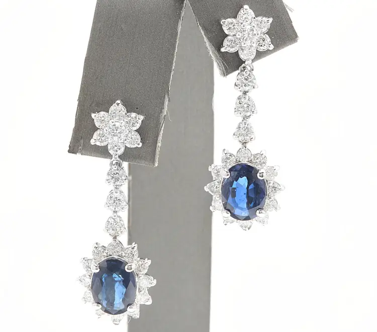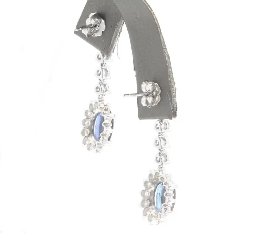 Main Stone Treatment: Diffusion Type: Earrings Main Stone Creation: Natural Metal Purity: 14k solid gold Main Stone Shape: Oval Style: Drop/Dangle Material: Gemstone Main Stone Color: Blue Total Carat Weight (TCW): 5.30 Metal: White Gold Secondary Stone: Sapphire Main Stone: Sapphire Brand: Unbranded