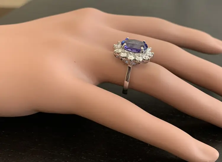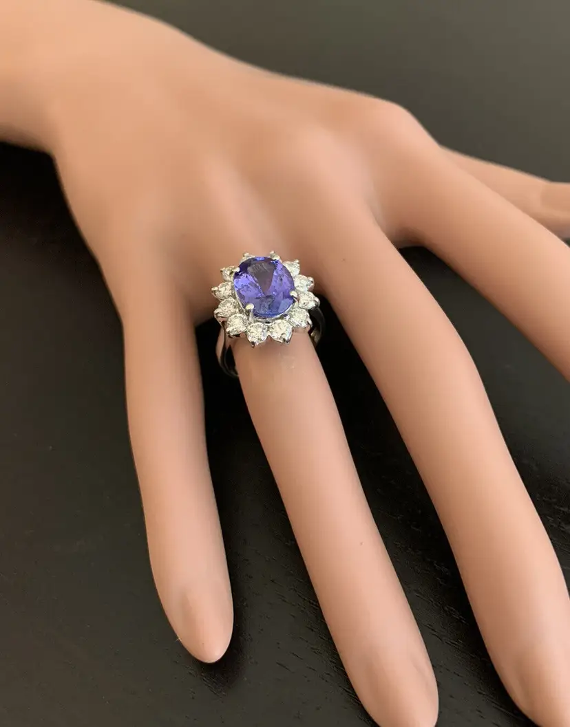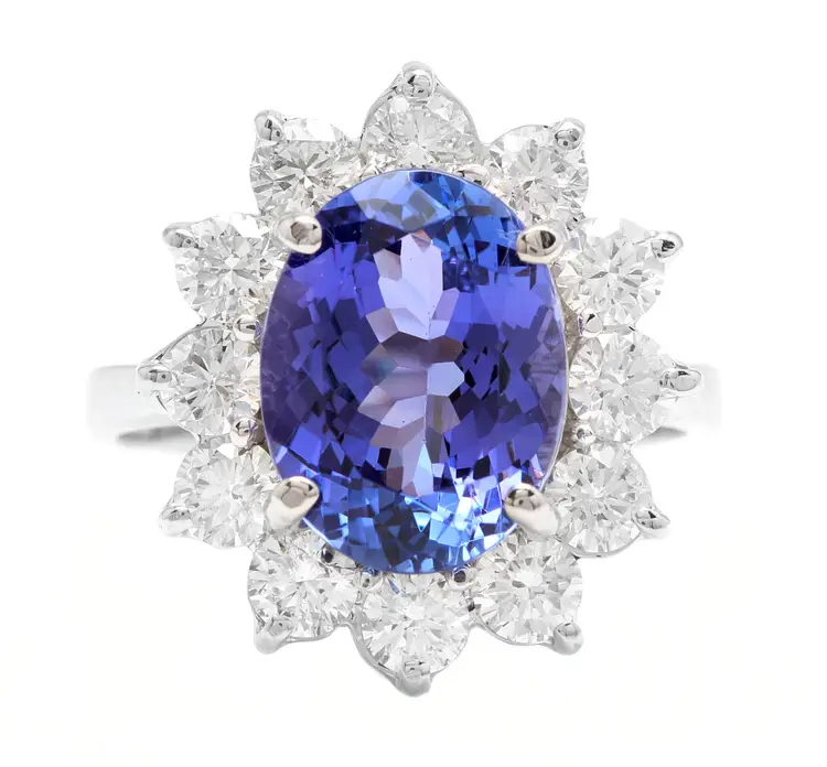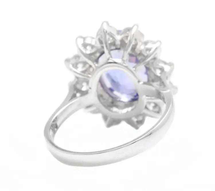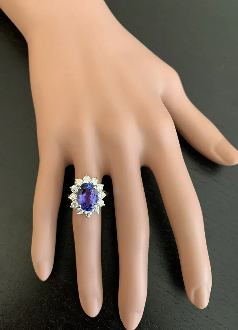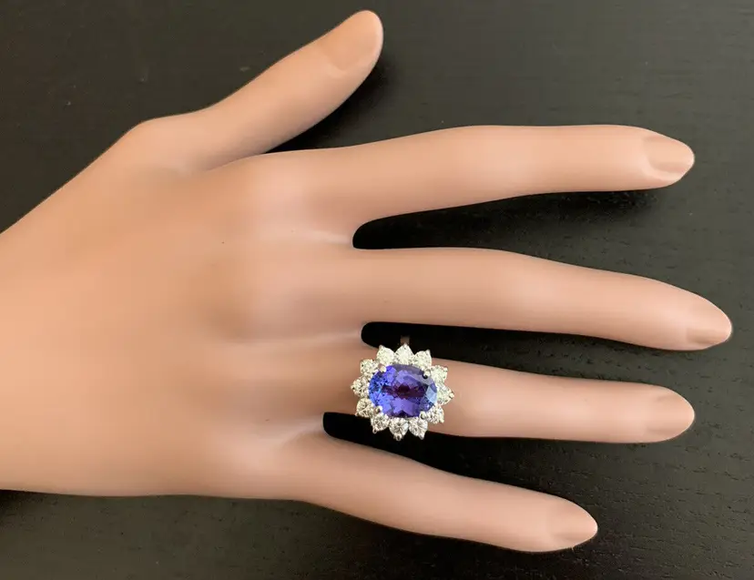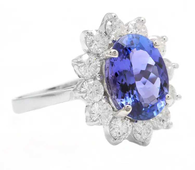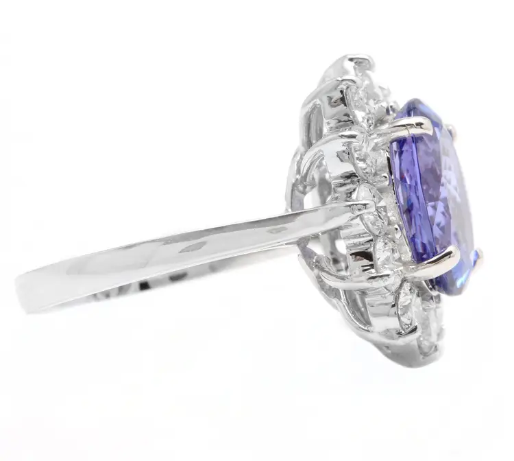 Ring Size: 6 Main Stone Creation: Natural Metal Purity: 18k Style: With Diamonds & Gemstones Main Stone Color: Bluish Violet Metal: White Gold Secondary Stone: Tanzanite Main Stone: Tanzanite Total Carat Weight (TCW): 5.75 Main Stone Treatment: Heating Country/Region of Manufacture: United States Sizable: Yes Main Stone Shape: Oval Type: Ring Brand: Unbranded