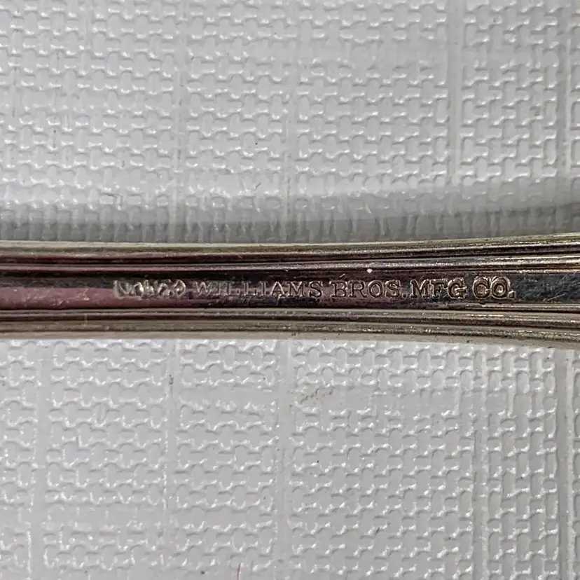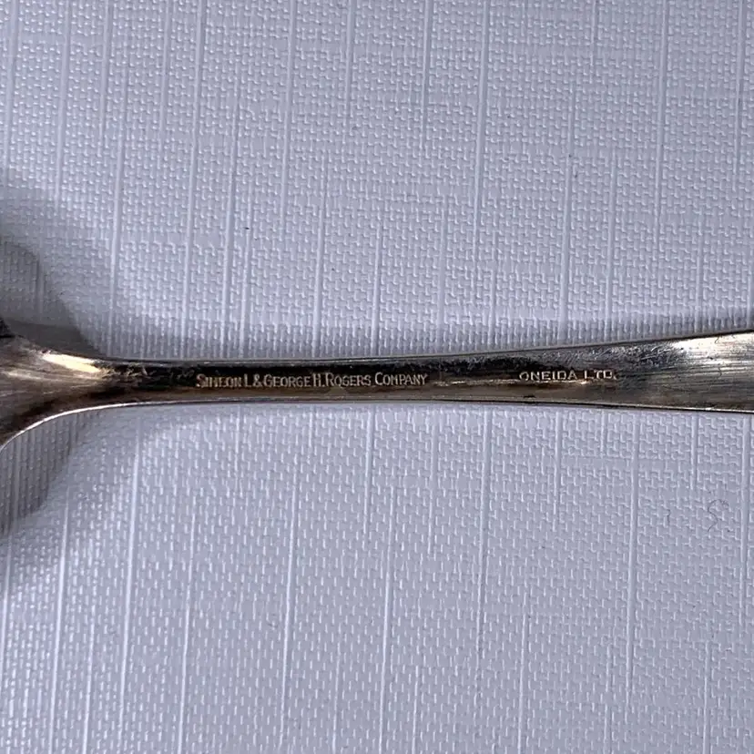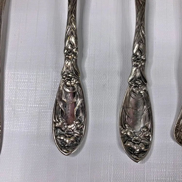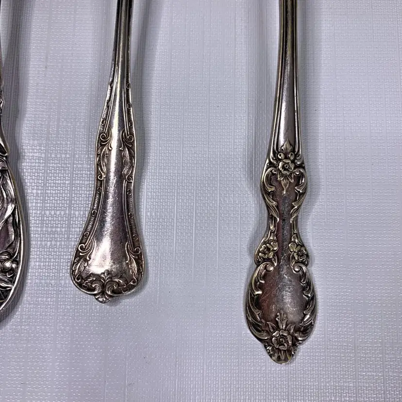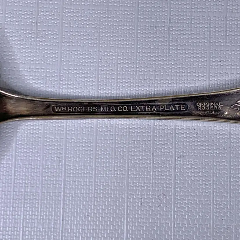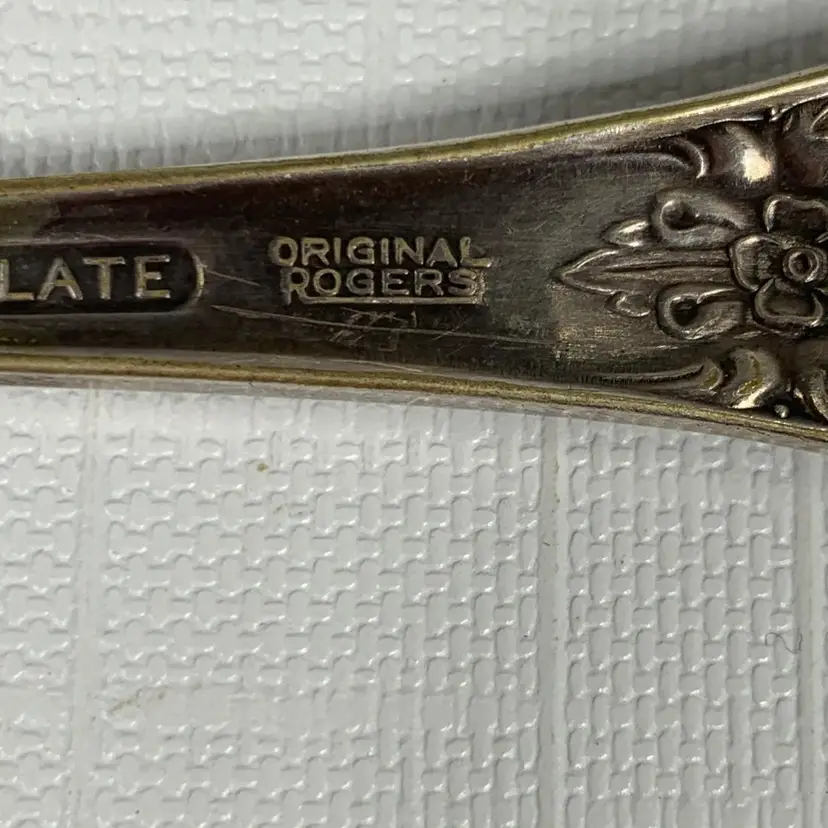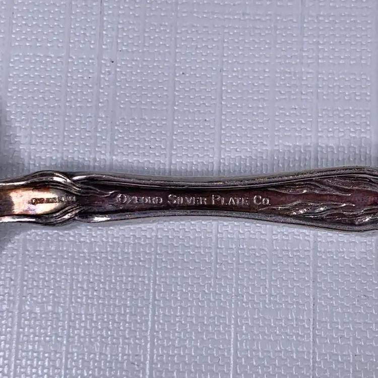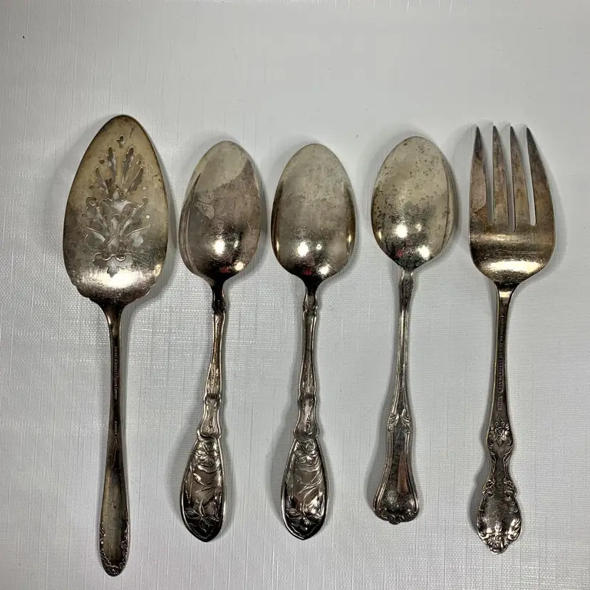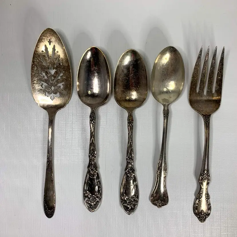 Includes (1) Wm Rogers mfg co grand elegance/southern manor serving fork, (2) Oxford silver plate 1908 narcissus large serving spoons, (1) 1908 Queen Elizabeth National Silver serving spoon and (1) Simeon L. & George H. Rogers silver plate pie / cake / pastry server. Condition is consistent with age.