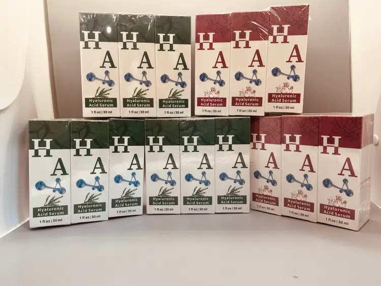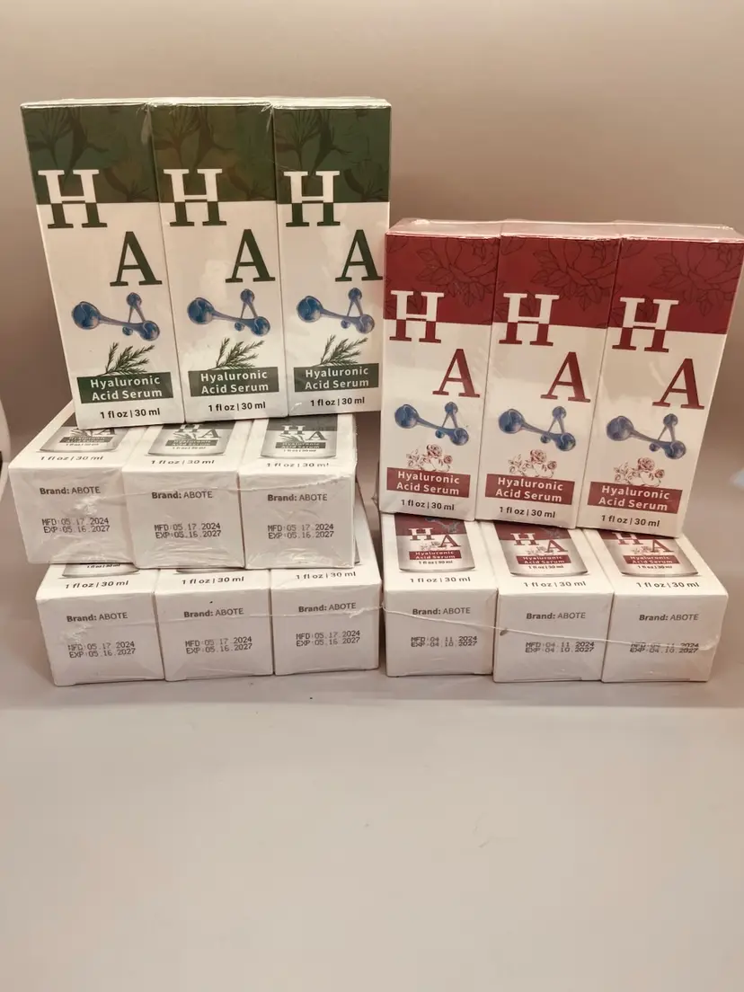 Total of 15 bottles of 1 fl oz of Hyaluronic acid. Retail: $17.00 per 3pack Green: Rosemary Red: Rose Expiration: 2027 Brand: Abote Attracts and holds water, making skin look plumper, smoother, and reducing fine lines and wrinkles