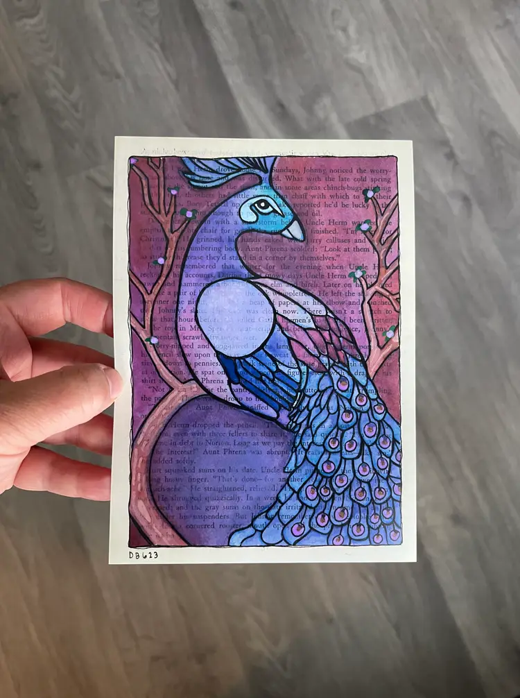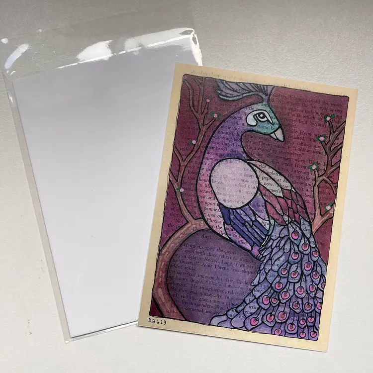 This is for one 5" by 7" print of this peacock (print only) as seen. The original was made by me with watercolor paint, acrylic paint, and pen on an old book page from Grimm's Fairy Tales.