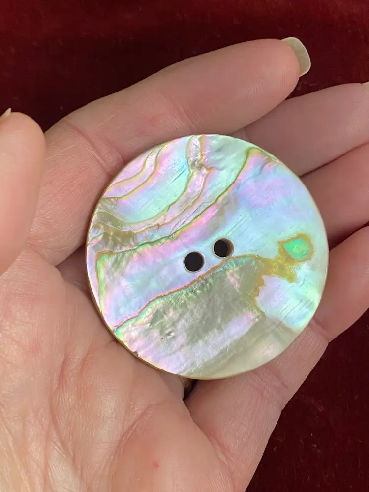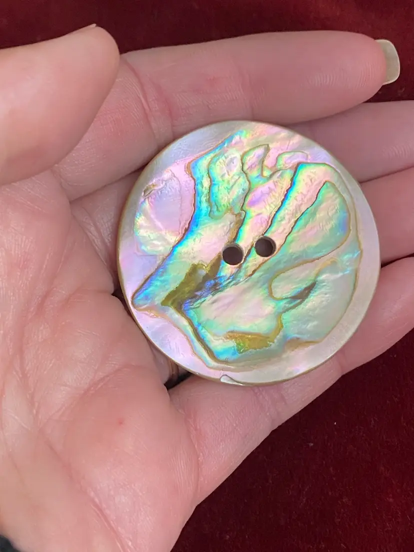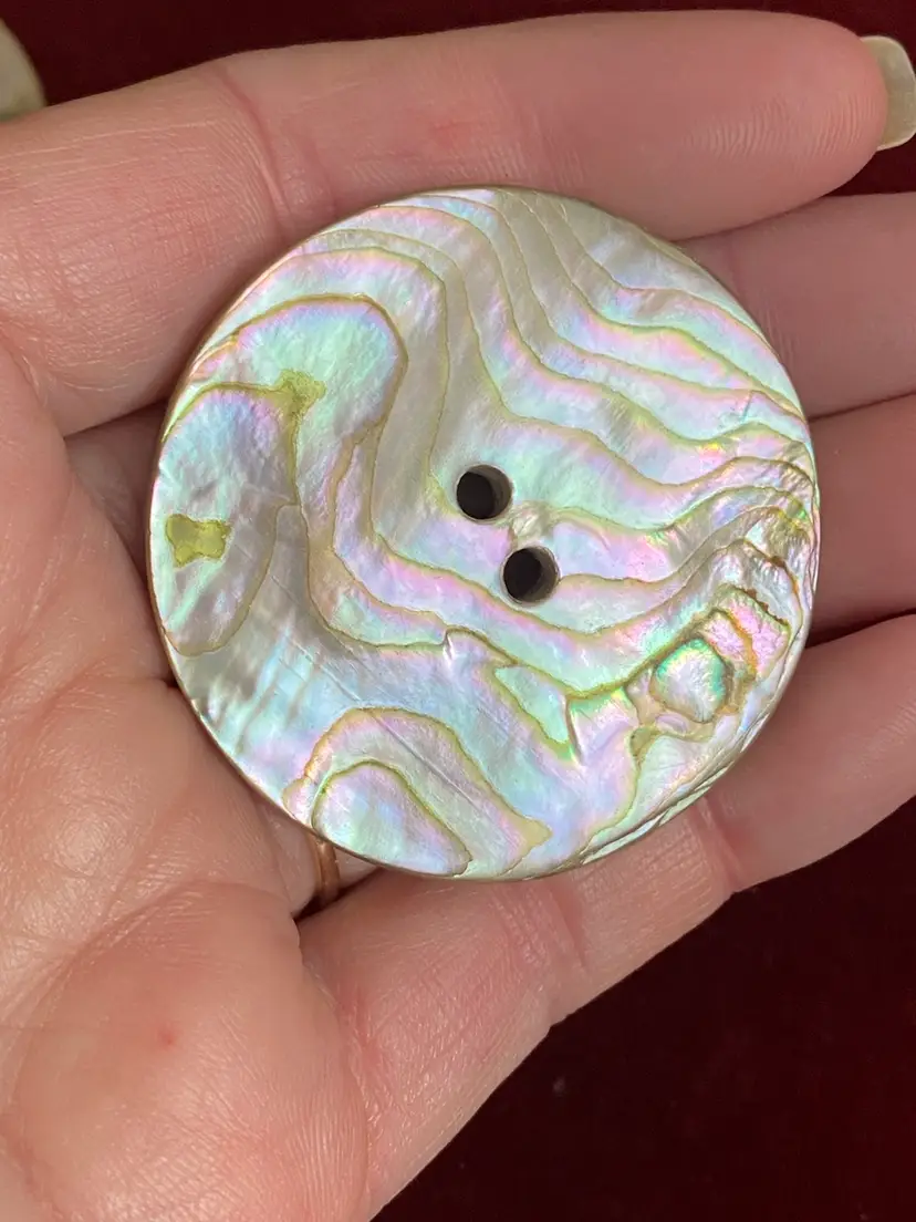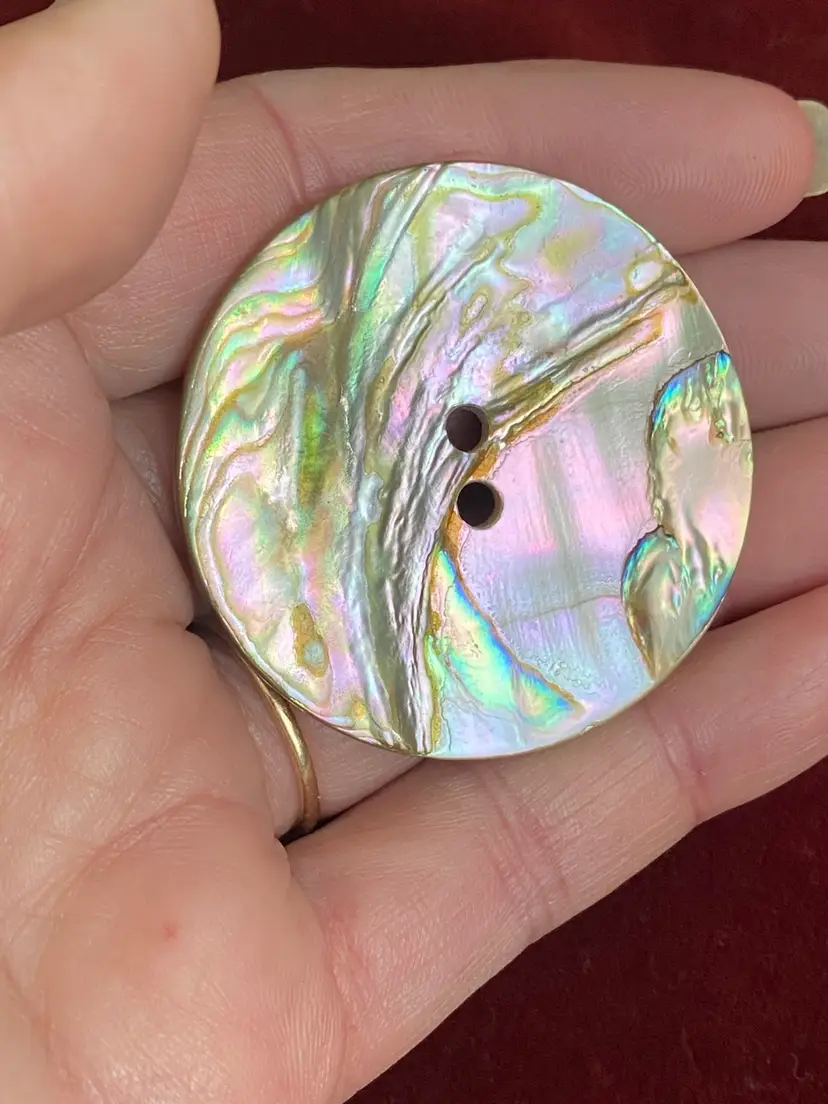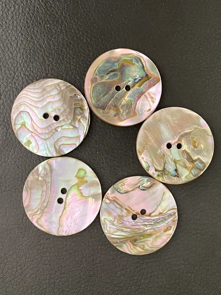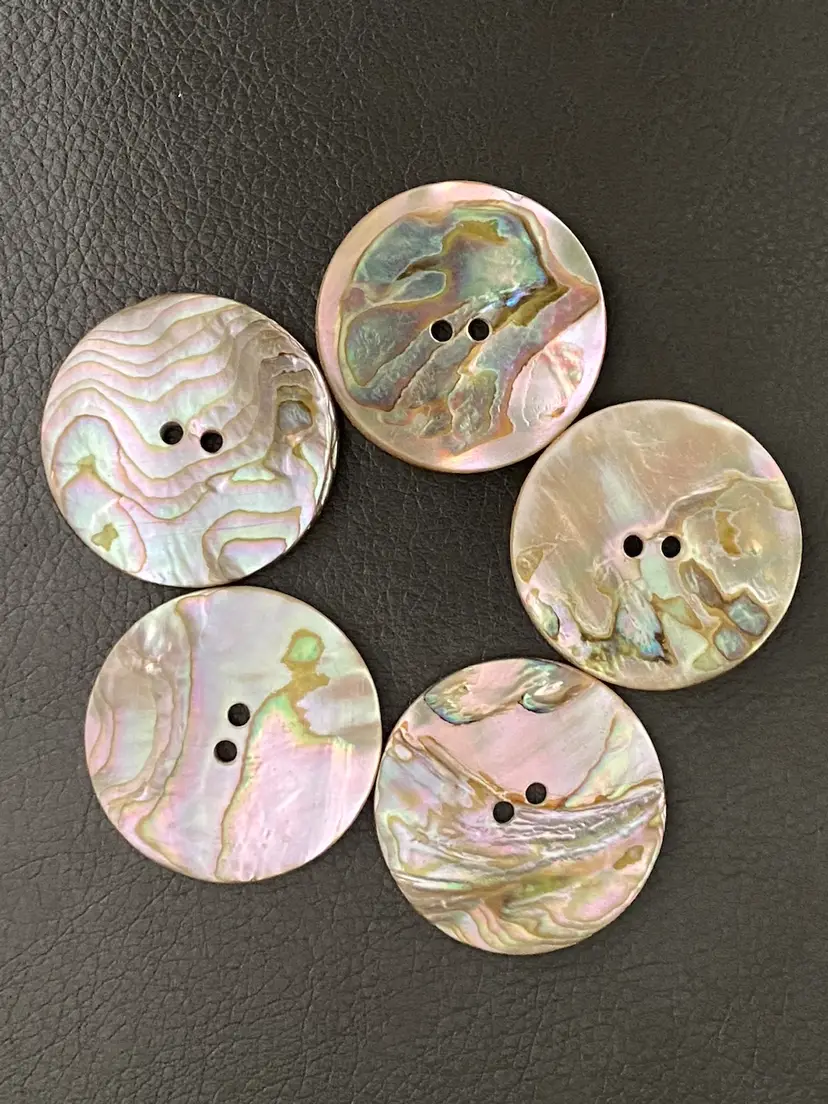This is a gorgeous lot of (5) polished abalone mother of pearl buttons with fabulous color. They remain natural on the reverse side. Featuring a 2 hole attachment. Size 1.75” diameter. They are approximately 4.7 mm thick. Big and beautiful, these make a real statement on a jacket, coat, knitting project, or other craft project. Each one is unique!