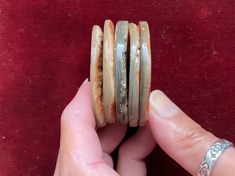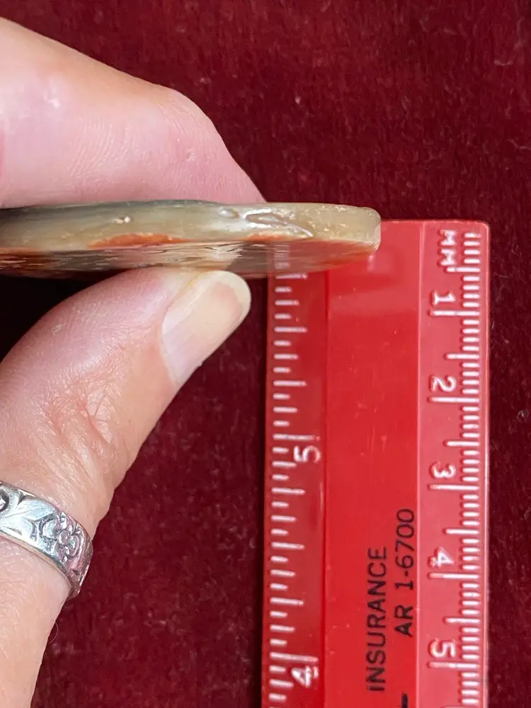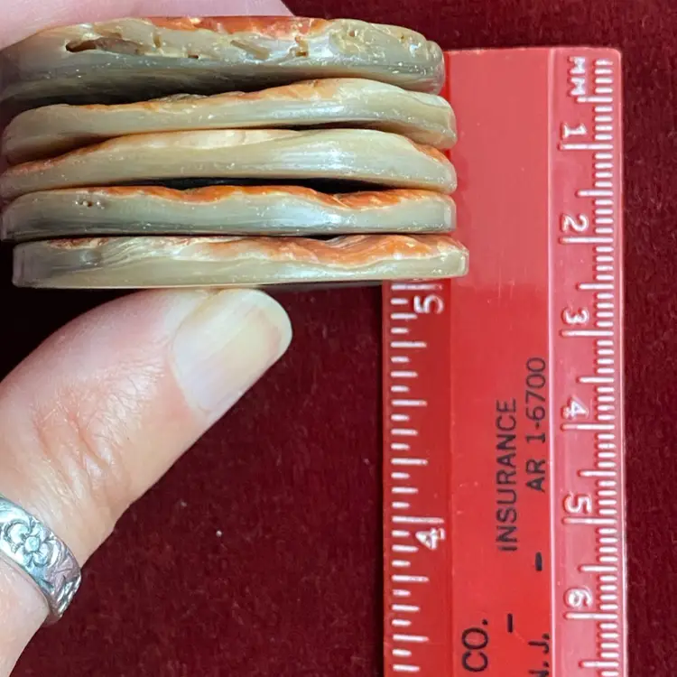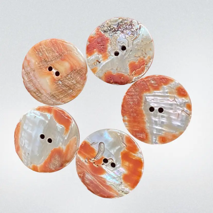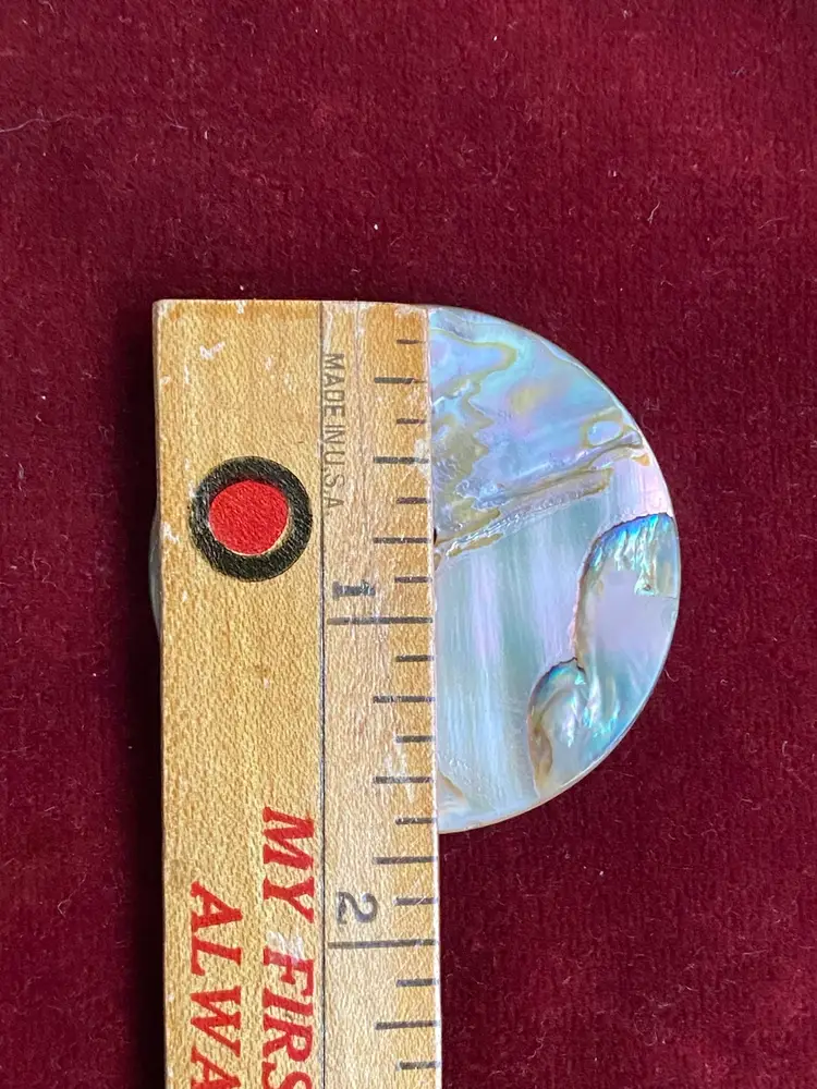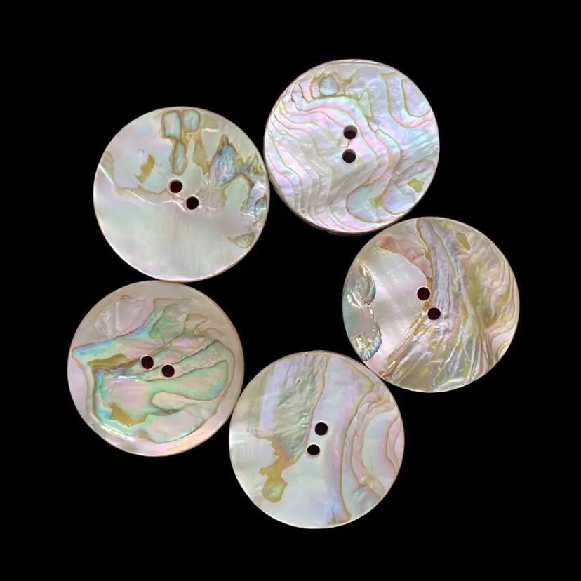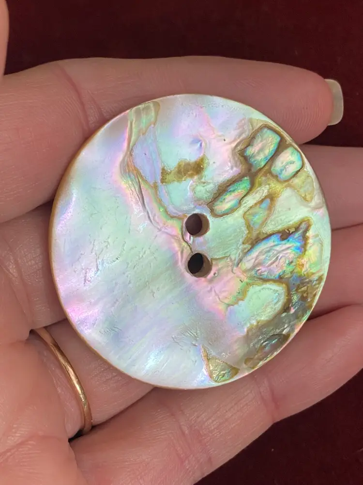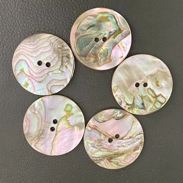 This is a gorgeous lot of (5) polished abalone mother of pearl buttons with fabulous color. They remain natural on the reverse side. Featuring a 2 hole attachment. Size 1.75” diameter. They are approximately 4.7 mm thick. Big and beautiful, these make a real statement on a jacket, coat, knitting project, or other craft project. Each one is unique!