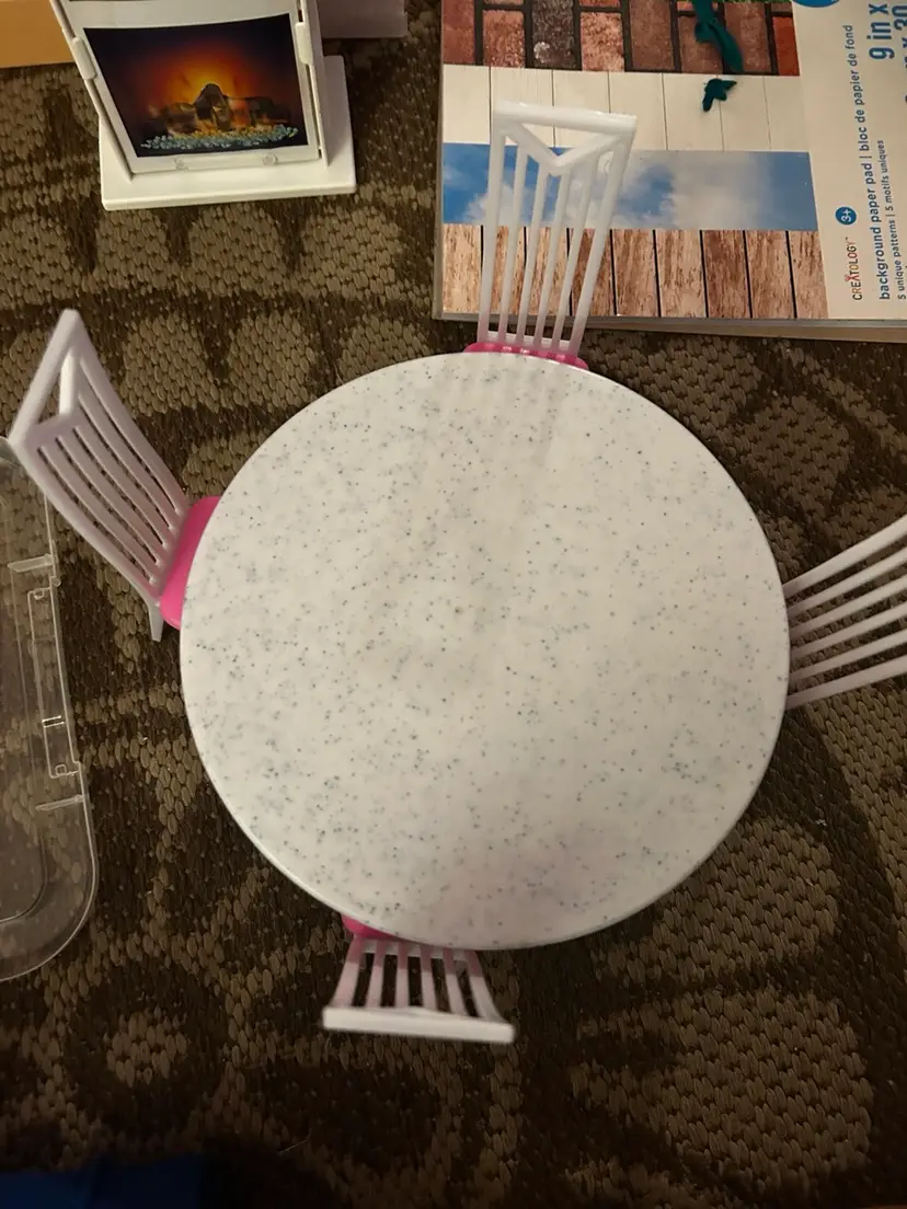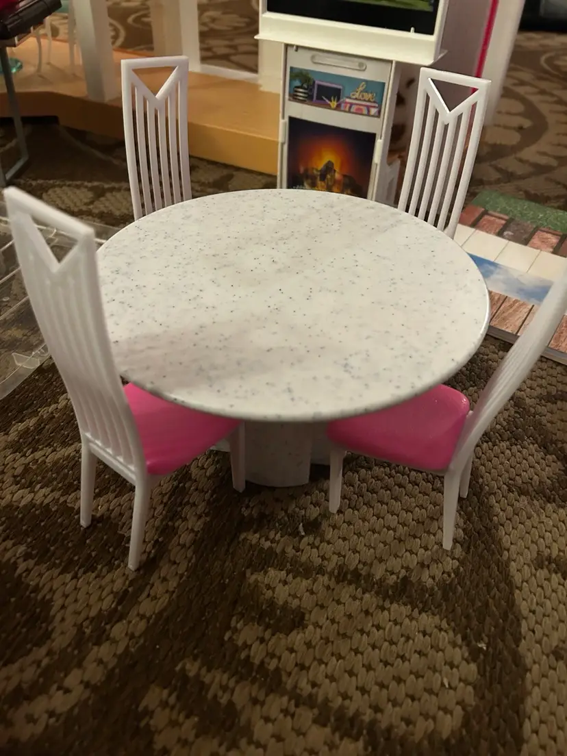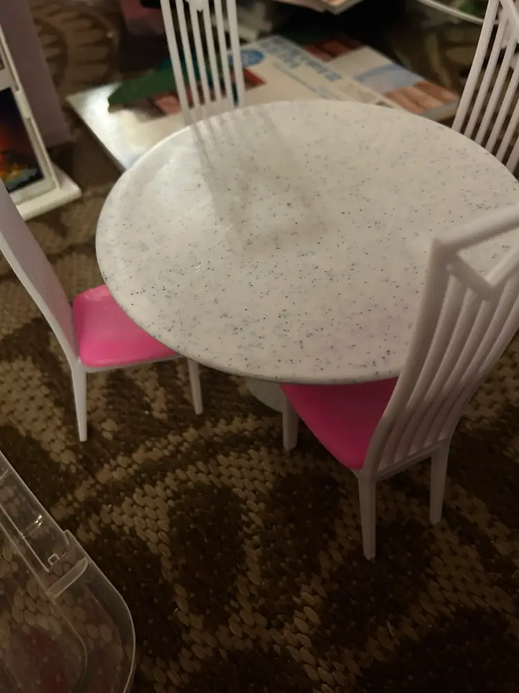 5 piece dining room set for Barbie size or similar dolls. Never used. Includes dining table and four chairs.