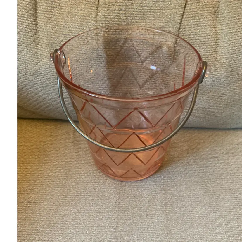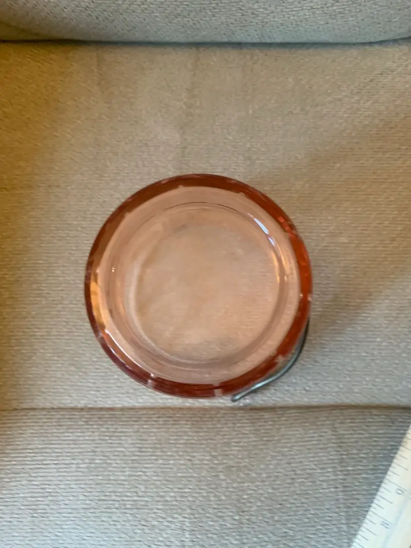 It measures 6 inches tall to the top of the glass and 8 inches if the handle is up. The diameter at the top is about 5 1/2 inches. There are no chips or cracks or markings.