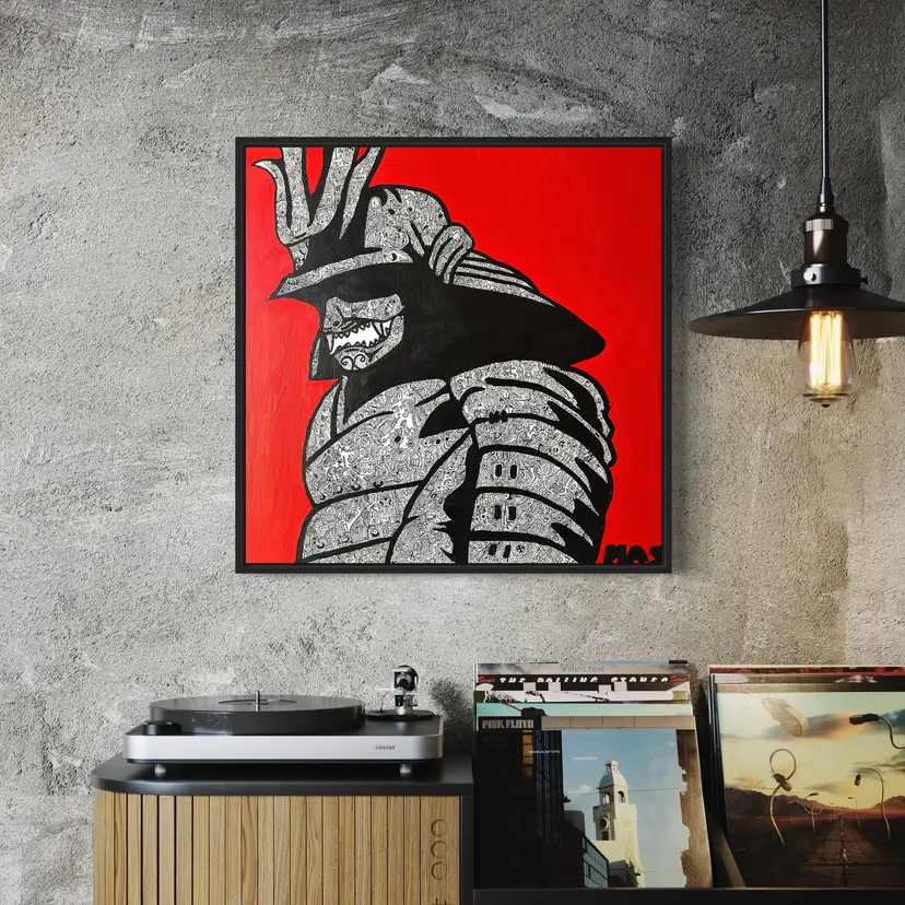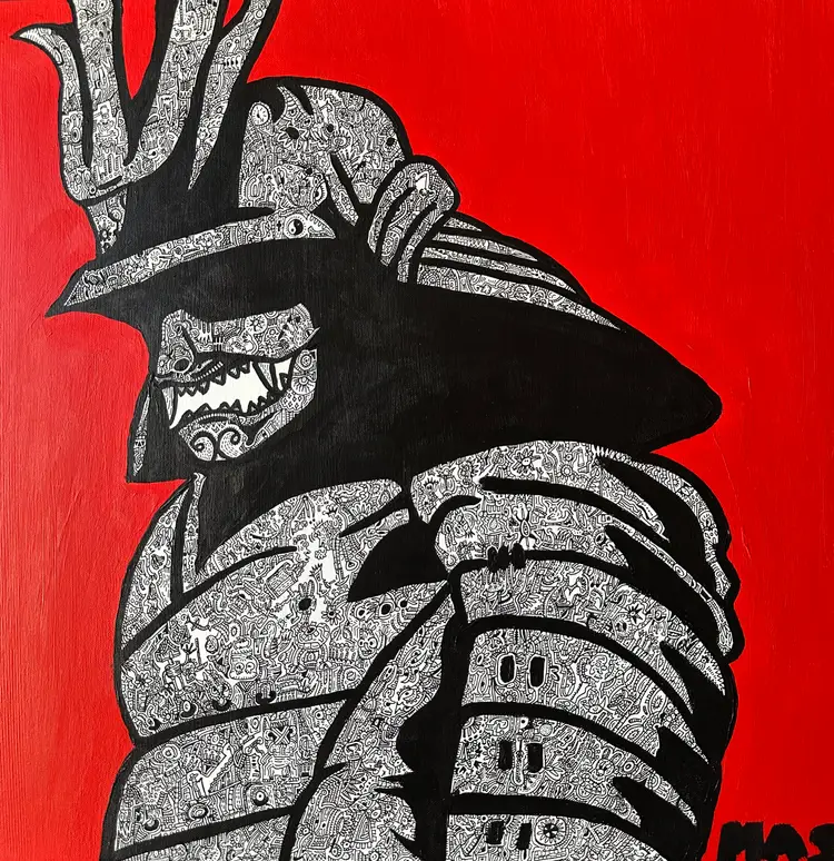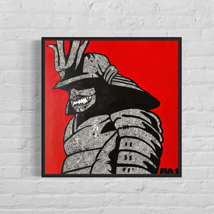 The Samurai in this piece is boldly outlined, but inside it holds intricate stories and characters, reflecting how our inner battles shape the strength we show to the world.