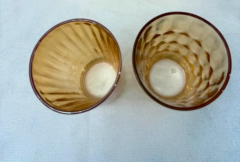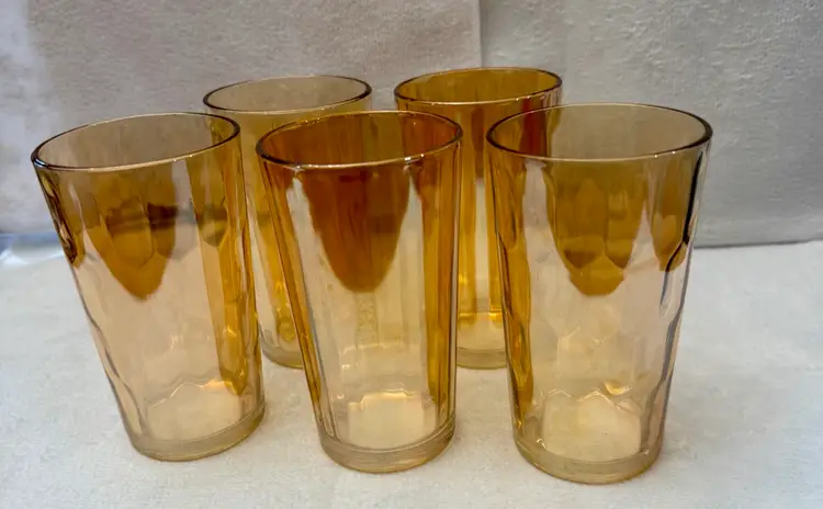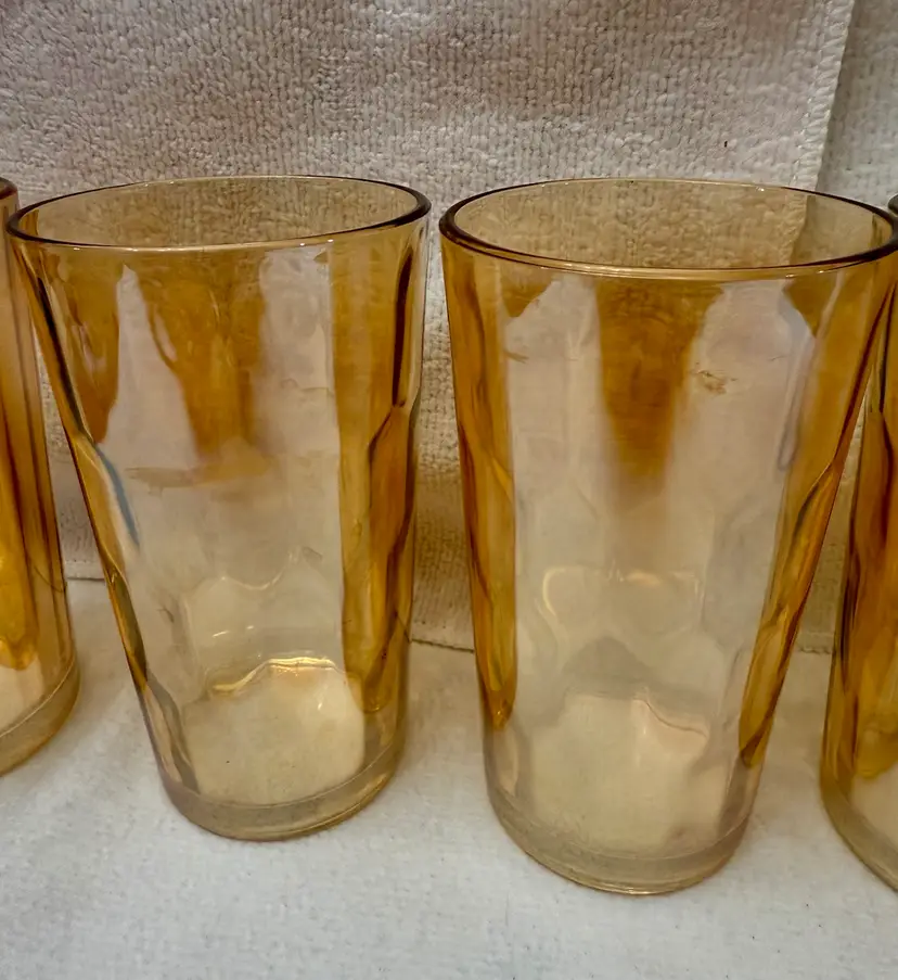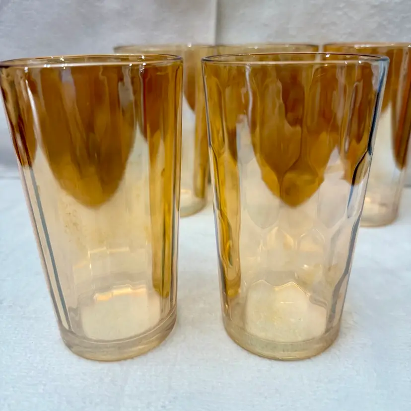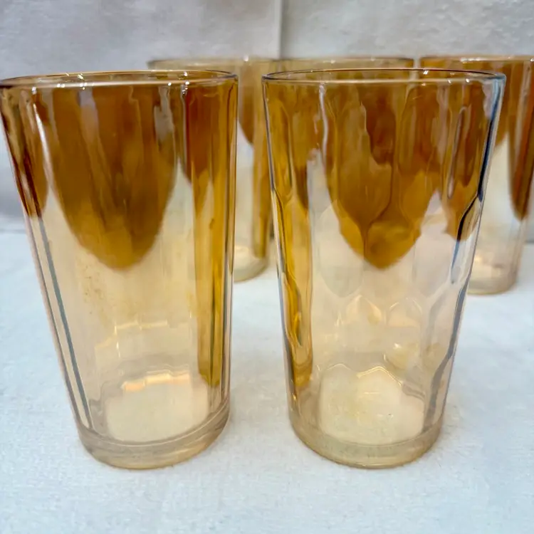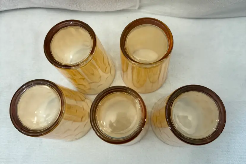 This type of glassware is characterized by its iridescent, metallic sheen, achieved through the application of metallic oxides during the firing process. made in USA. Beautiful set with no chips cracks or scratches. measurements diameter is 2 3/4 5 inches tall the bottom is 2 3/4 in diameter. Excellent condition look at them close. you can see some two of them are a striped pattern. Three of them are in a ripple patter.