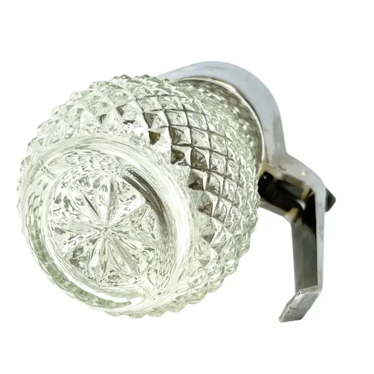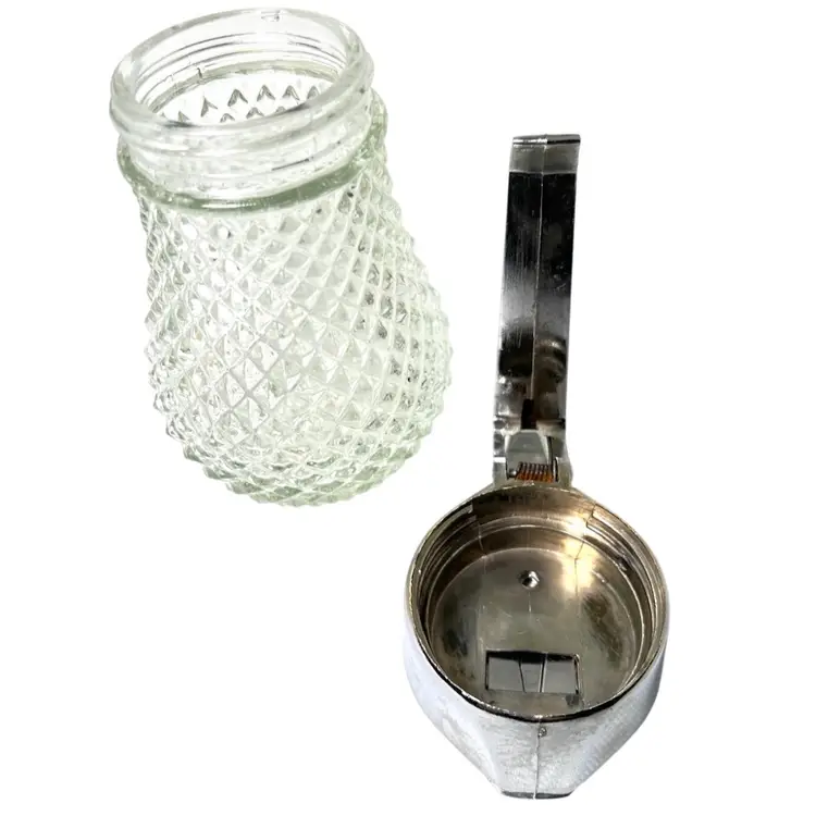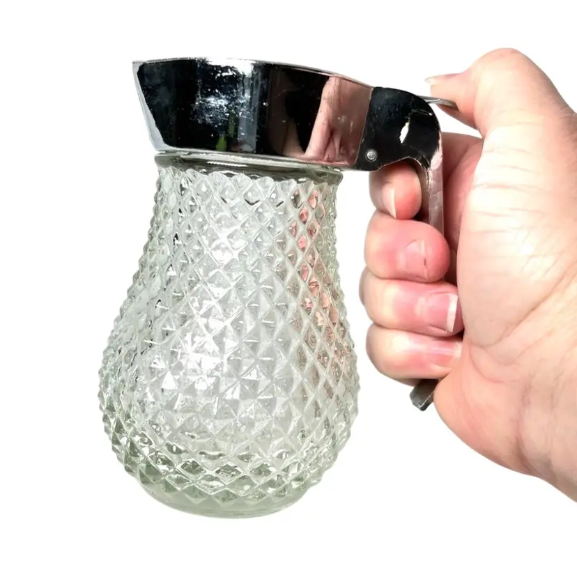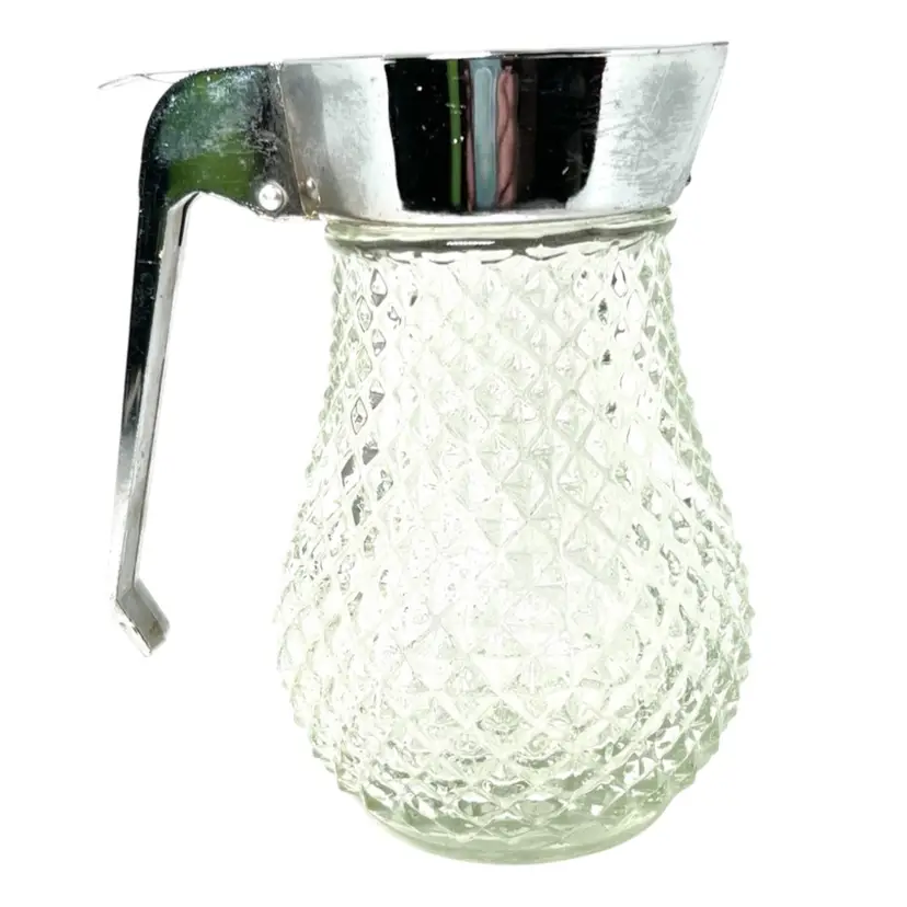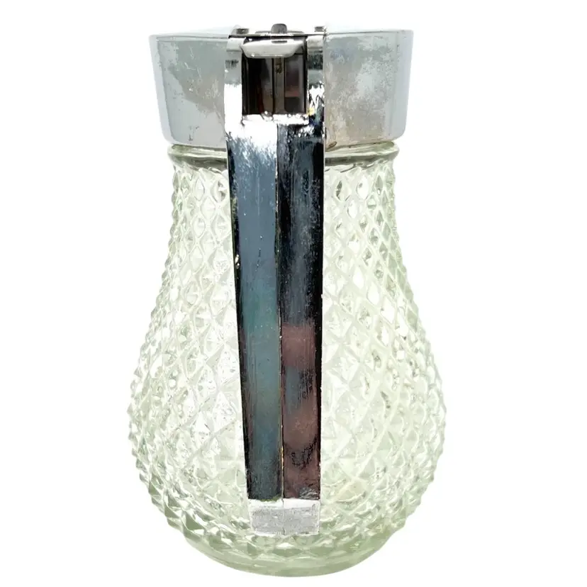 Vintage Syrup Honey Dressing Dispenser. Clear Glass Diamond Point Pattern. Easy Open & Strong Lever Action. Handled lid is steel & chrome-covered plastic. Clean & Ready To Use. Weighs 10 ounces 5” tall x 2-1/4” across top x 3” widest part of body. Condition: No chips, no cracks to diamond points. One tiny chip on interior rim (See last photo closeup). Some chrome scratching and peeling on lid & handle (see next to last photo). Does not affect function. Strong spring for lever but a little surface rusted (see closeup photo).
