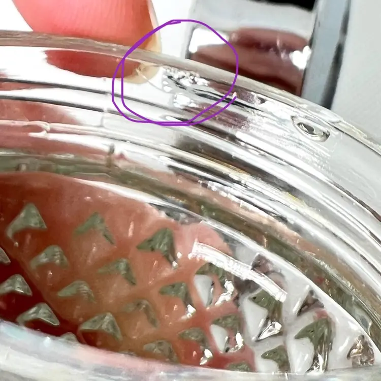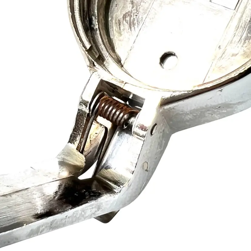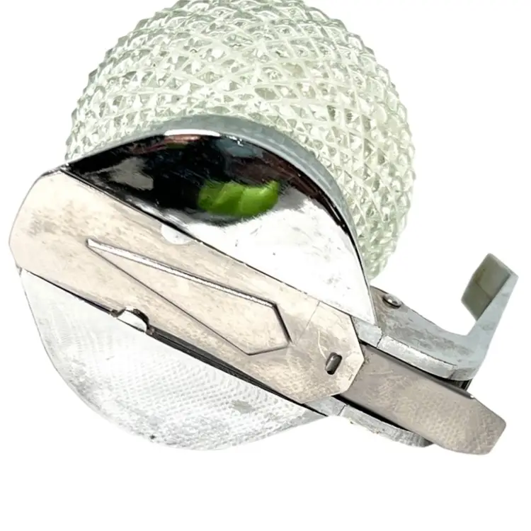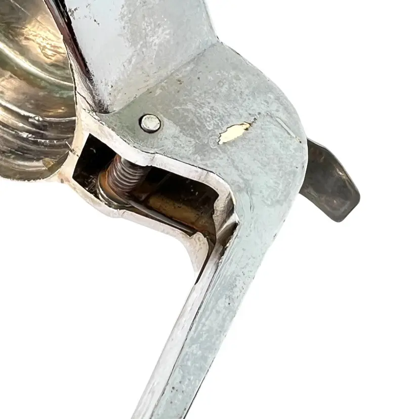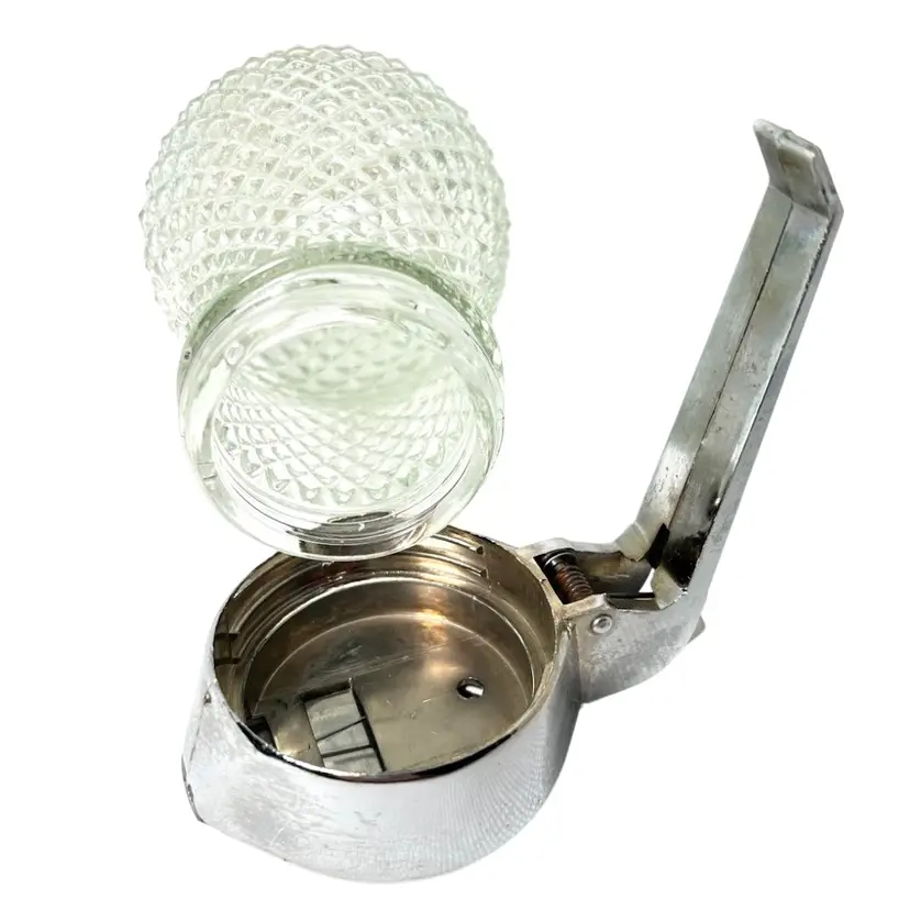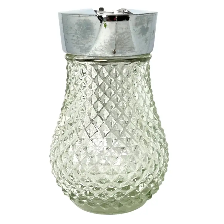 Vintage Syrup Honey Dressing Dispenser. Clear Glass Diamond Point Pattern. Easy Open & Strong Lever Action. Handled lid is steel & chrome-covered plastic. Clean & Ready To Use. Weighs 10 ounces 5” tall x 2-1/4” across top x 3” widest part of body. Condition: No chips, no cracks to diamond points. One tiny chip on interior rim (See last photo closeup). Some chrome scratching and peeling on lid & handle (see next to last photo). Does not affect function. Strong spring for lever but a little surface rusted (see closeup photo).