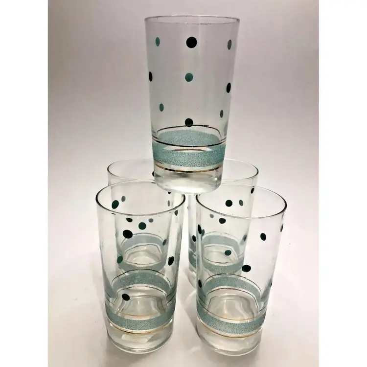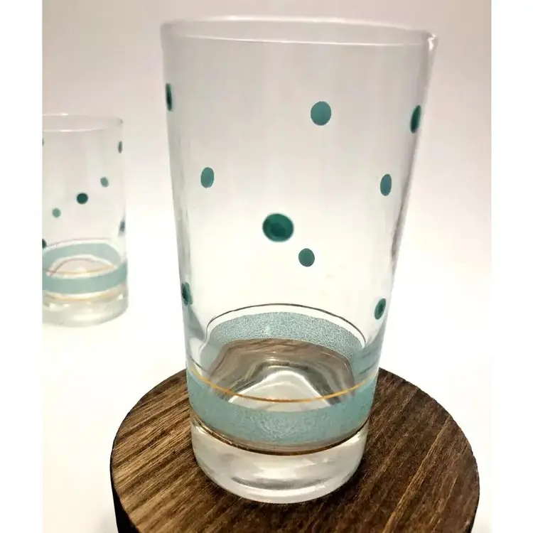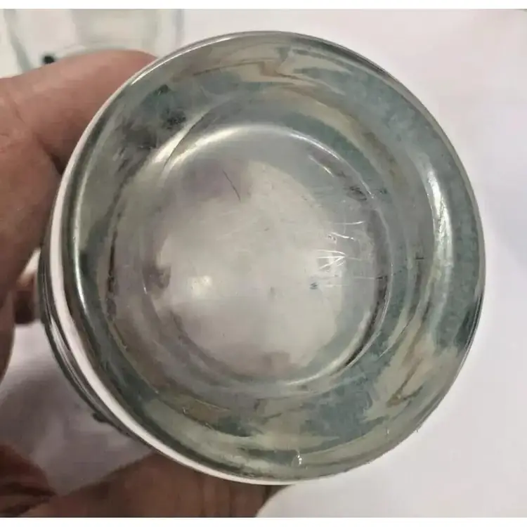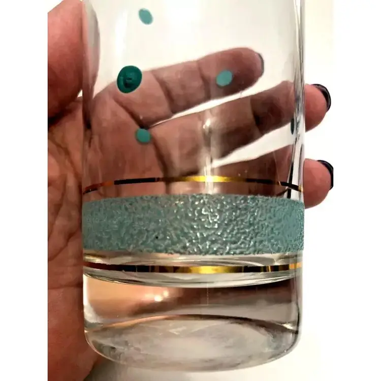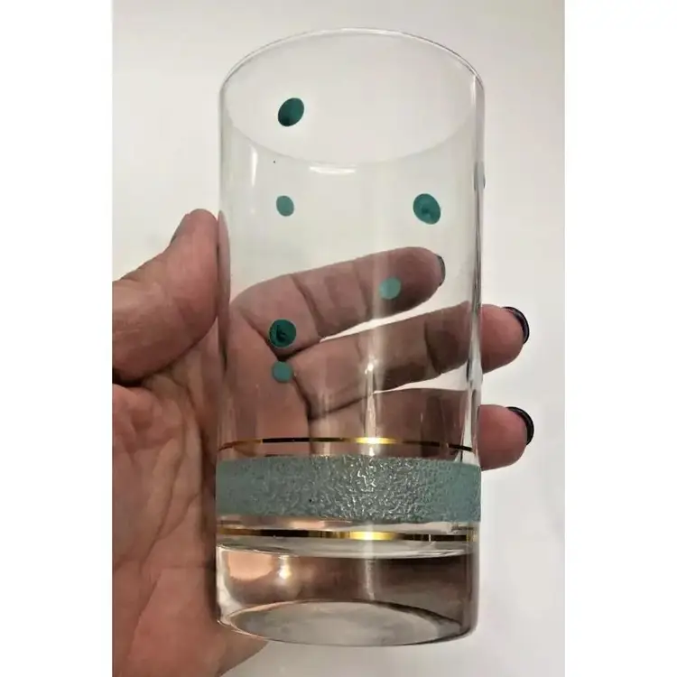 5" tall x 2.5" diameter at mouth. No chips, no cracks. Some wear to the bands. Blue band has a pebble texture.