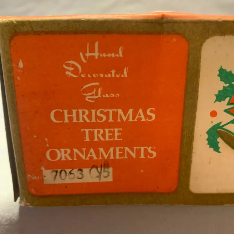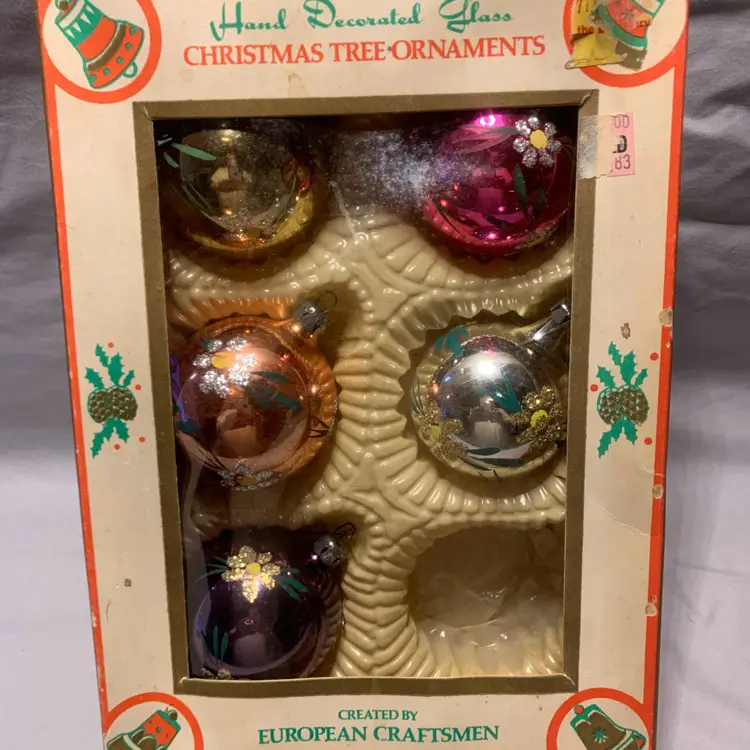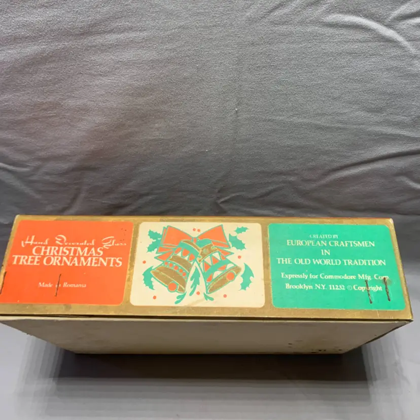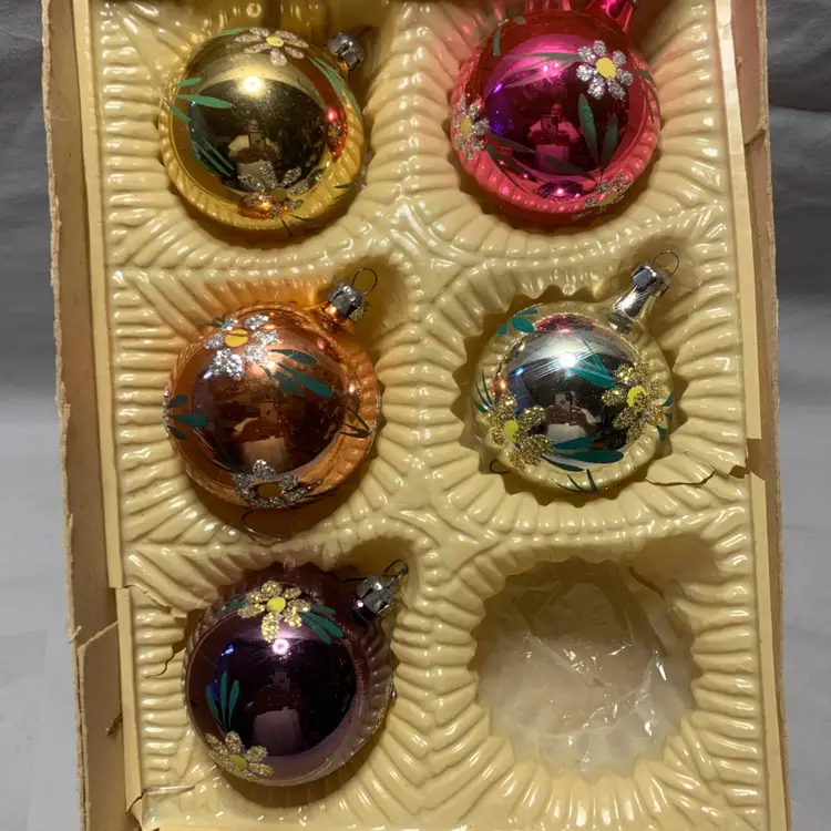 This product is a set of 5 vintage Christmas tree hand-decorated glass ornaments. Each ornament is small, round in shape, and features a colorful all-over pattern. Made of glass and produced in Romania in the 1990s, these ornaments are part of a collection and are original, with a vintage theme perfect for adding a nostalgic touch to your holiday decor. Ideal for collectors or those looking to add a unique and classic touch to their Christmas decorations.