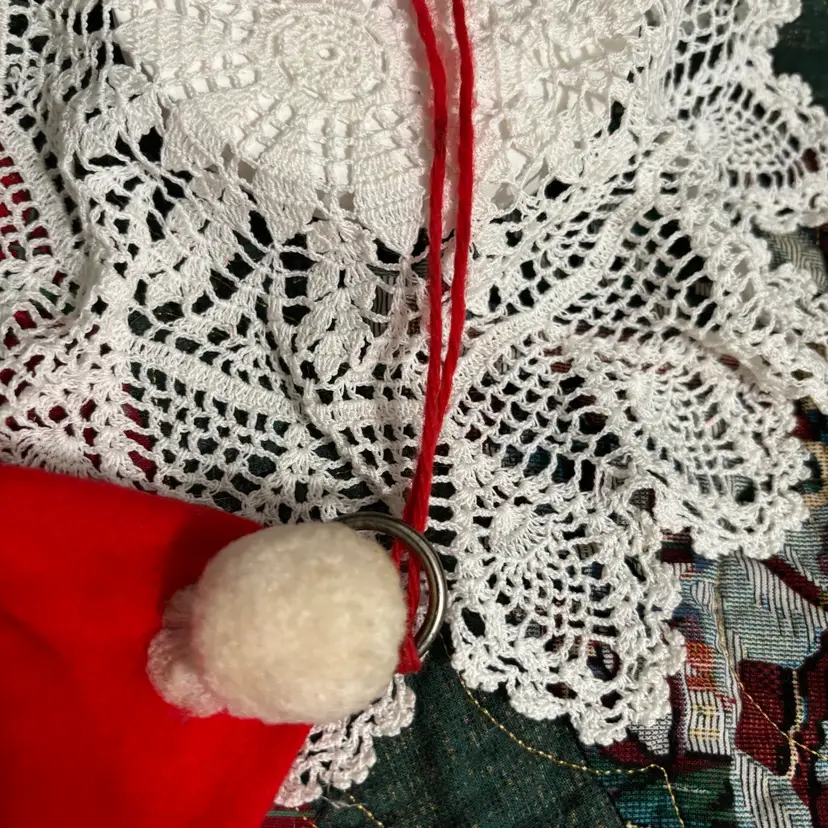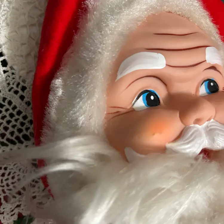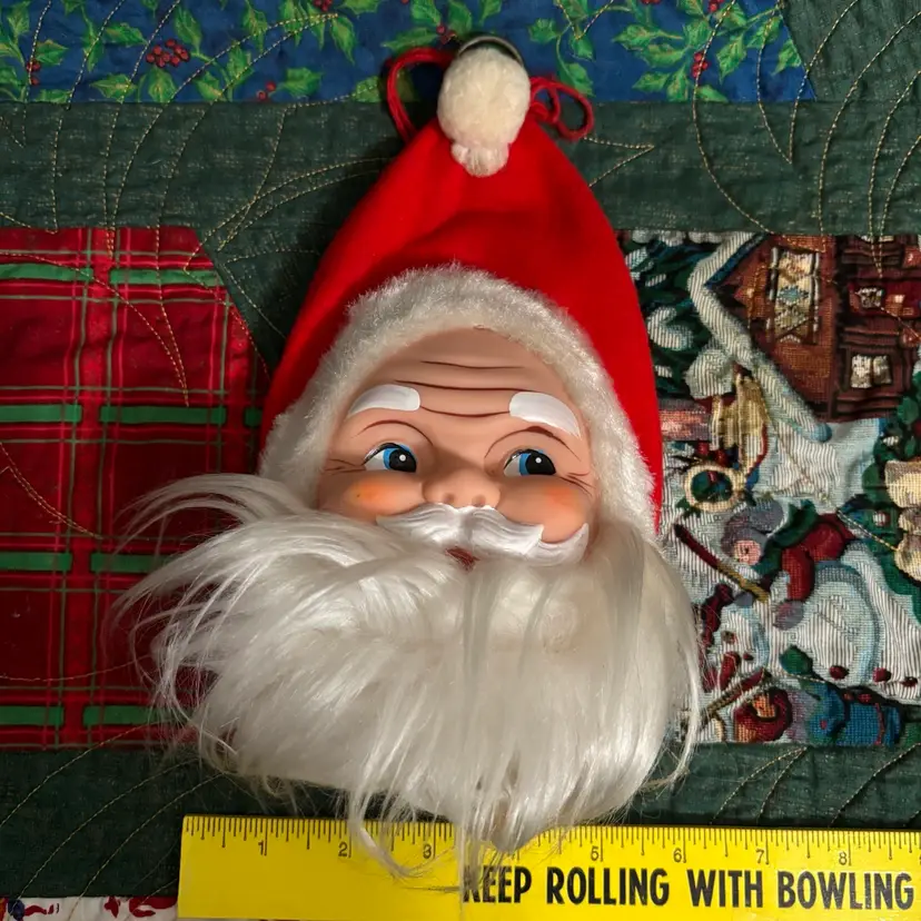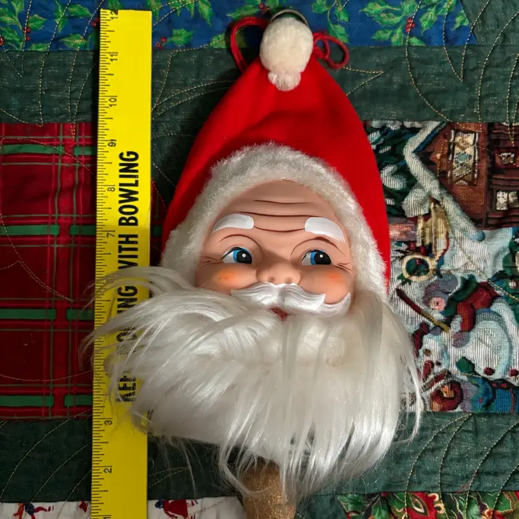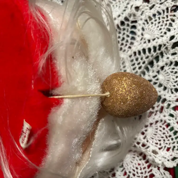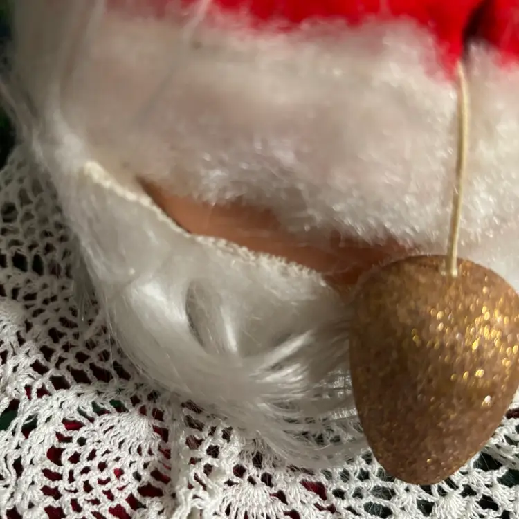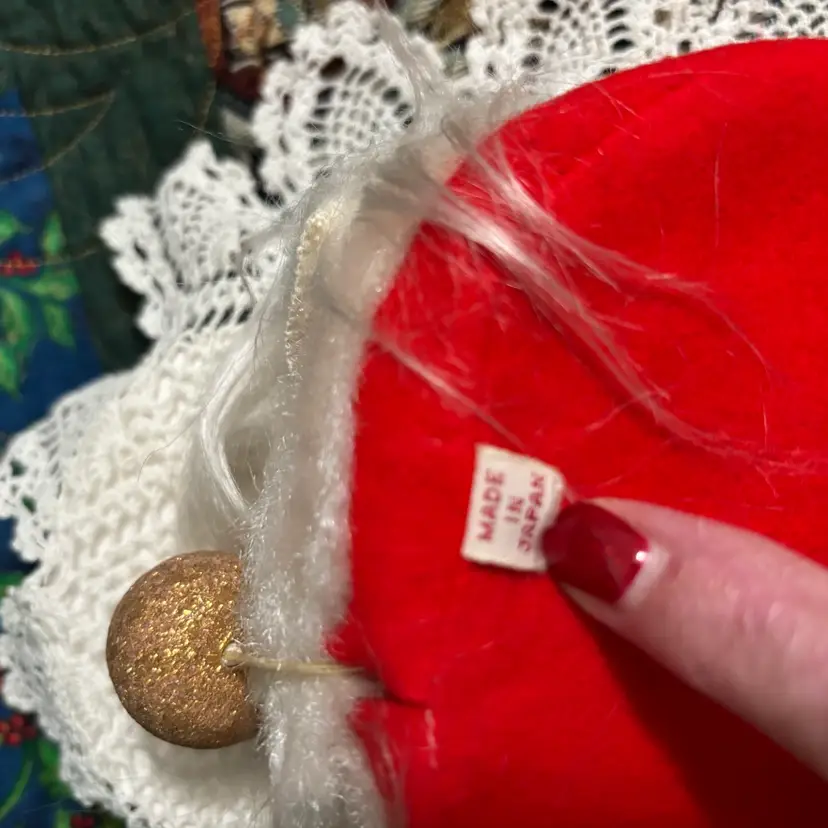 When you pull down knob on string, this musical Santa plays Jingle Bells. Marked Japan. MCM. Felt . Very small mark on cheek. No stains or discoloration. Nice condition.
