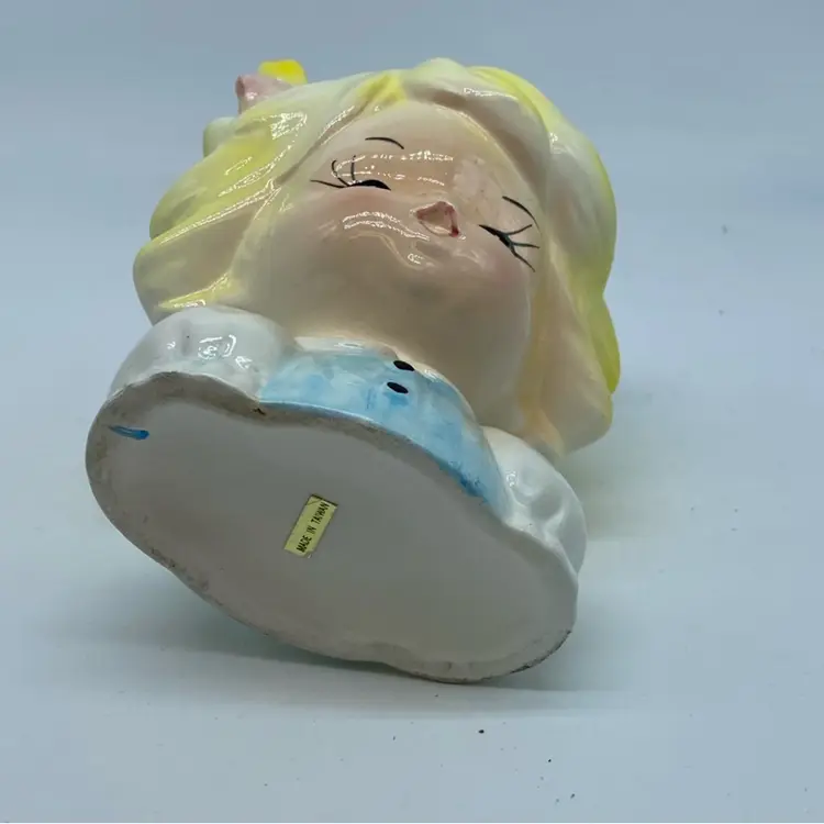 5” tall. No chips or cracks. Ceramic production in Taiwan saw a significant increase in the latter half of the 20th century, often catering to export markets with decorative and functional items. Many factories produced figurines, planters, and tableware in styles that were popular internationally, including those inspired by American and Japanese designs. These items became common household decorations, appreciated for their affordability and cheerful aesthetics.