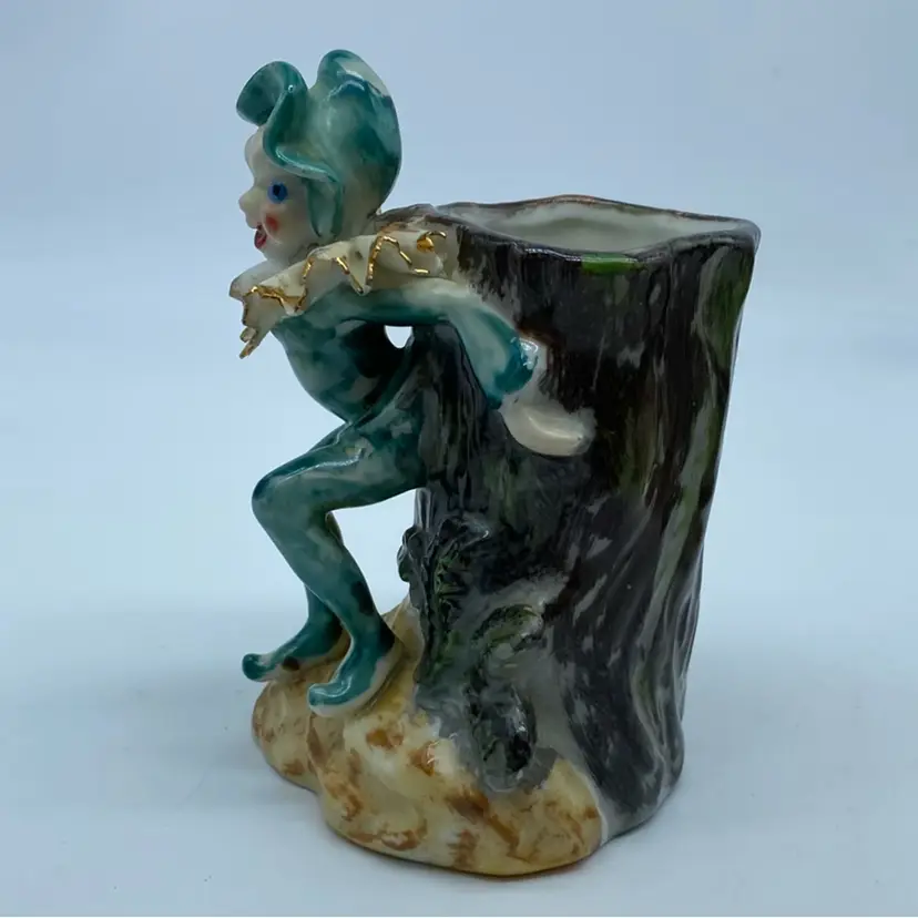 These particular elf or pixie figures, designed to be planters or decorative accents, embody the popular aesthetic of the post-war era. Their playful expressions, colorful attire, and naturalistic bases (tree stumps) reflect a desire for charming, affordable home decor. Such items were popular collectibles, often found in households as decorative pieces or for small plants.
