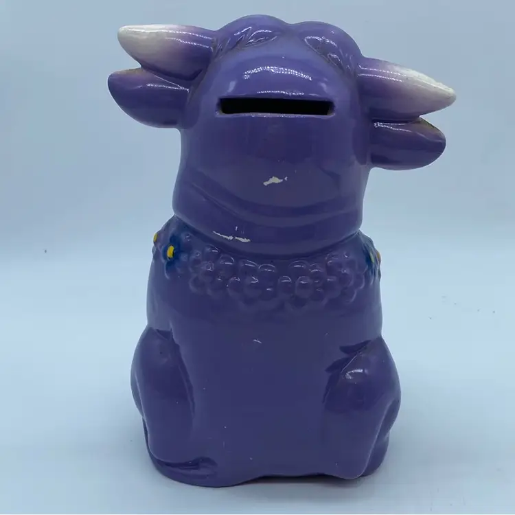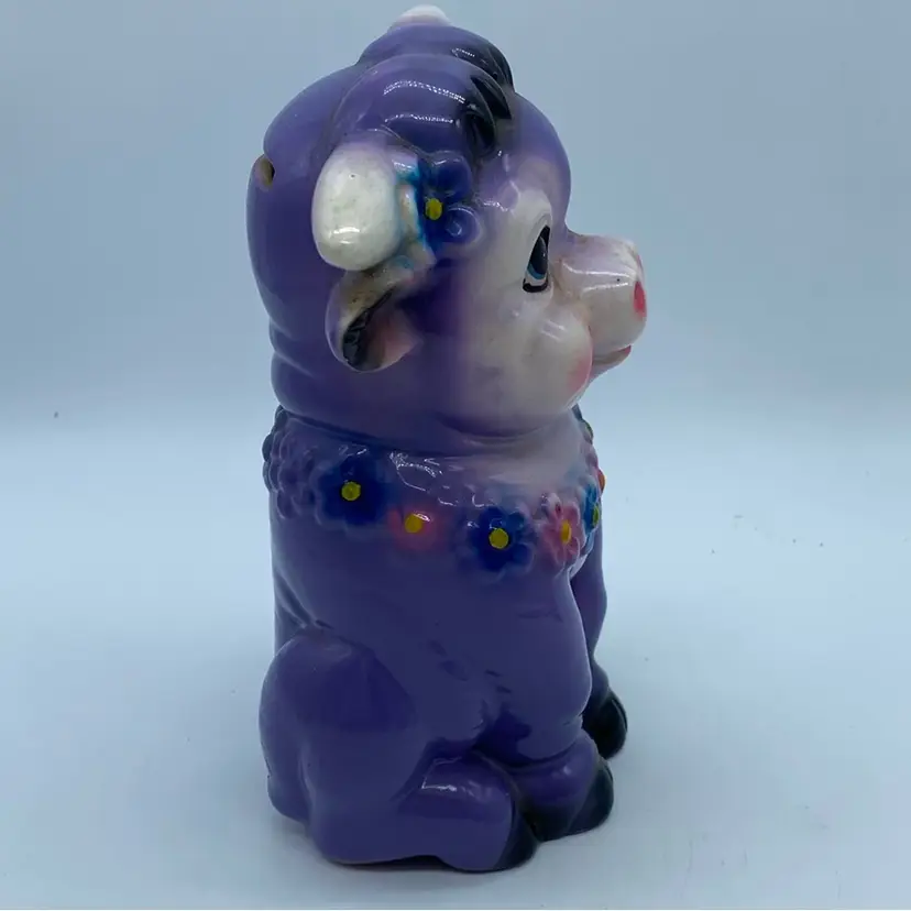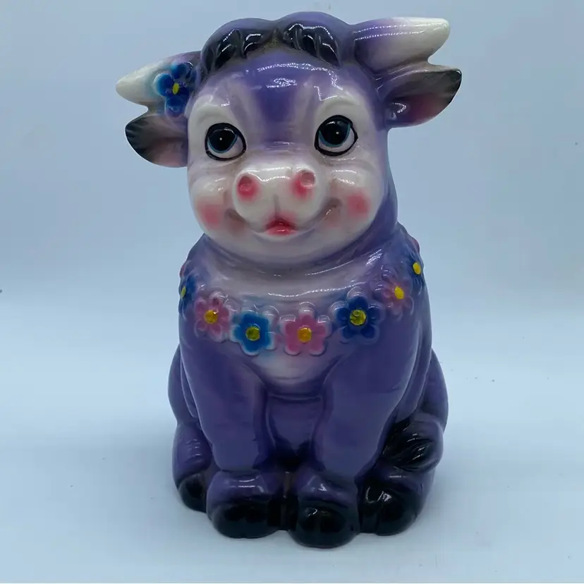 The "Purple Cow" motif, particularly in a kitschy style, suggests a piece that was likely produced during the mid-to-late 20th century, a period known for its abundance of such decorative and functional ceramics. While not always produced by renowned potteries, these items are sought after by collectors who appreciate their unique charm and the era they represent.