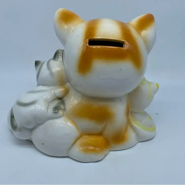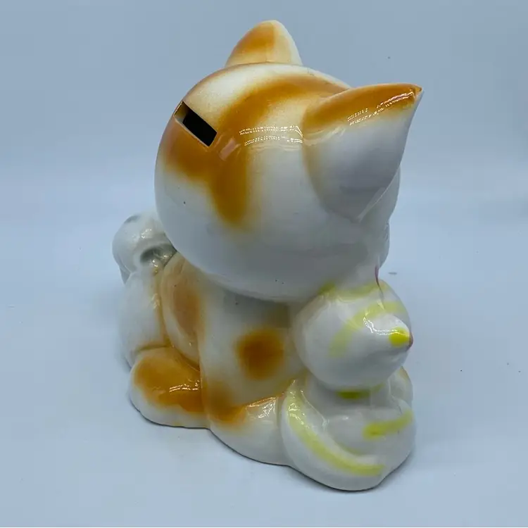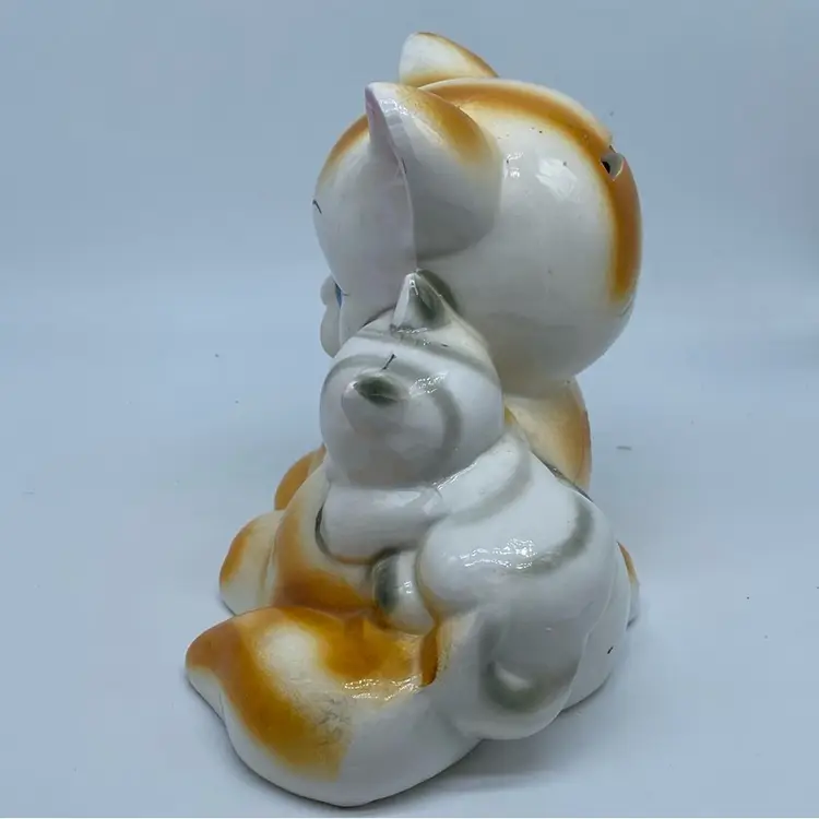 6x8” no chips or cracks. Ceramic figurines depicting animals, particularly cats, gained significant popularity as decorative items and functional pieces like banks throughout the mid-20th century. These items were often mass-produced, with many originating from East Asian countries like Japan and Taiwan, which became major export hubs for decorative ceramics during this period. The style often featured stylized, anthropomorphic features and bright, appealing color palettes to appeal to a wide consumer base.