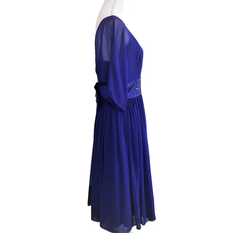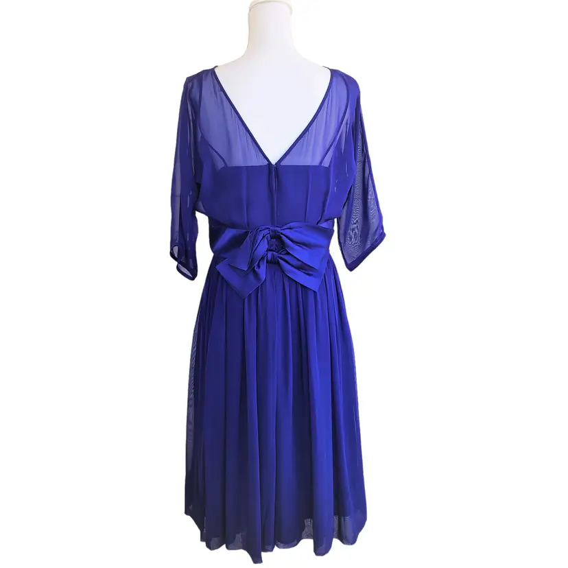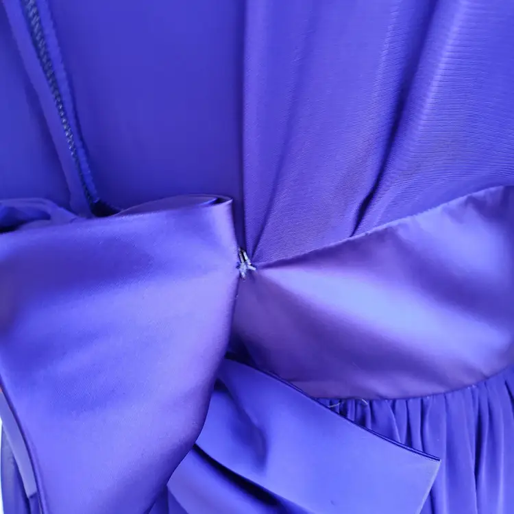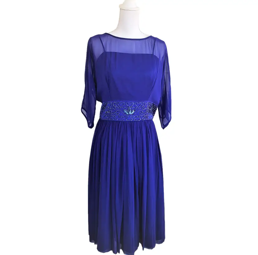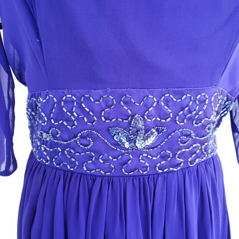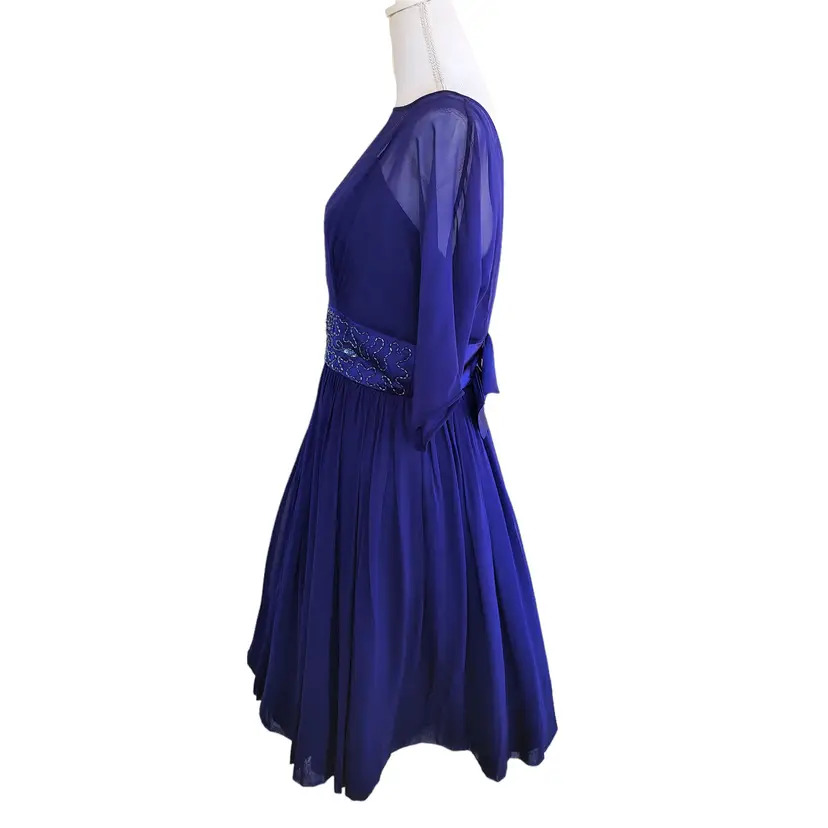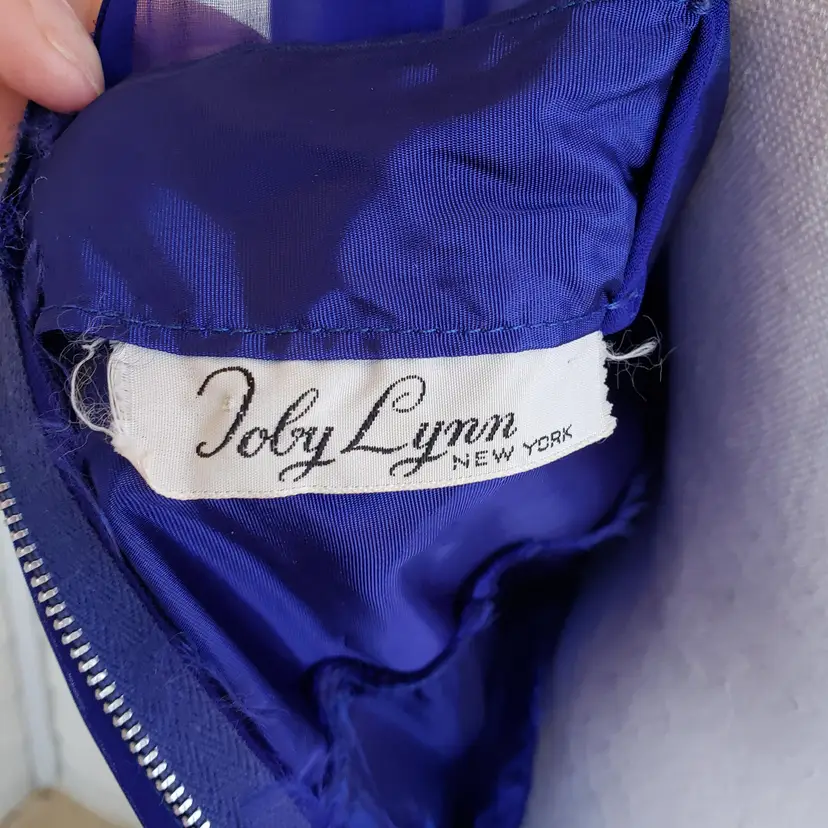 This is a beautiful 50s/60s evening / party dress. I just had this cleaned at the dry cleaners so it is ready to wear. Would fit best a 10 plus or minus based on measurements. Dress label is Toby Lynn New York. It has the AFL-CIO blue union label from the 50s to 1963. Dress has a satin lining and a chiffon outer layer. The waist is embellished with a beautiful beaded design. The belt section starts right below the chest and ends at the natural waist. There is a full metal zipper down the back. The color is a violet blue. The true color shows up best in the close up photos. I love how the skirt fabric moves. In one pic of the side view the wind is blowing it up so you can see how full it goes. There are 2 large bows on the back of the dress which cover the hidden zipper. They are sagging down after the cleaning so they probably should be starched if you want them straight again.