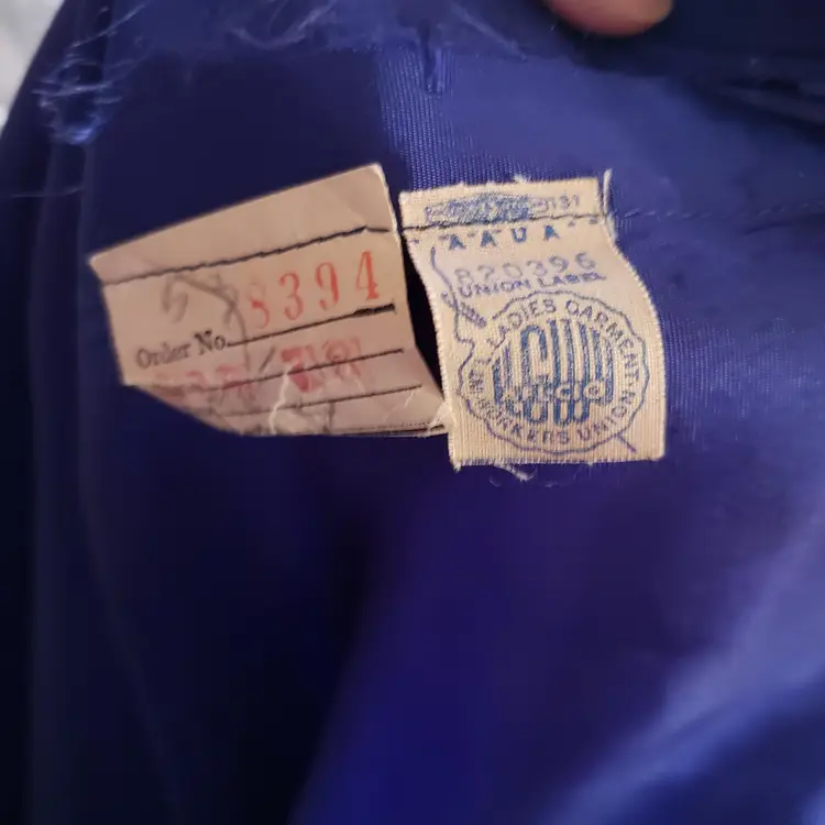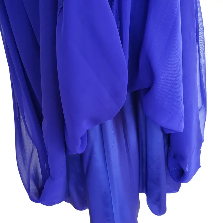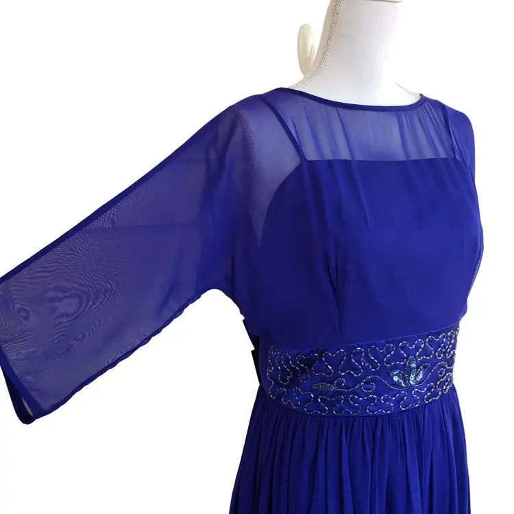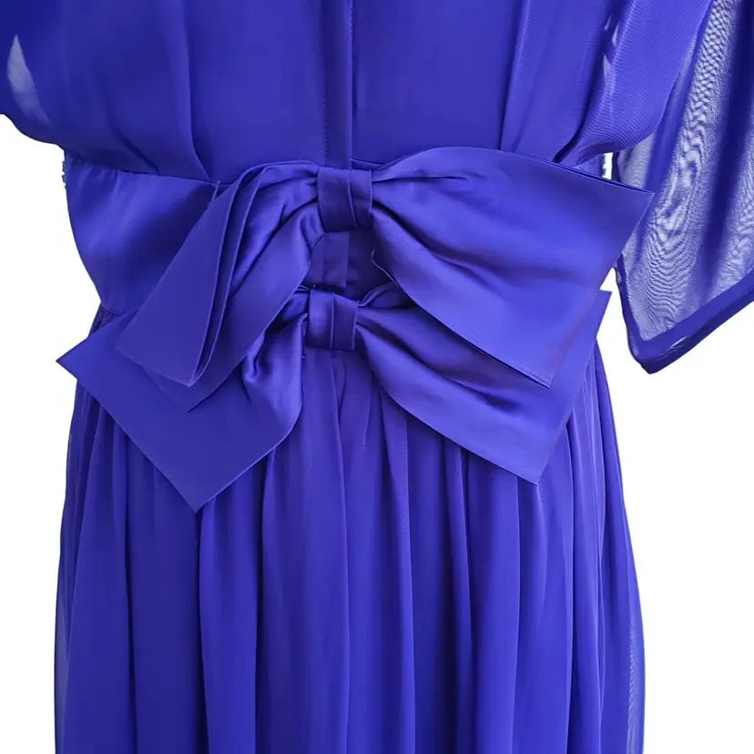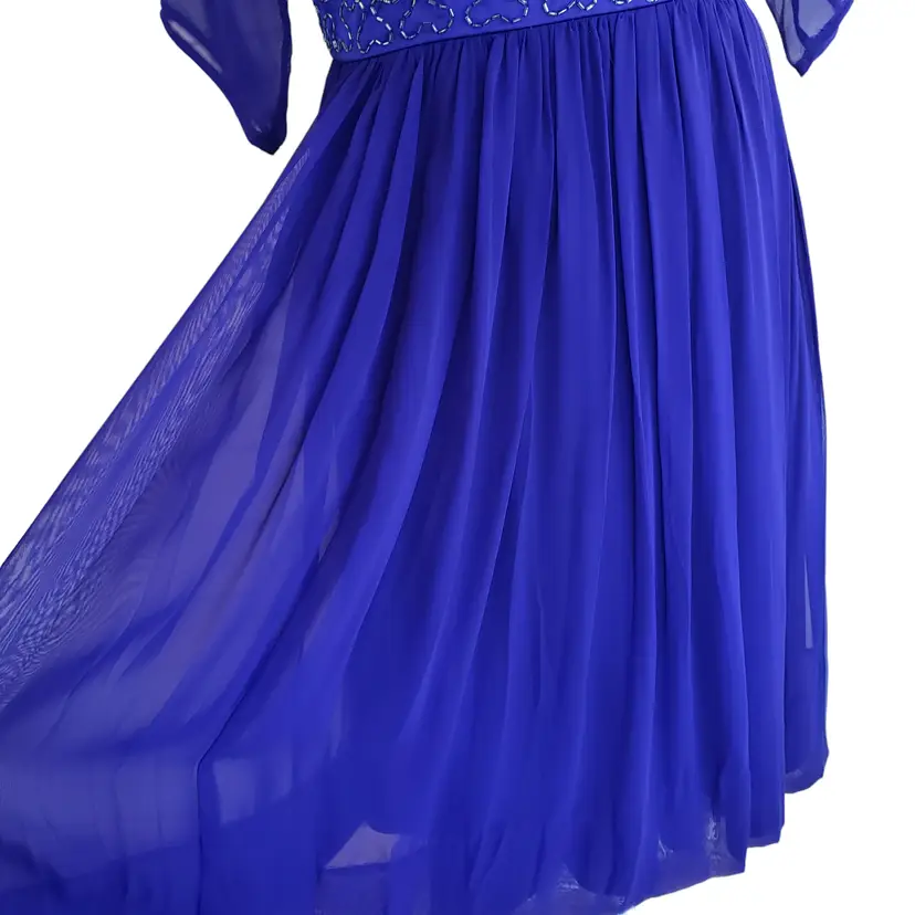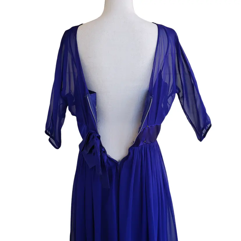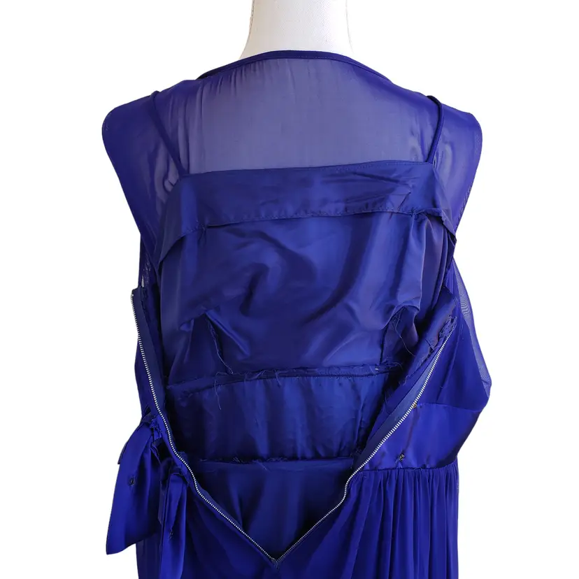 This is a beautiful 50s/60s evening / party dress. I just had this cleaned at the dry cleaners so it is ready to wear. Would fit best a 10 plus or minus based on measurements. Dress label is Toby Lynn New York. It has the AFL-CIO blue union label from the 50s to 1963. Dress has a satin lining and a chiffon outer layer. The waist is embellished with a beautiful beaded design. The belt section starts right below the chest and ends at the natural waist. There is a full metal zipper down the back. The color is a violet blue. The true color shows up best in the close up photos. I love how the skirt fabric moves. In one pic of the side view the wind is blowing it up so you can see how full it goes. There are 2 large bows on the back of the dress which cover the hidden zipper. They are sagging down after the cleaning so they probably should be starched if you want them straight again.