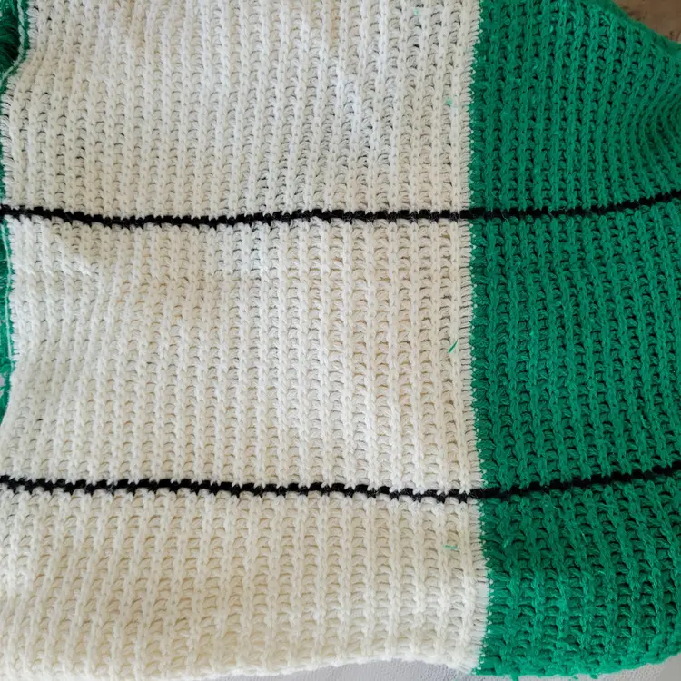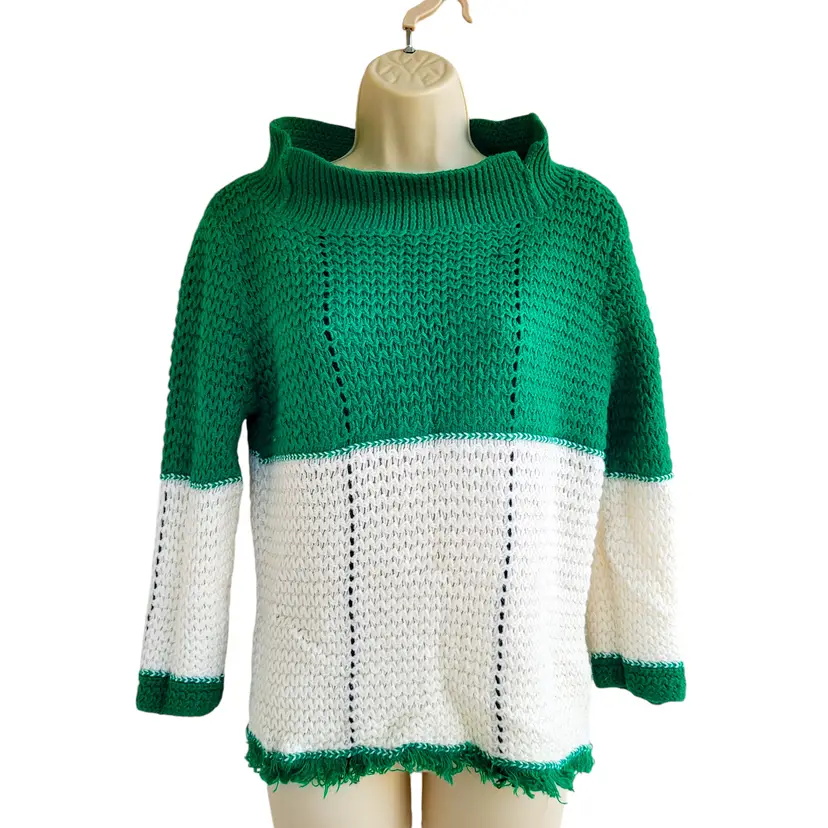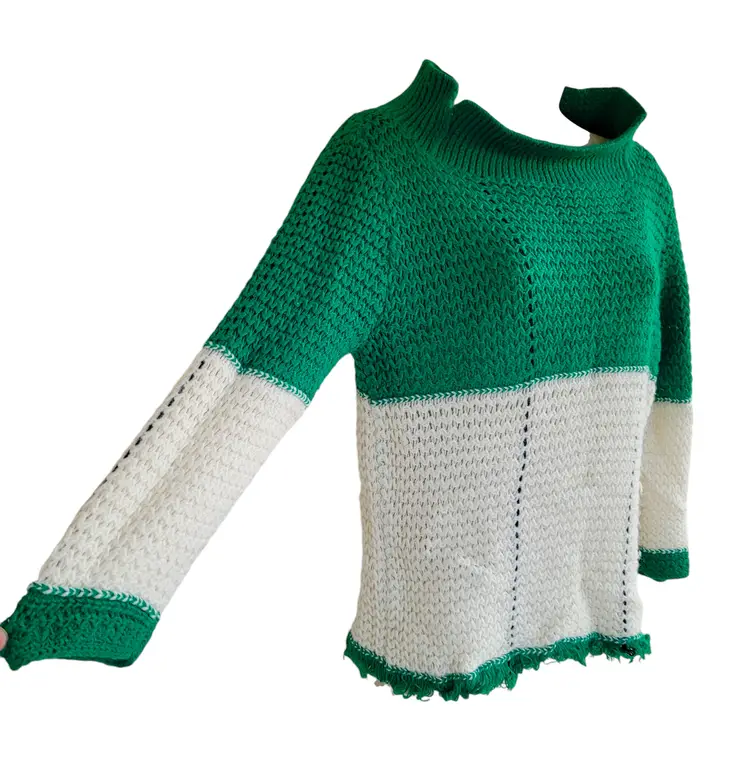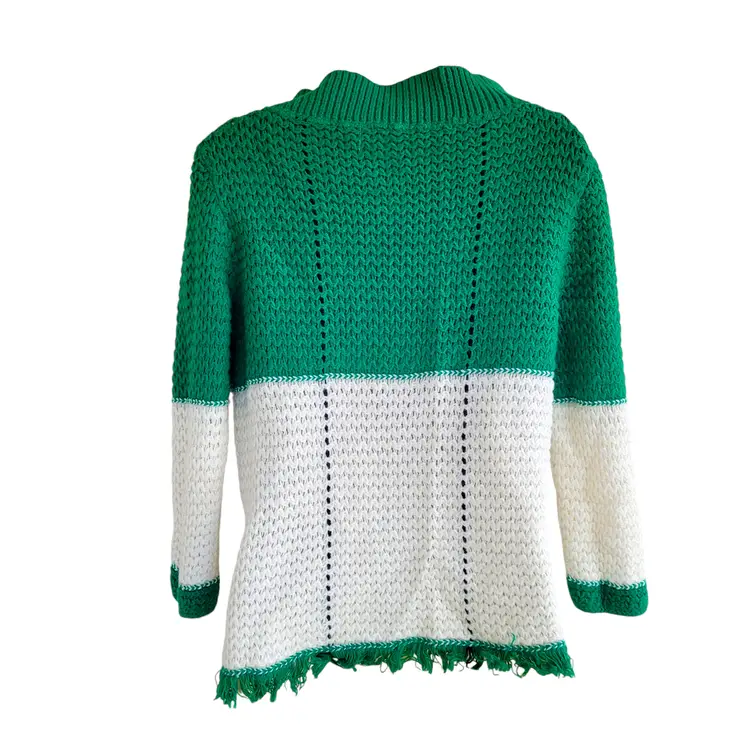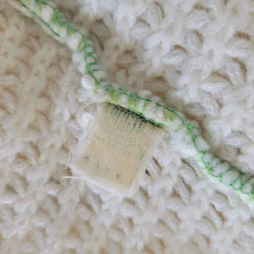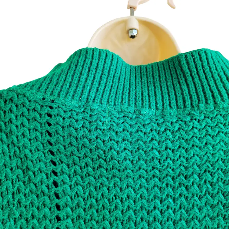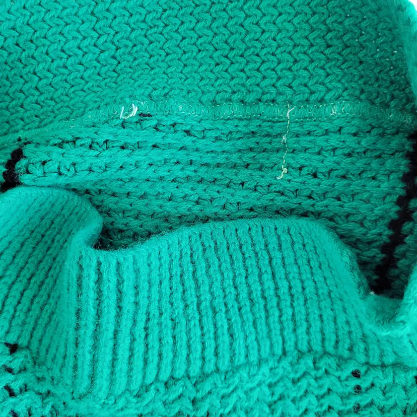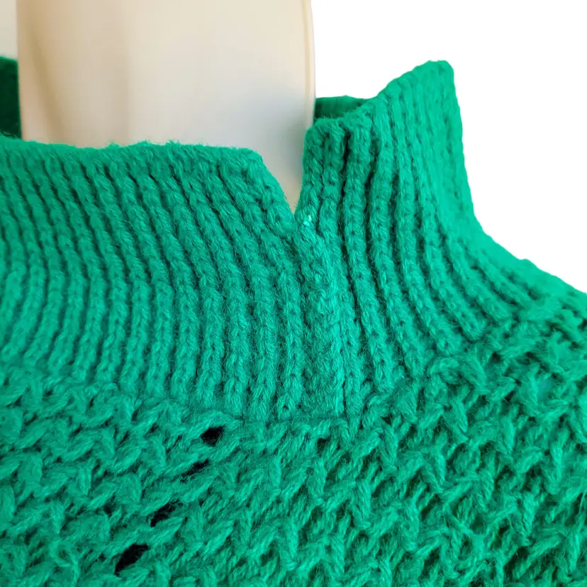 The green in this vintage sweater are nice and vivid. I tried to get the correct shade of the green in some of the first photos. The label in the seam is the blue AFL-CIO Union label used from 55-63. It has some fading, but it can still be read. Looks like there used to be a brand tag in the neck that was removed. The wide open neck has a 2.5" high collar on it. (not sure what this type of collar is called!) The knitting in this is fairly large so you may want to wear something under it. This is in pretty nice condition for its age. The fringe on the bottom is a bit disheveled. No size tag but would fit a smaller size.