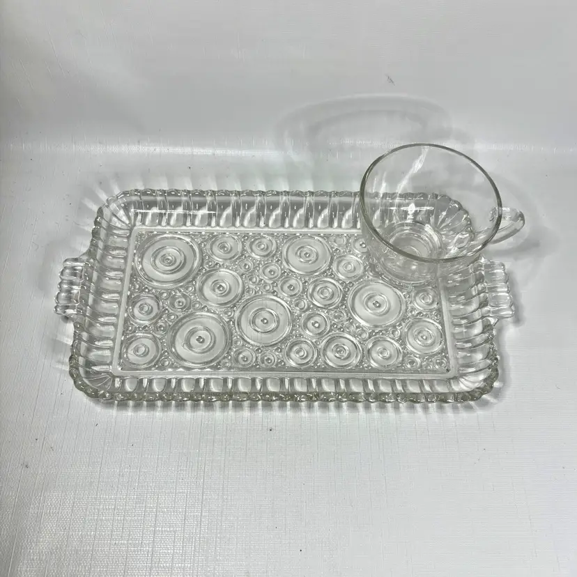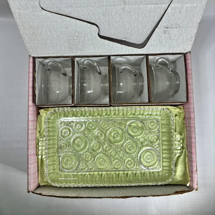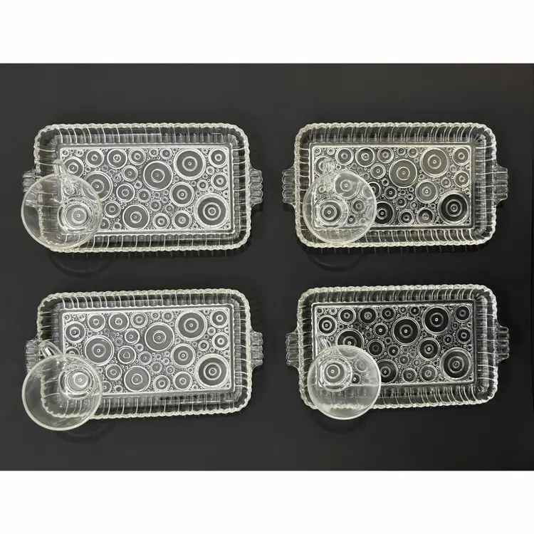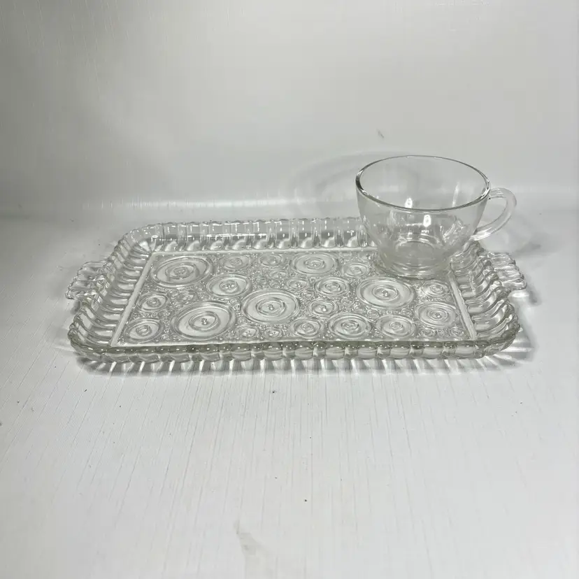Set includes 4 plates and 4 coffee cups, clear glass.