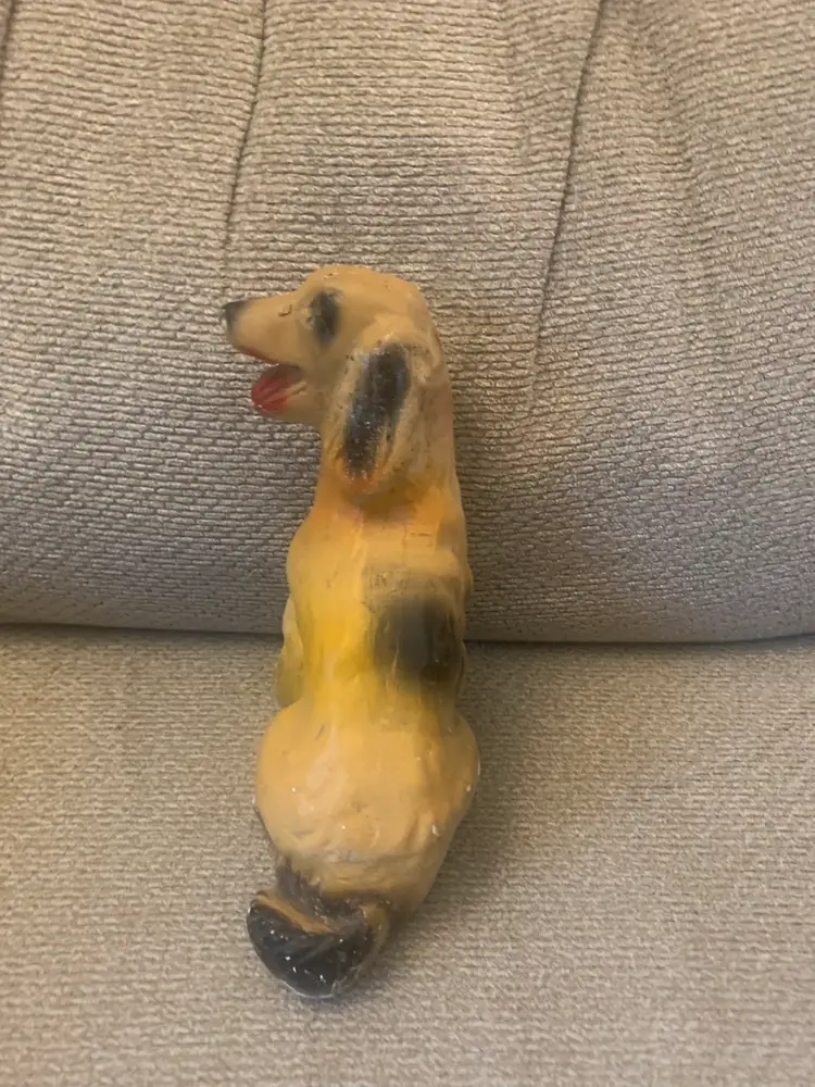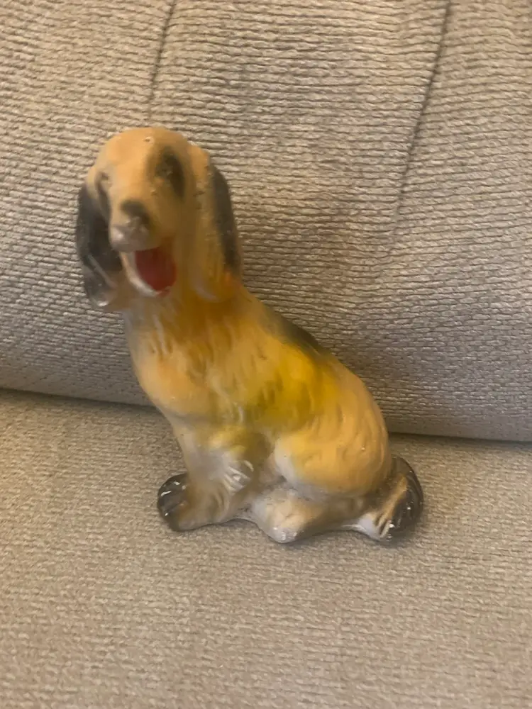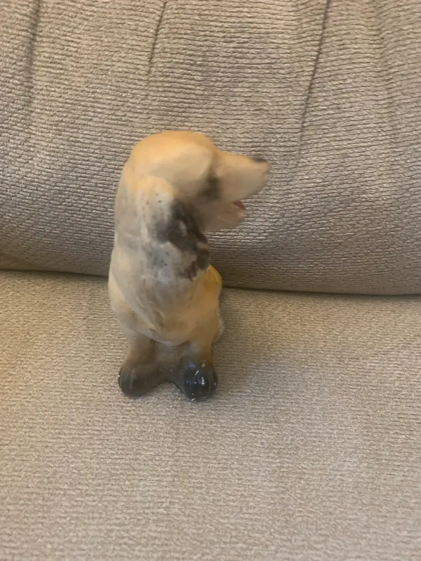 This dog is a little less than 7 inches tall and 3 inches 3. He has a little paint loss and no chips or cracks.