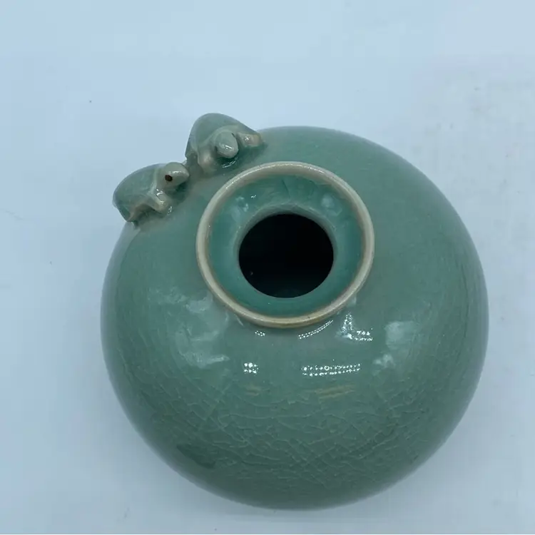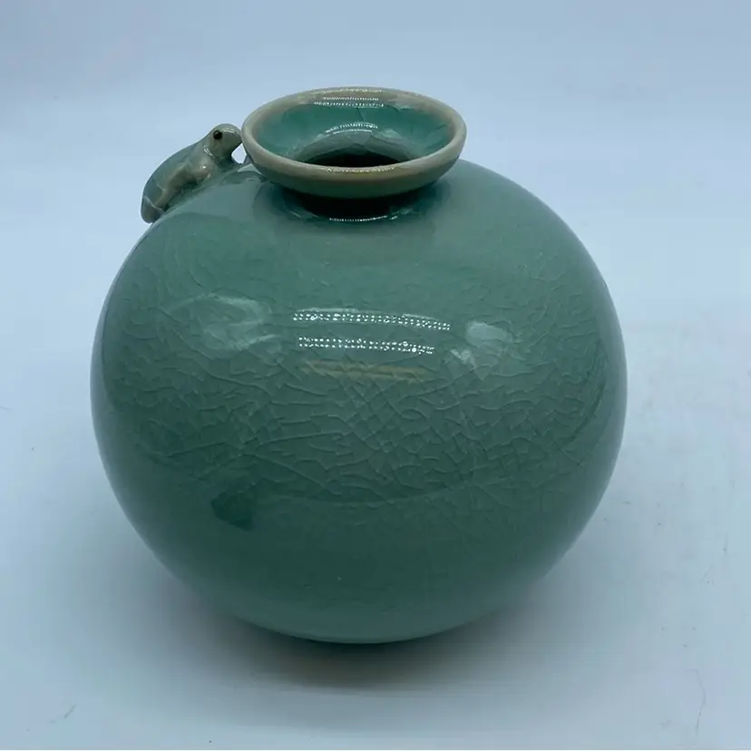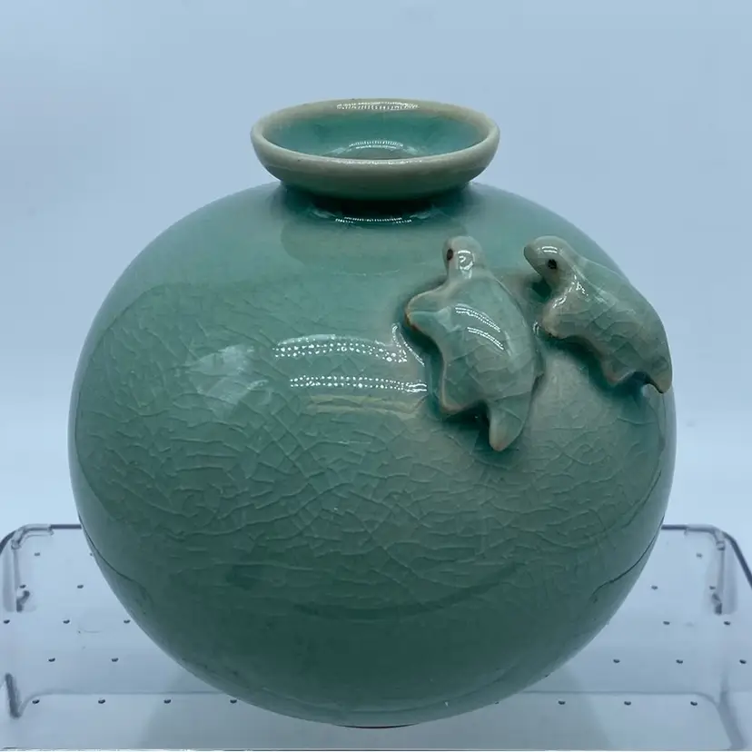 Korean Goryeo celadon is particularly renowned for its exquisite craftsmanship, elegant forms, and the development of inlaid (sanggam) and incised decoration techniques. The application of three-dimensional motifs, such as the turtles seen on this vase, was also a feature of Goryeo celadon, adding a lively and decorative element. These vases were highly prized for their beauty and were exported throughout East Asia.