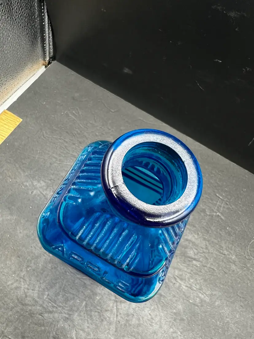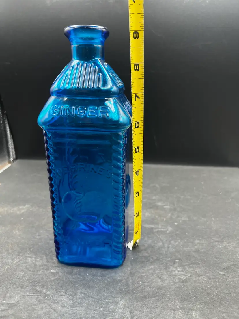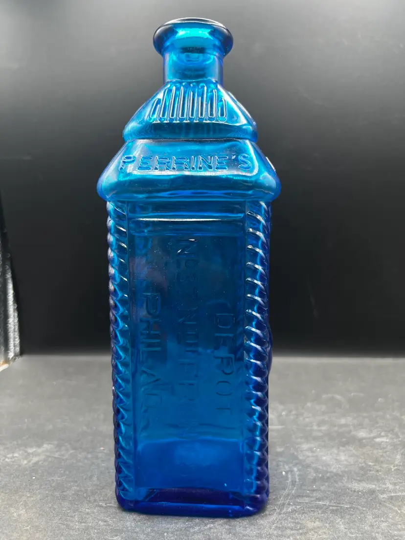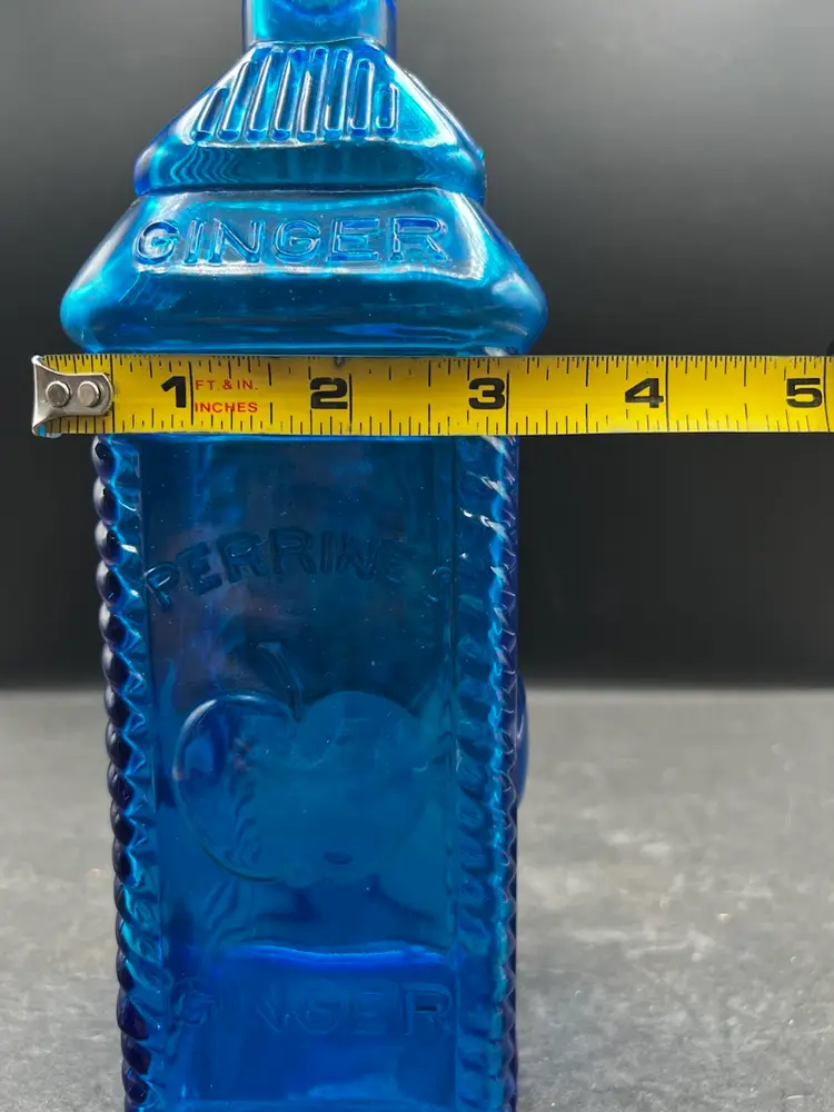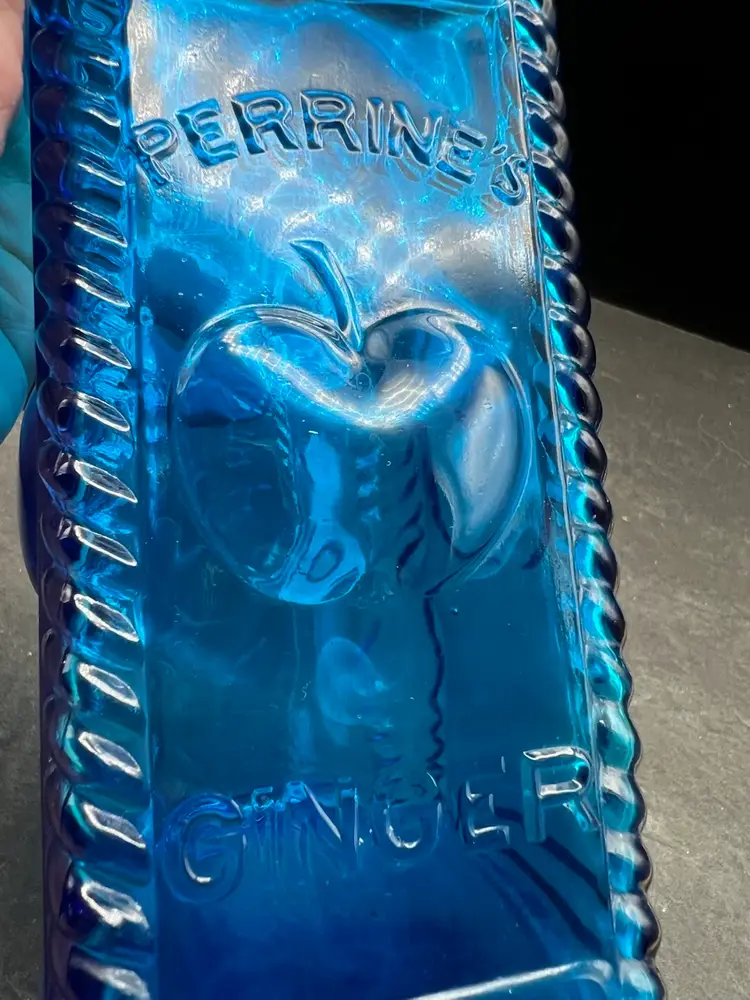 Vintage Perrine's Aqua Blue Embossed Apple Ginger Bitters Bottle, Log Cabin Series/Shape. Depot No37Nth Front Si Philada Just over 9" tall x 3"x 3" Beautiful vintage piece in excellent condition