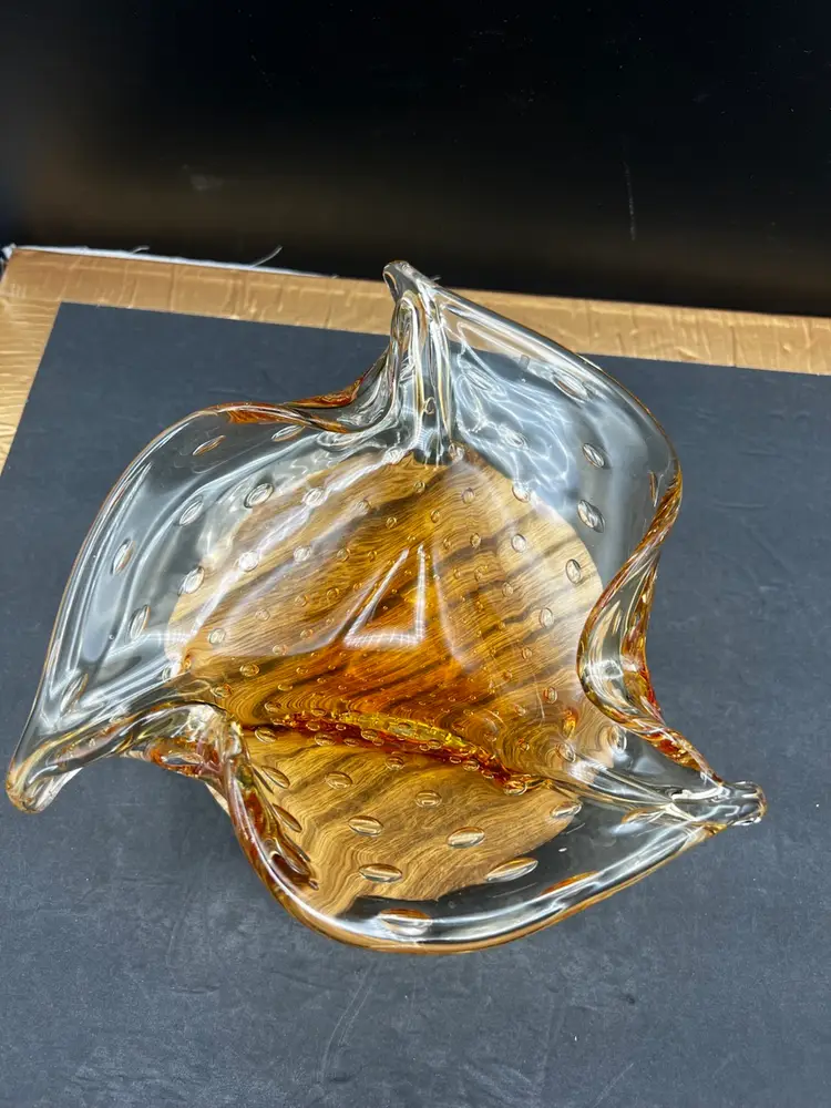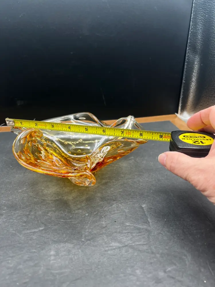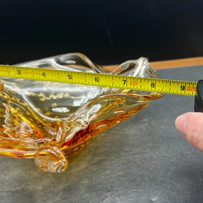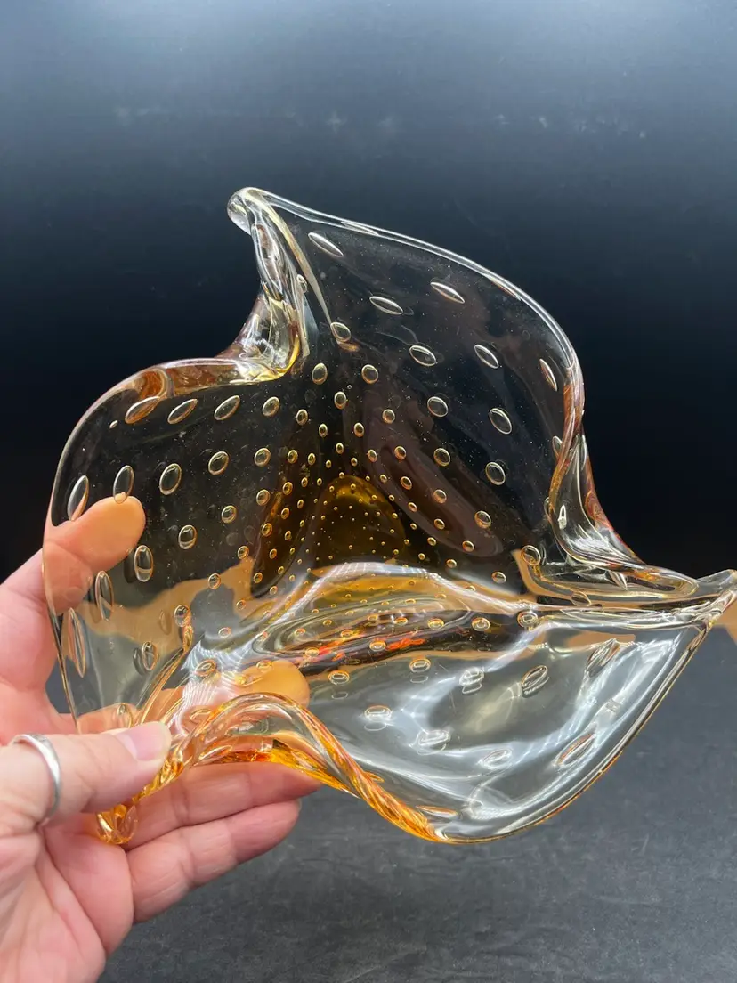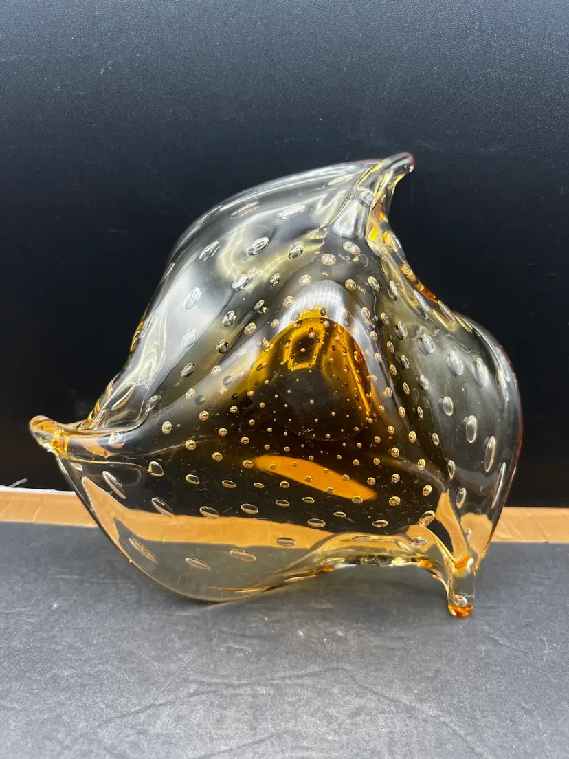#527B Vintage Art Glass Amber/Yellow/Gold Folded Triangular Bowl/Ashtray with Controlled bubbles In very good condition no chips or cracks 2 3/4” tall x 8 1/4” wide