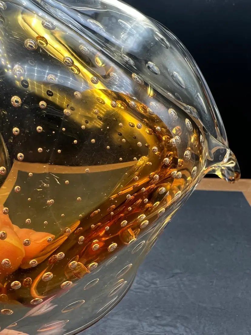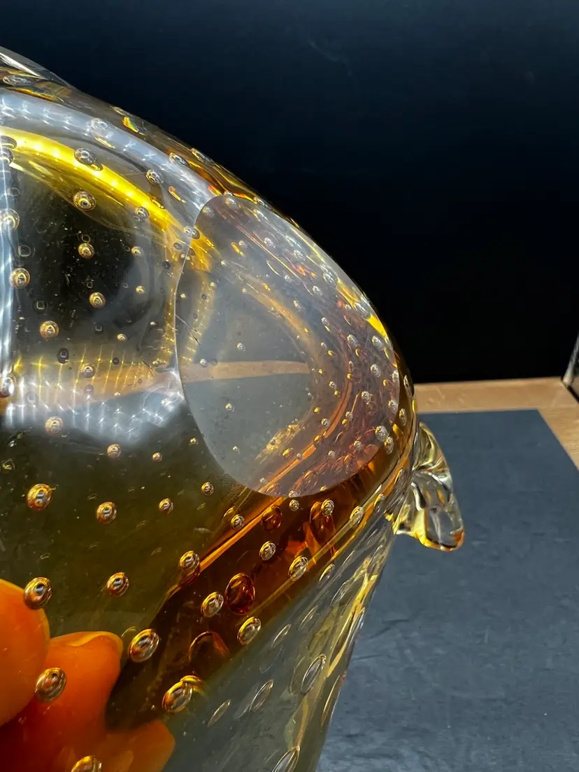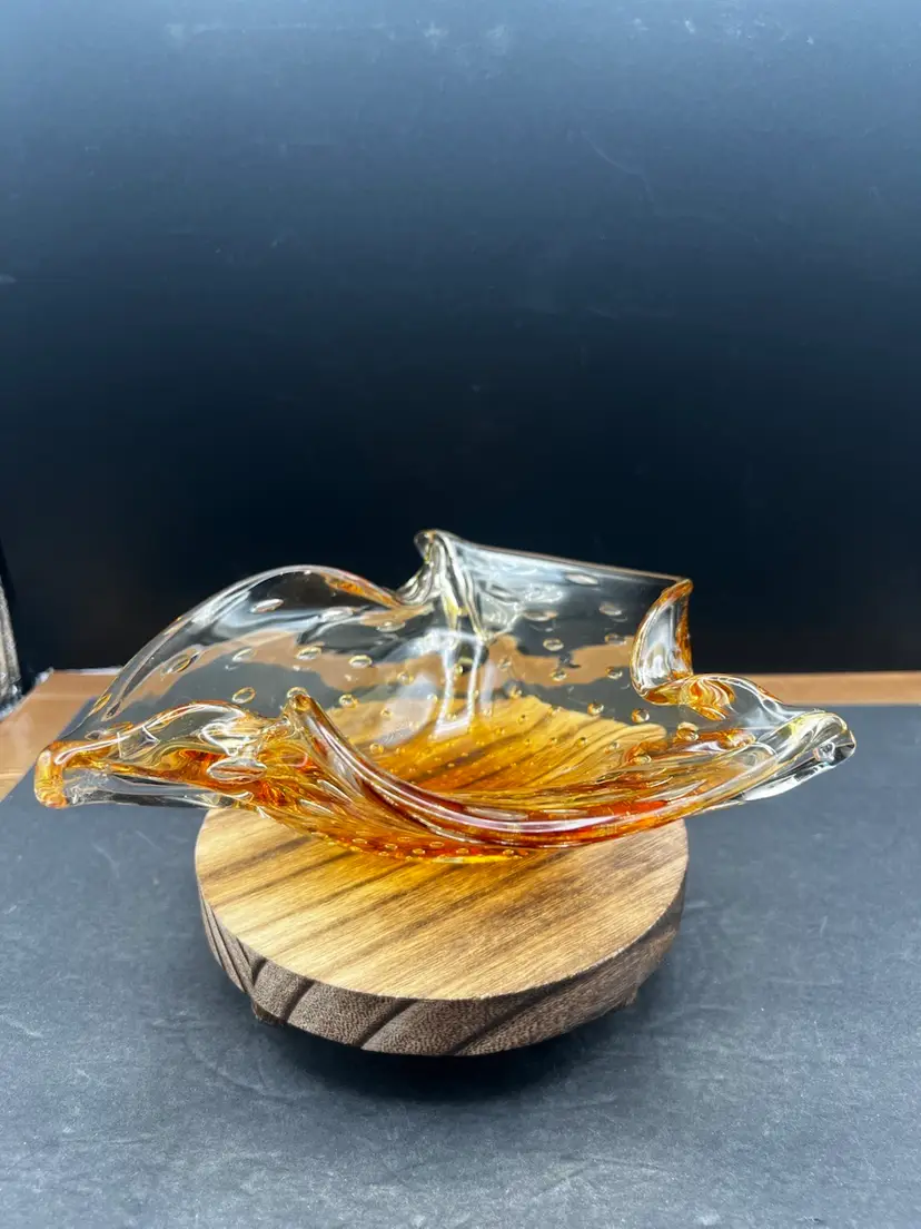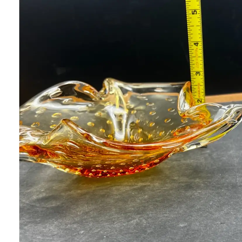 #527B Vintage Art Glass Amber/Yellow/Gold Folded Triangular Bowl/Ashtray with Controlled bubbles In very good condition no chips or cracks 2 3/4” tall x 8 1/4” wide