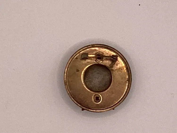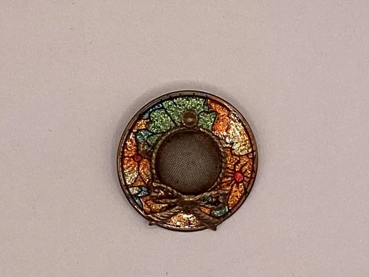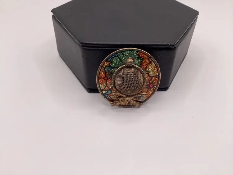 Brand: Unknown Features: Hat with mesh center / Enamel brim with flowers / Bow / C clasp Material: Metal Color: Multicolor Measurements: Diameter - 1 & 1/2”