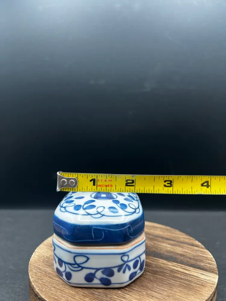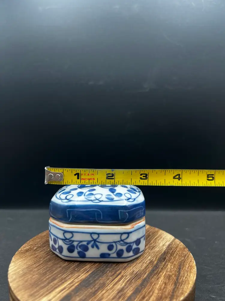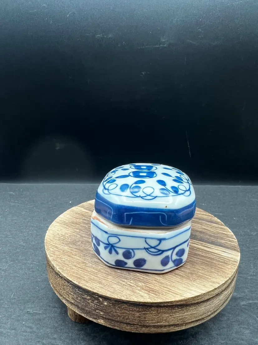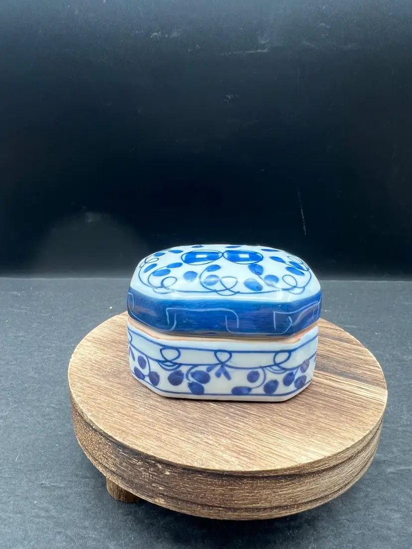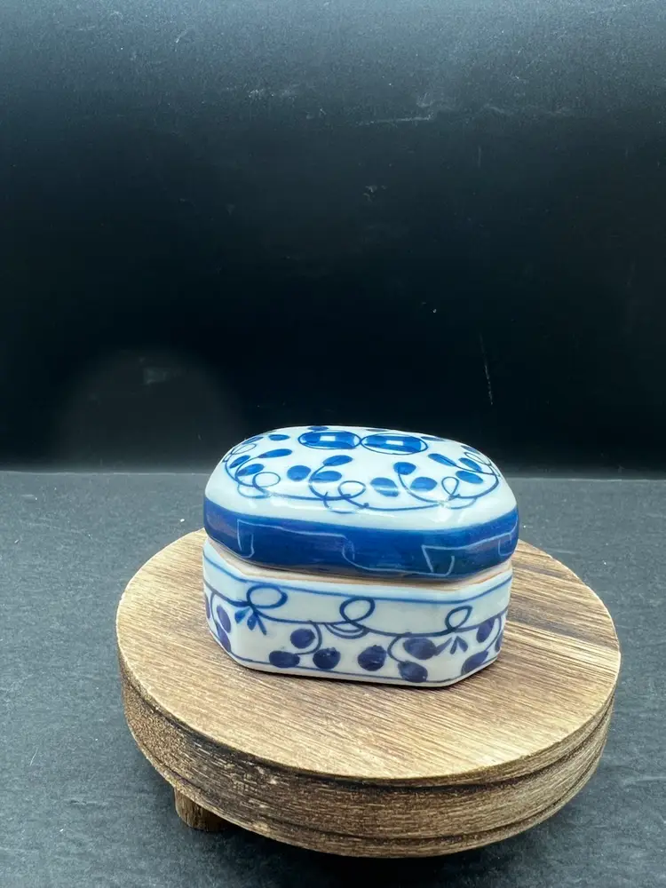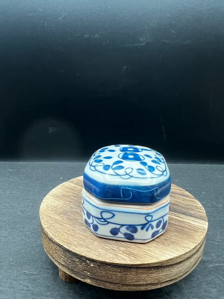 Vintage Pottery Octagonal Shape Lidded Trinket Box. Blue & White. In good condition, no chips or cracks 1 3/4” tall x 2” x 3”