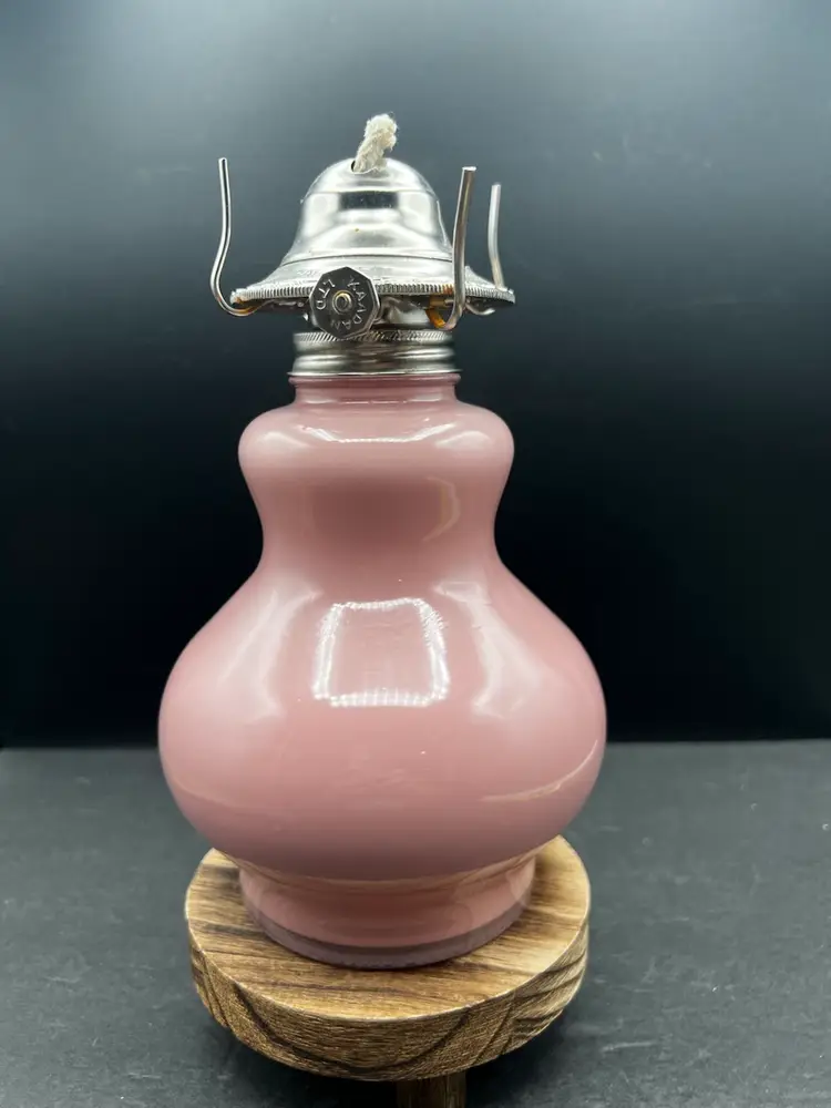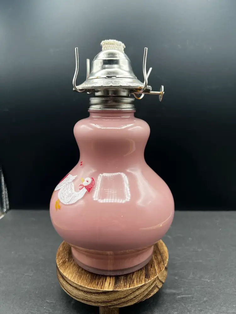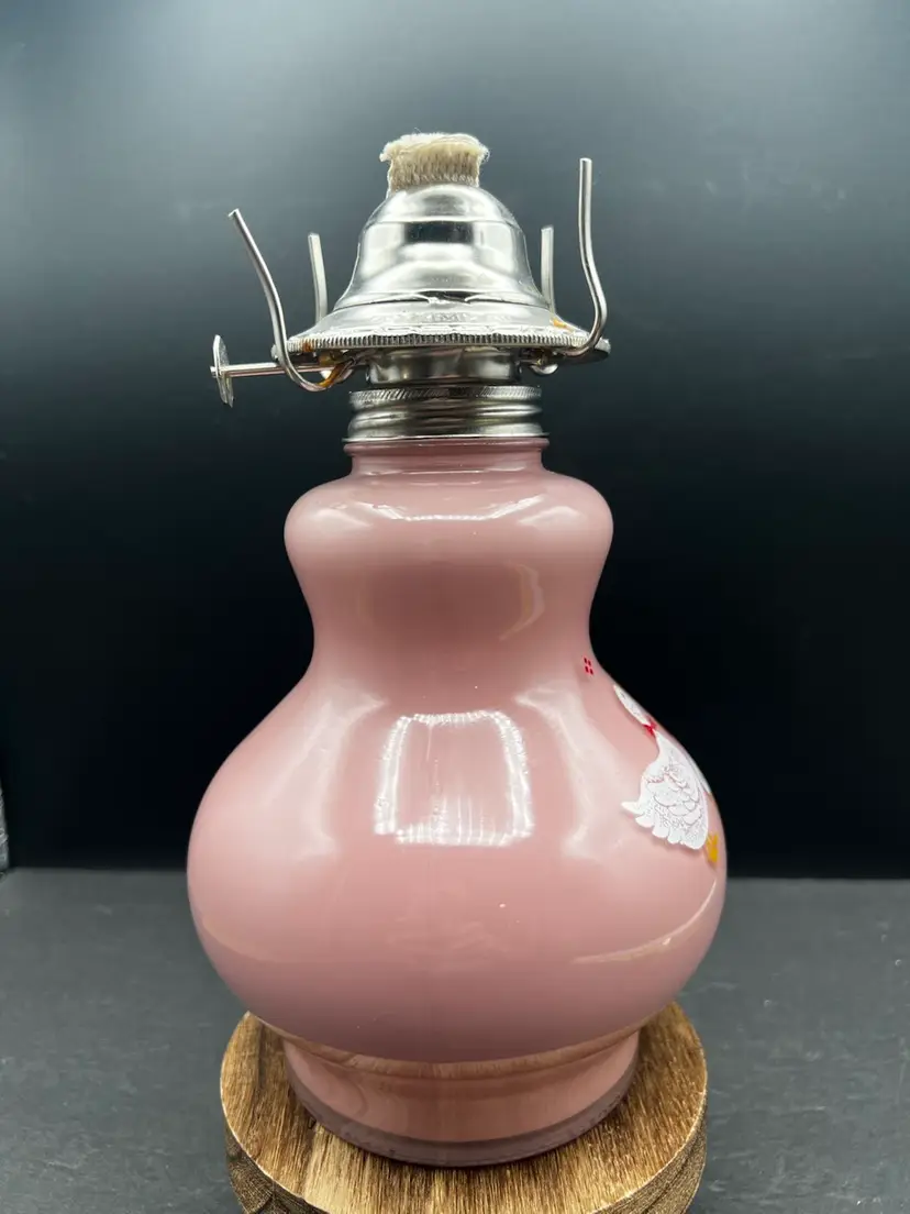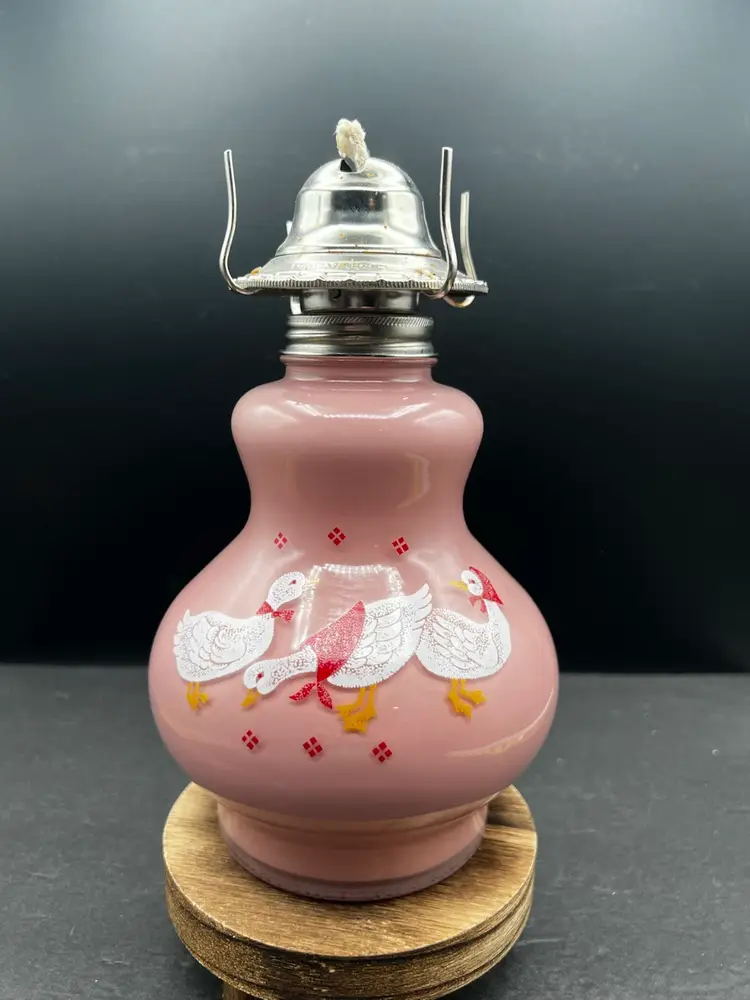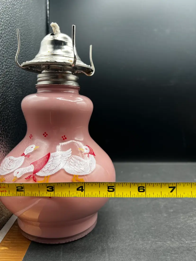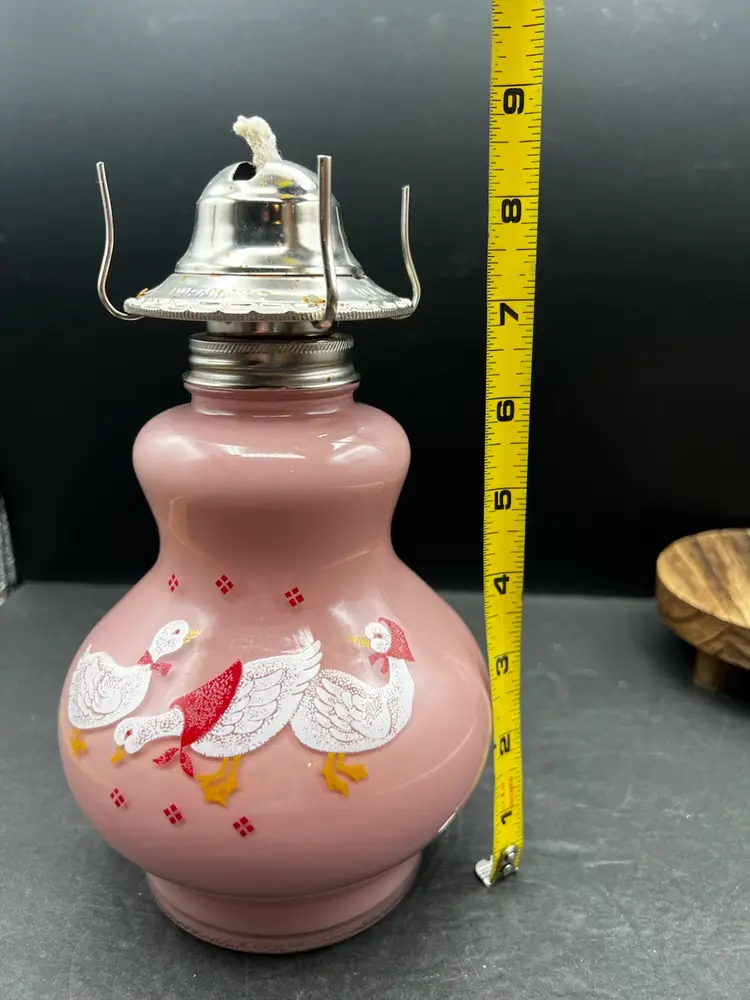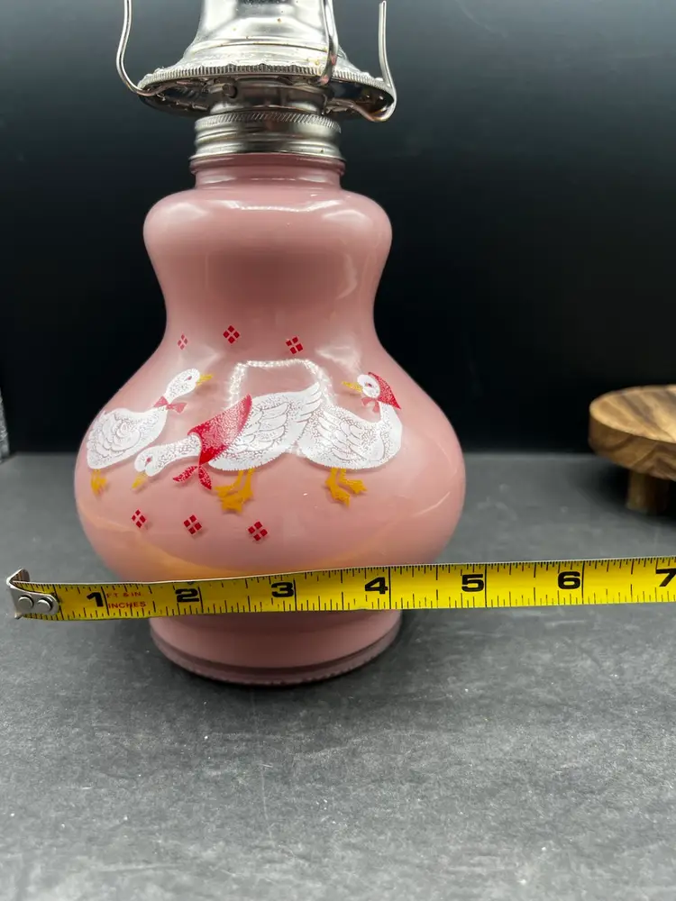 Vintage 1980’s Kaadan Ltd Glass Oil Lamp In Dusty Pink With Reverse Painted Ducks/Geese In very good condition Does not have the hurricane shade 8 1/2” tall x 5” in diameter