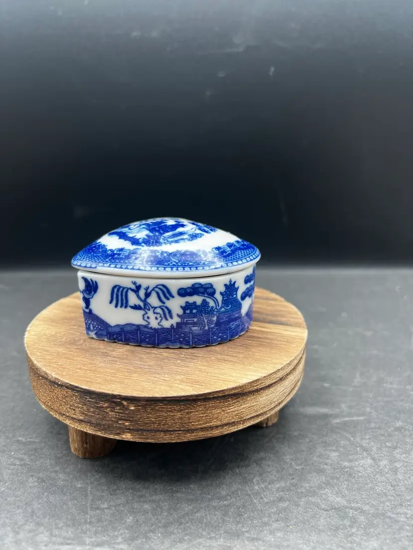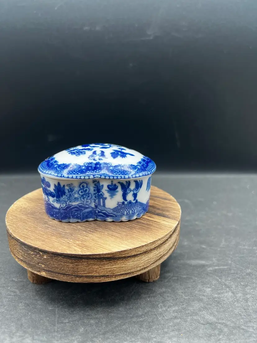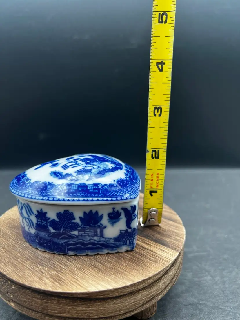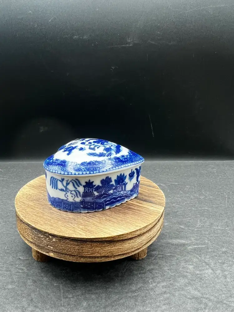 Vintage Porcelain Heart Shape Trinket Box. Blue & White. The Tale of the Heike Love Story Scene Made In Japan In very good condition, no chips or cracks 1 3/4” tall x 3” x 3”