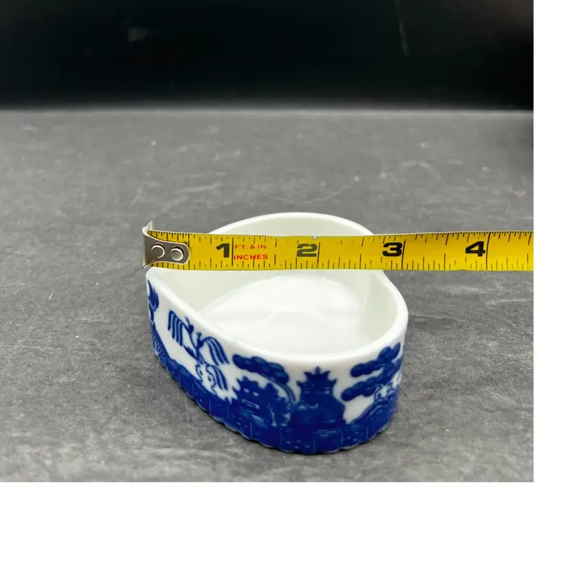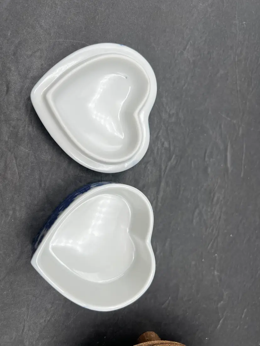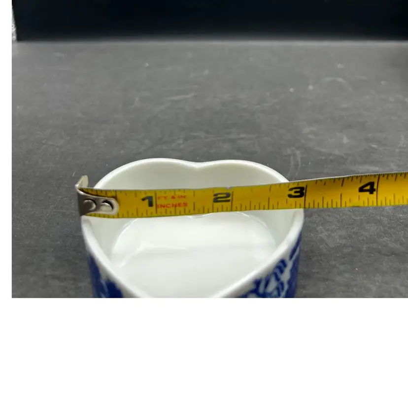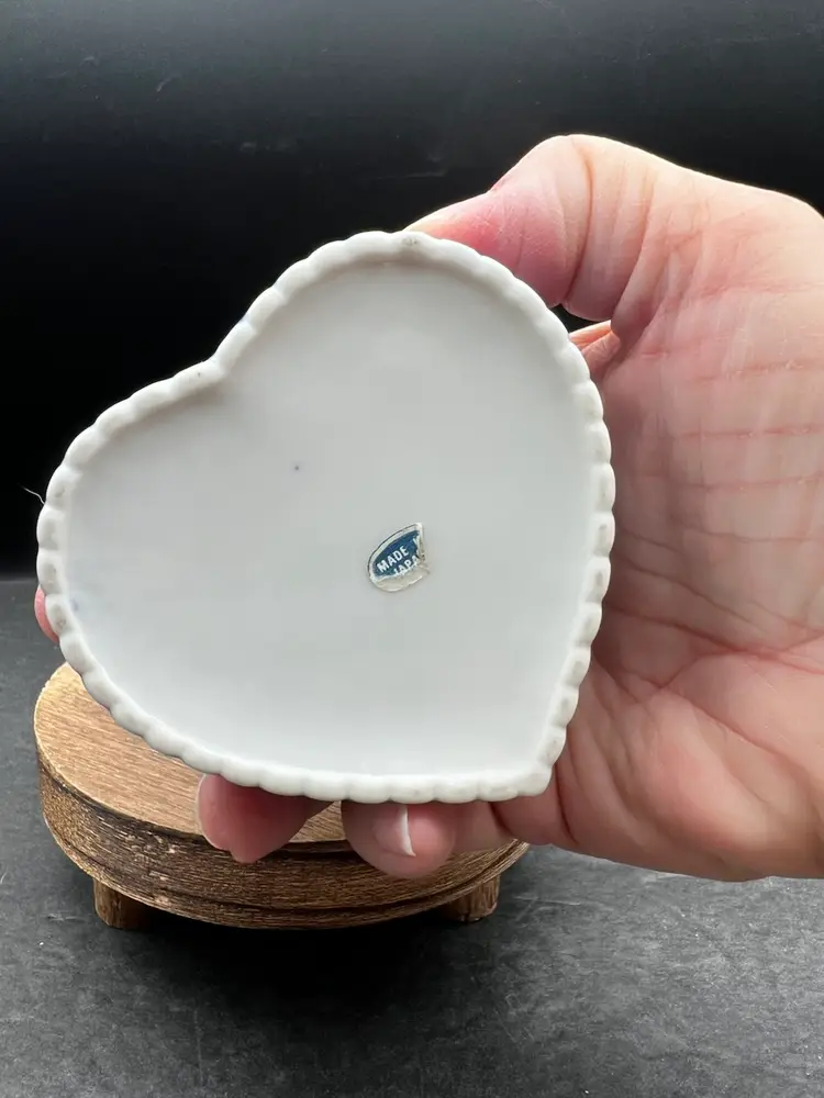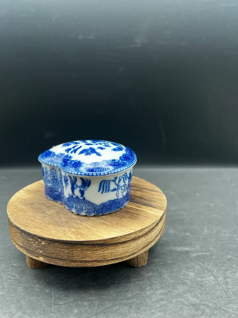 Vintage Porcelain Heart Shape Trinket Box. Blue & White. The Tale of the Heike Love Story Scene Made In Japan In very good condition, no chips or cracks 1 3/4” tall x 3” x 3”
