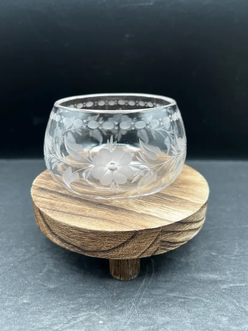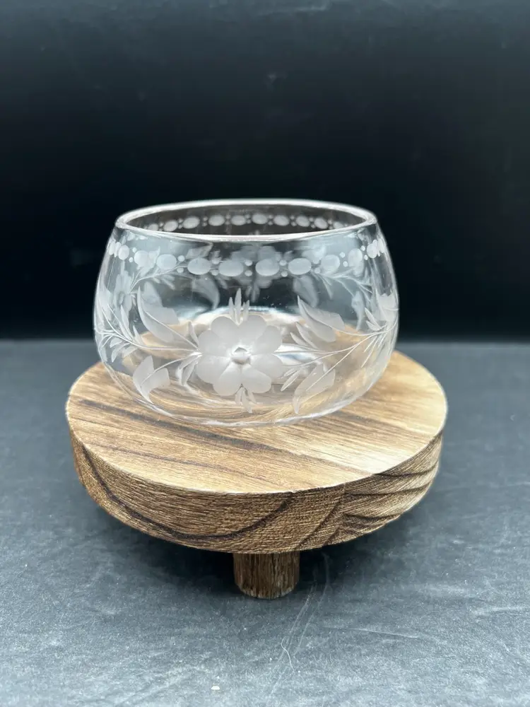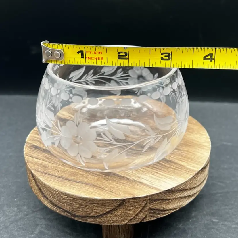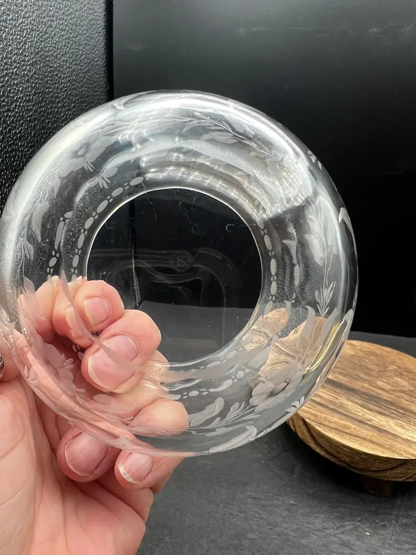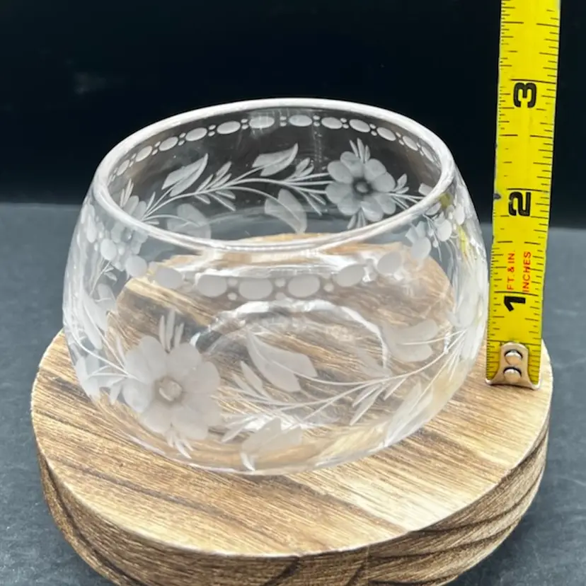 Vintage Floral Etched Clear Votive Holder. Marked With An S On Bottom. Very Pretty, Old And Has a Manganese Glow Unknown maker Good vintage condition, no chips or cracks, some surface scratches on bottom 2 1/2” tall x 3 1/2” in diameter, 3” at rim